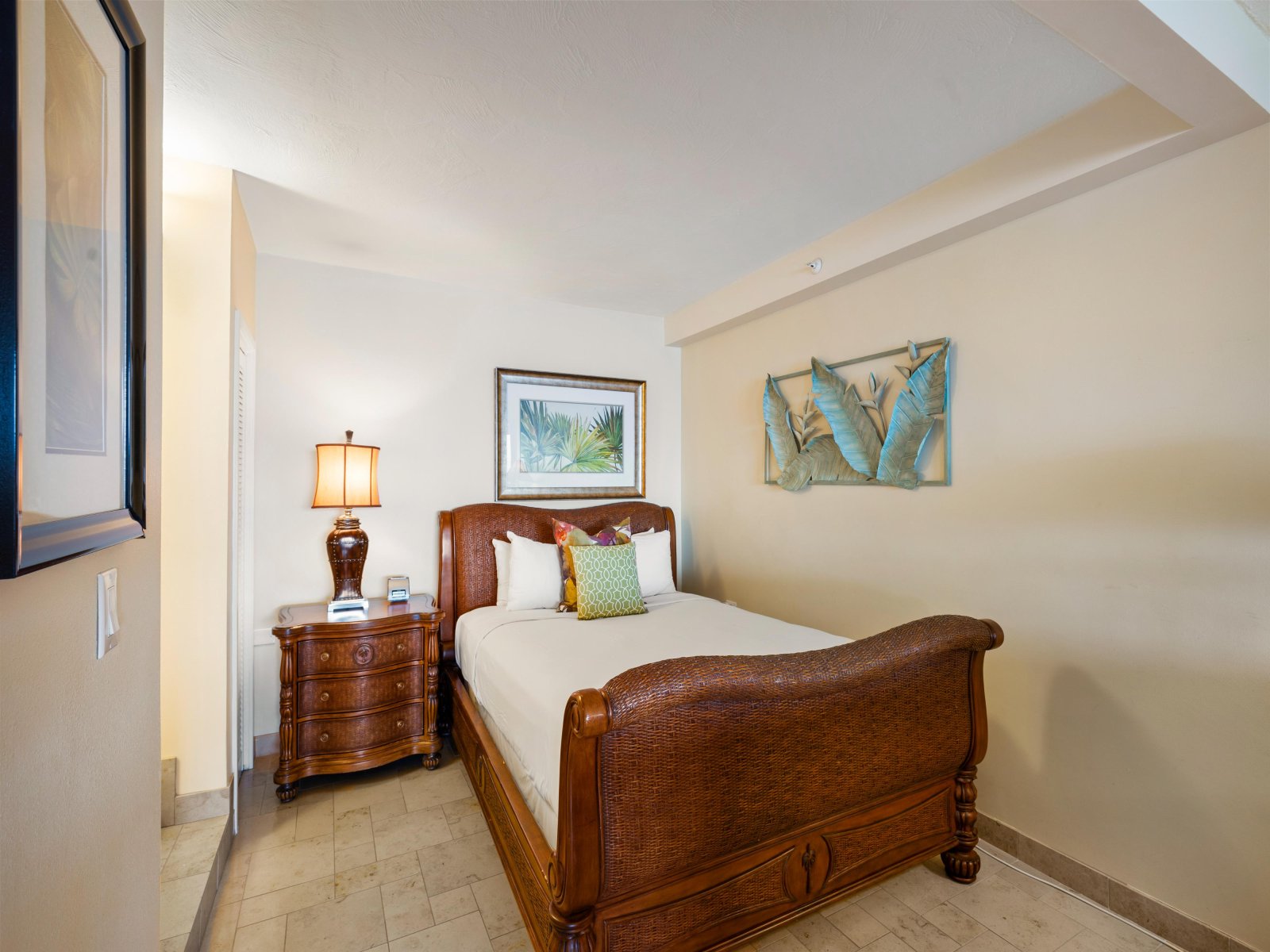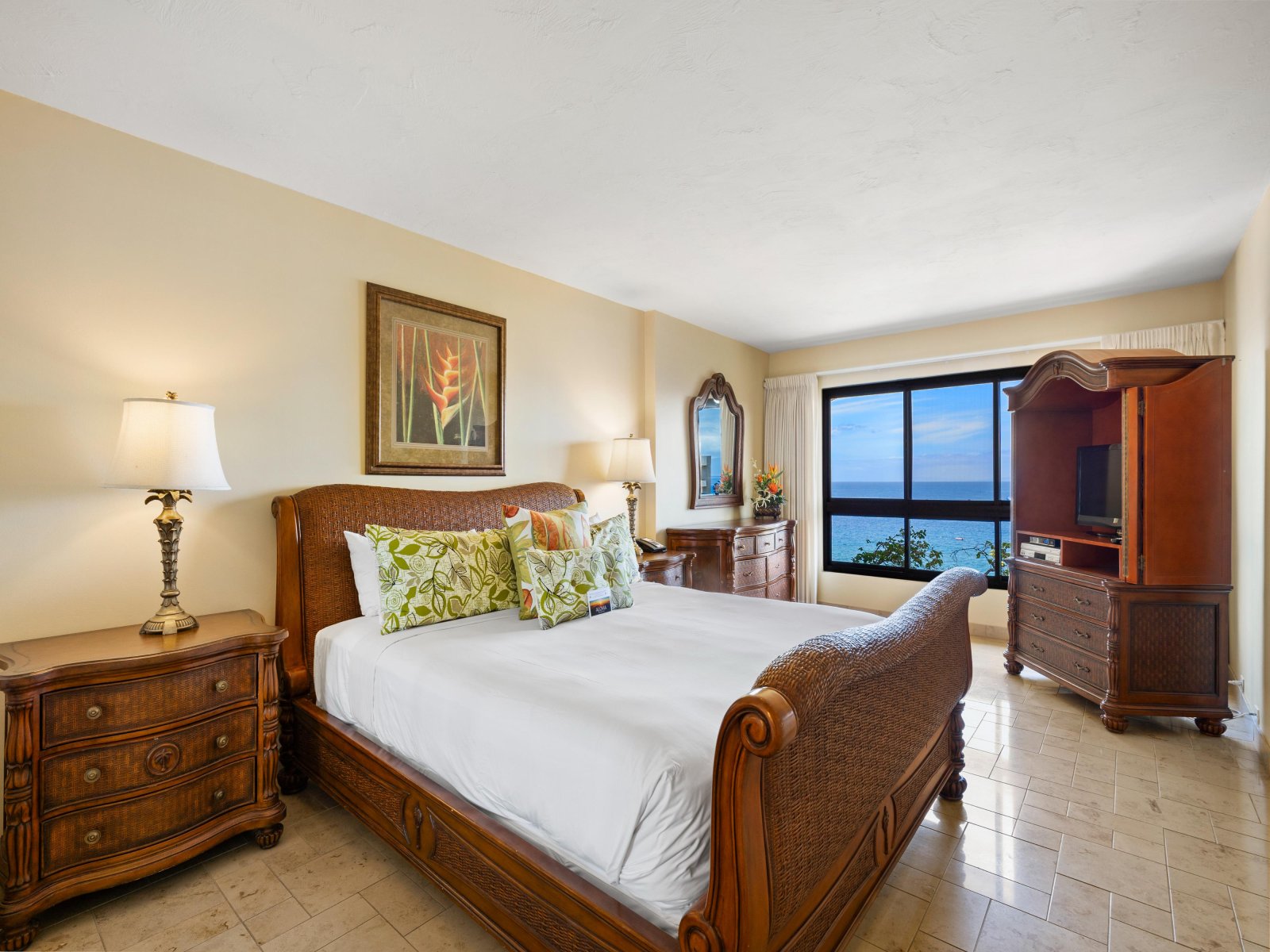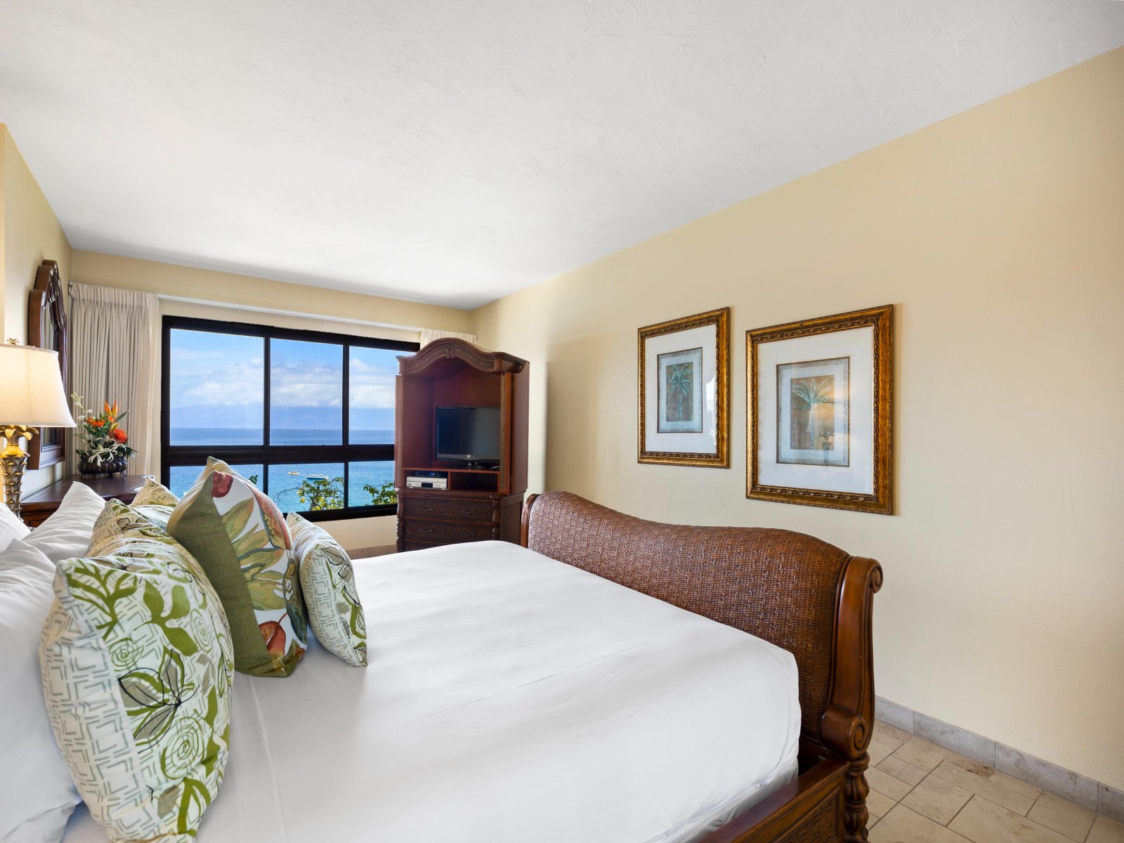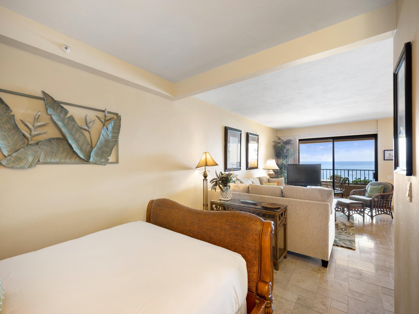 The open living area is both stylish and comfortable, ideal for relaxing after a day at the beach. Thoughtful furnishings and warm island accents create an inviting atmosphere, while the ocean views remain the focal point throughout. The seamless indoor-outdoor flow encourages guests to move easily between the living space and the lanai.Sleeping Accommodations | Up to 4 Guests