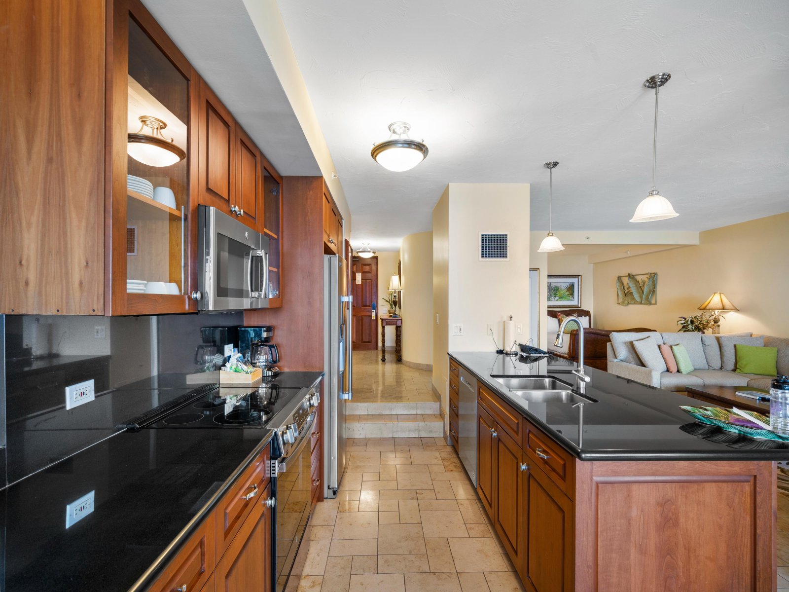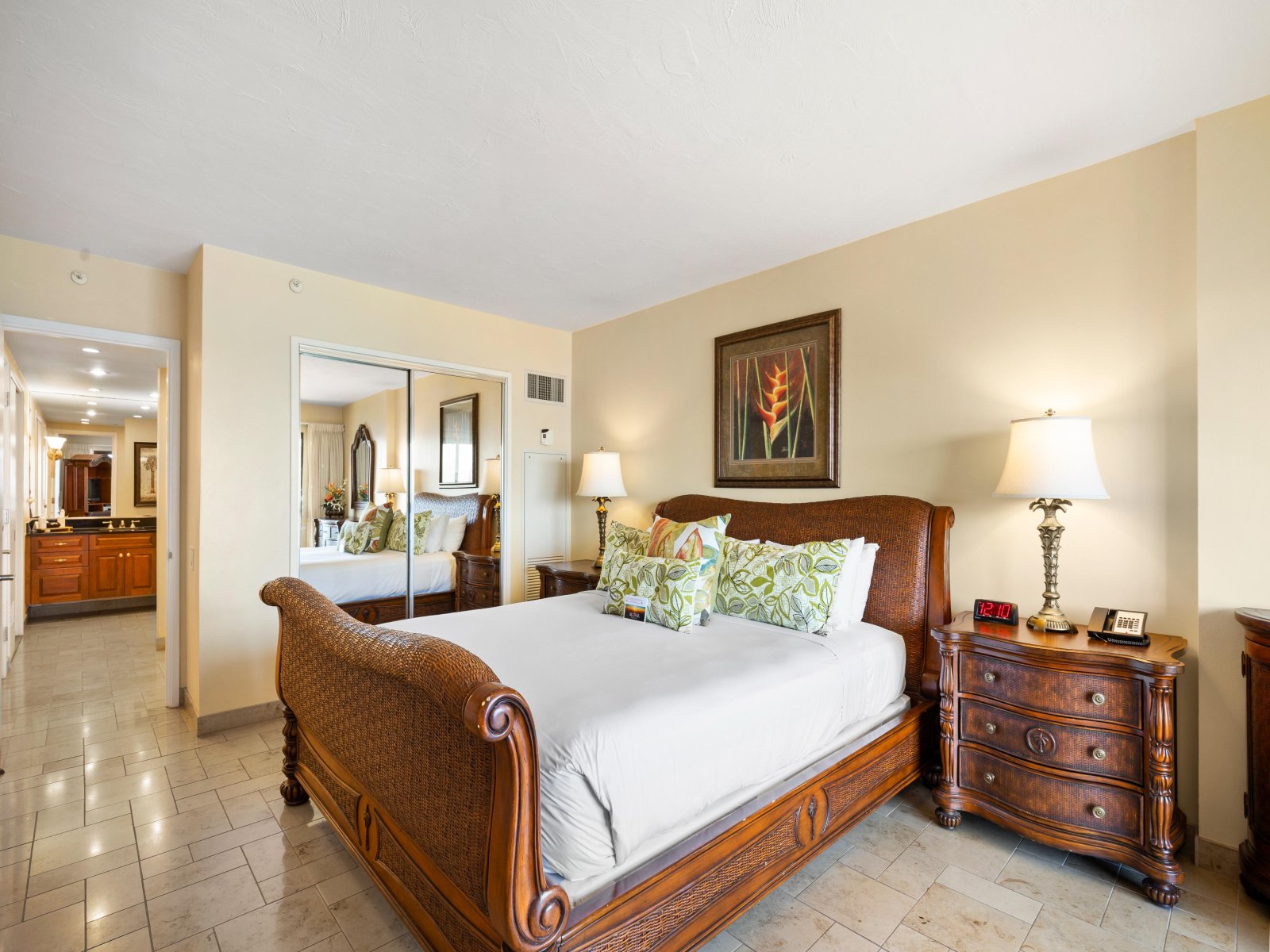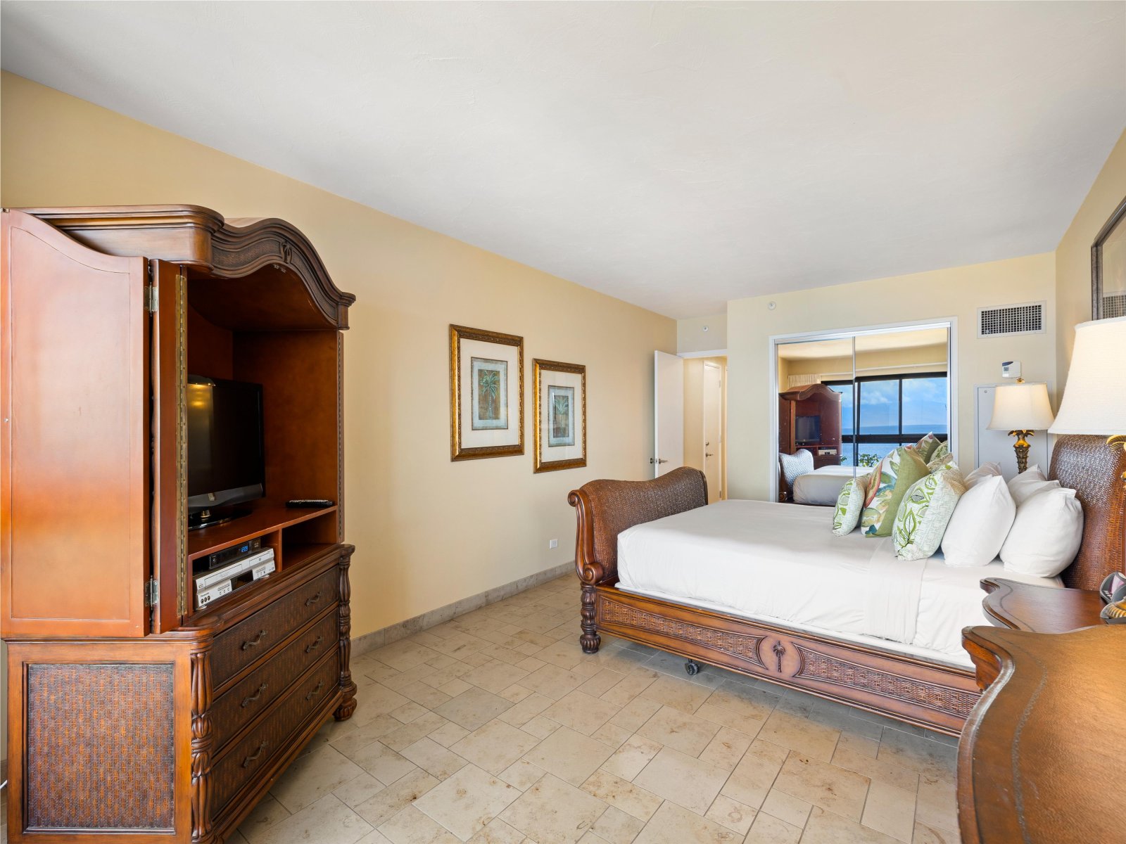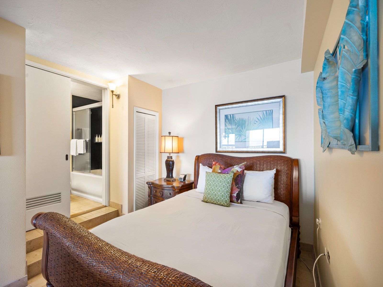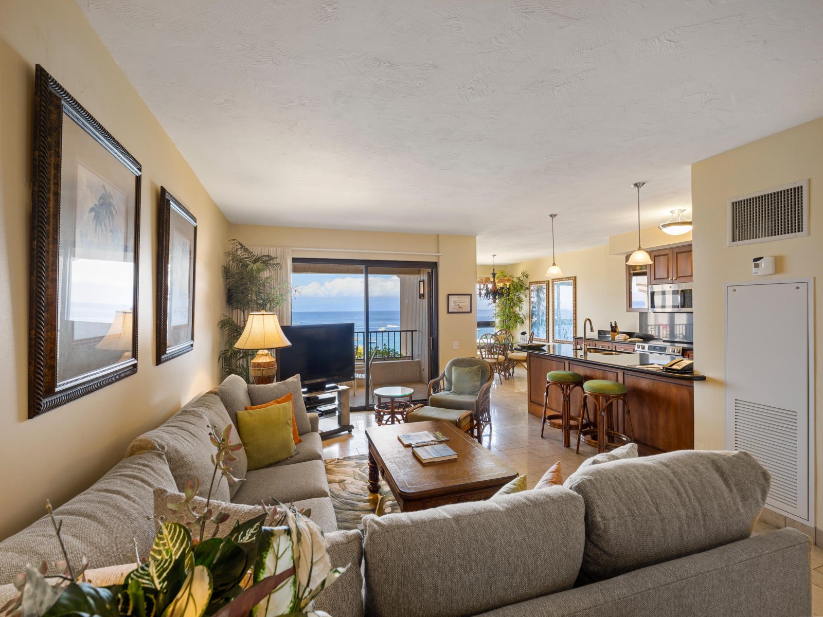 The open living area is both stylish and comfortable, ideal for relaxing after a day at the beach. Thoughtful furnishings and warm island accents create an inviting atmosphere, while the ocean views remain the focal point throughout. The seamless indoor-outdoor flow encourages guests to move easily between the living space and the lanai.Sleeping Accommodations | Up to 4 Guests