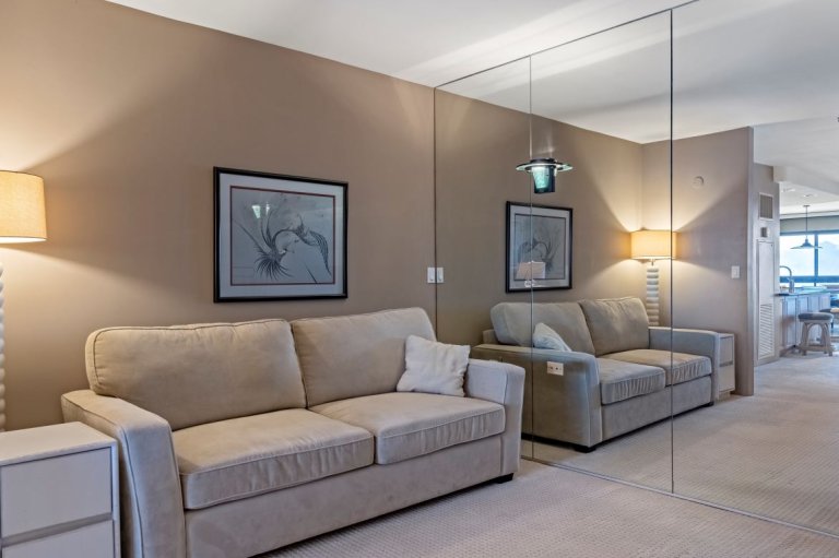 The expansive living area is thoughtfully arranged for comfort and connection, ideal for unwinding after a day at the beach or sharing time with family and friends. Clean lines, updated finishes, and generous seating create a relaxed yet refined environment. Large sliding doors open to the lanai, allowing ocean breezes and natural light to flow freely through the space.Sleeping Accommodations | Up to 6 Guests