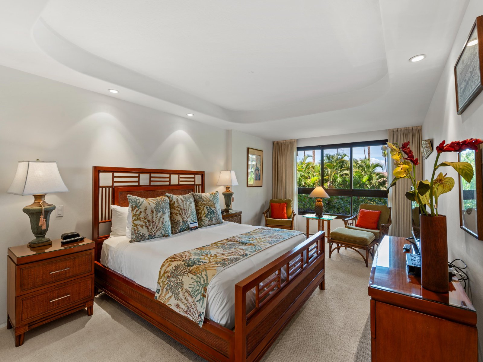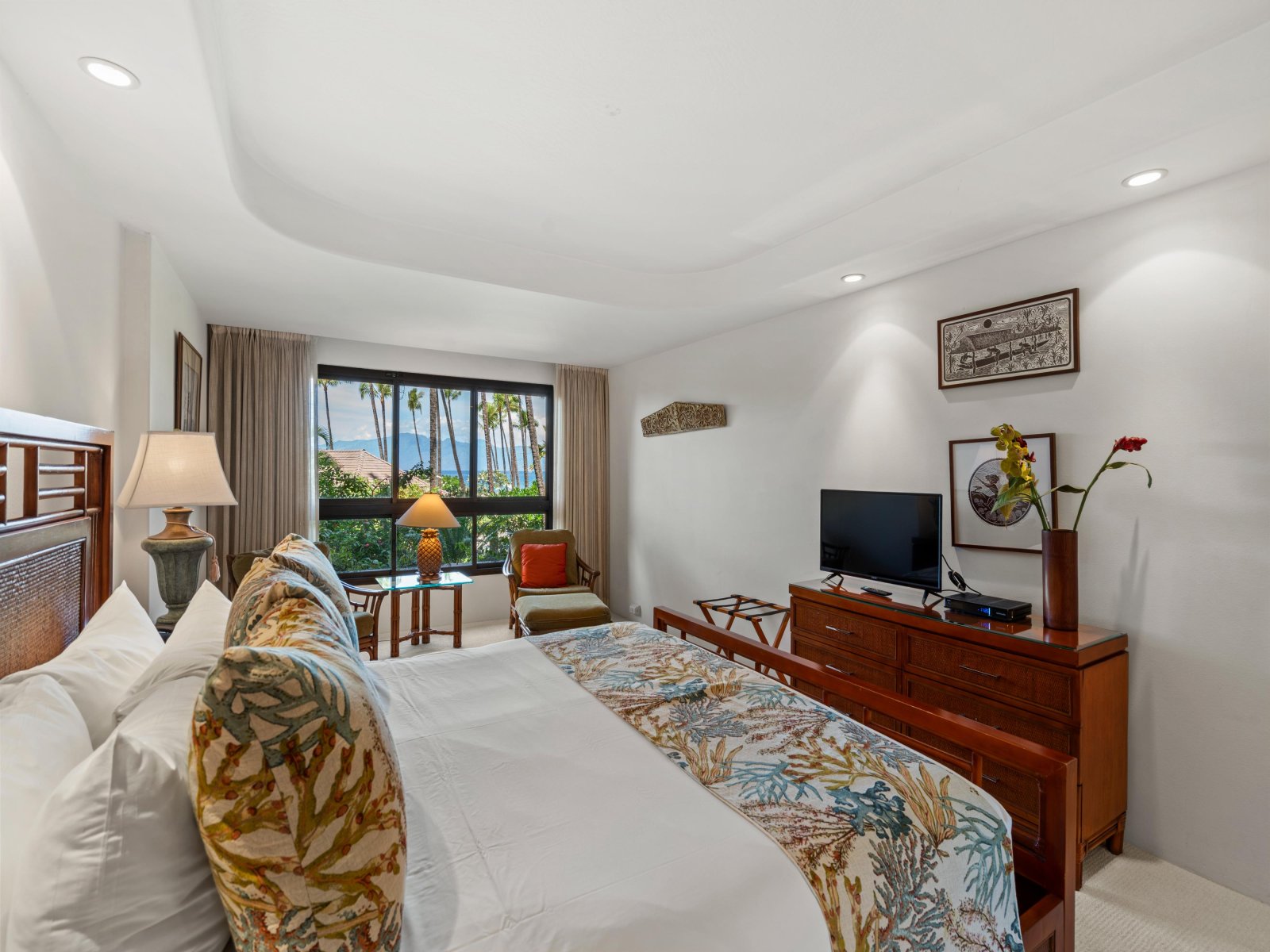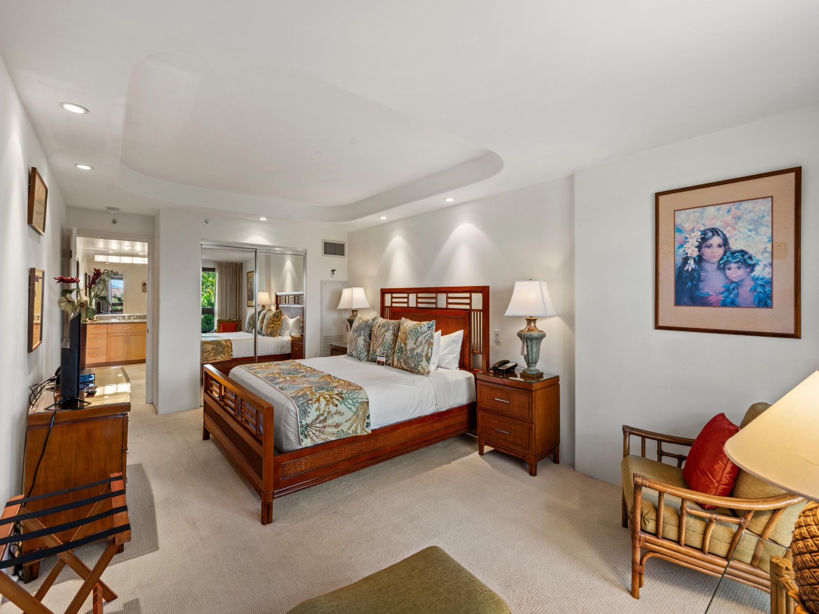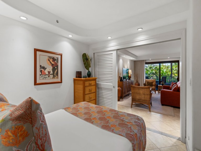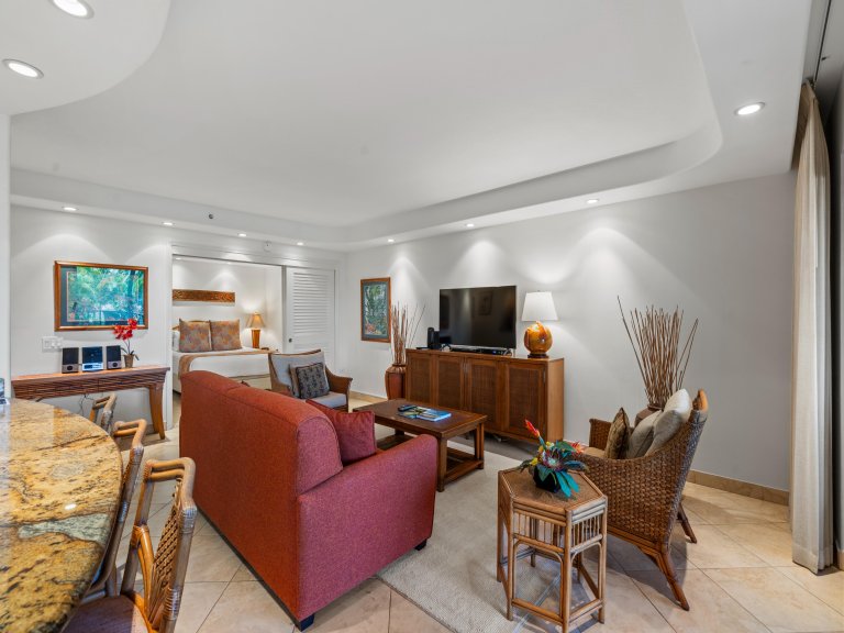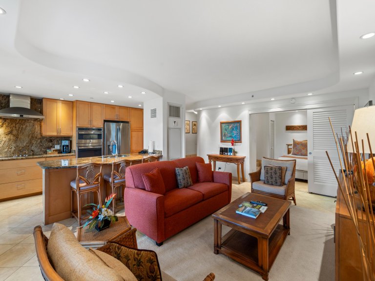 The open living area is airy and welcoming, featuring comfortable seating and tasteful Hawaiian décor that reflects the surrounding tropical landscape. Light wood cabinetry and soft island tones enhance the sense of calm, creating an ideal space to relax after a day at the beach or gather with family and friends.Sleeping Accommodations | Up to 6 Guests
