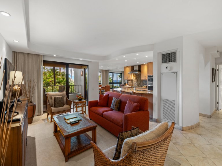 The private lanai is furnished with lounge seating and a table, offering a peaceful outdoor extension of the living space. From here, guests can enjoy garden and resort views while being just moments from the pools and Kaʻanapali Beach.Residence Features