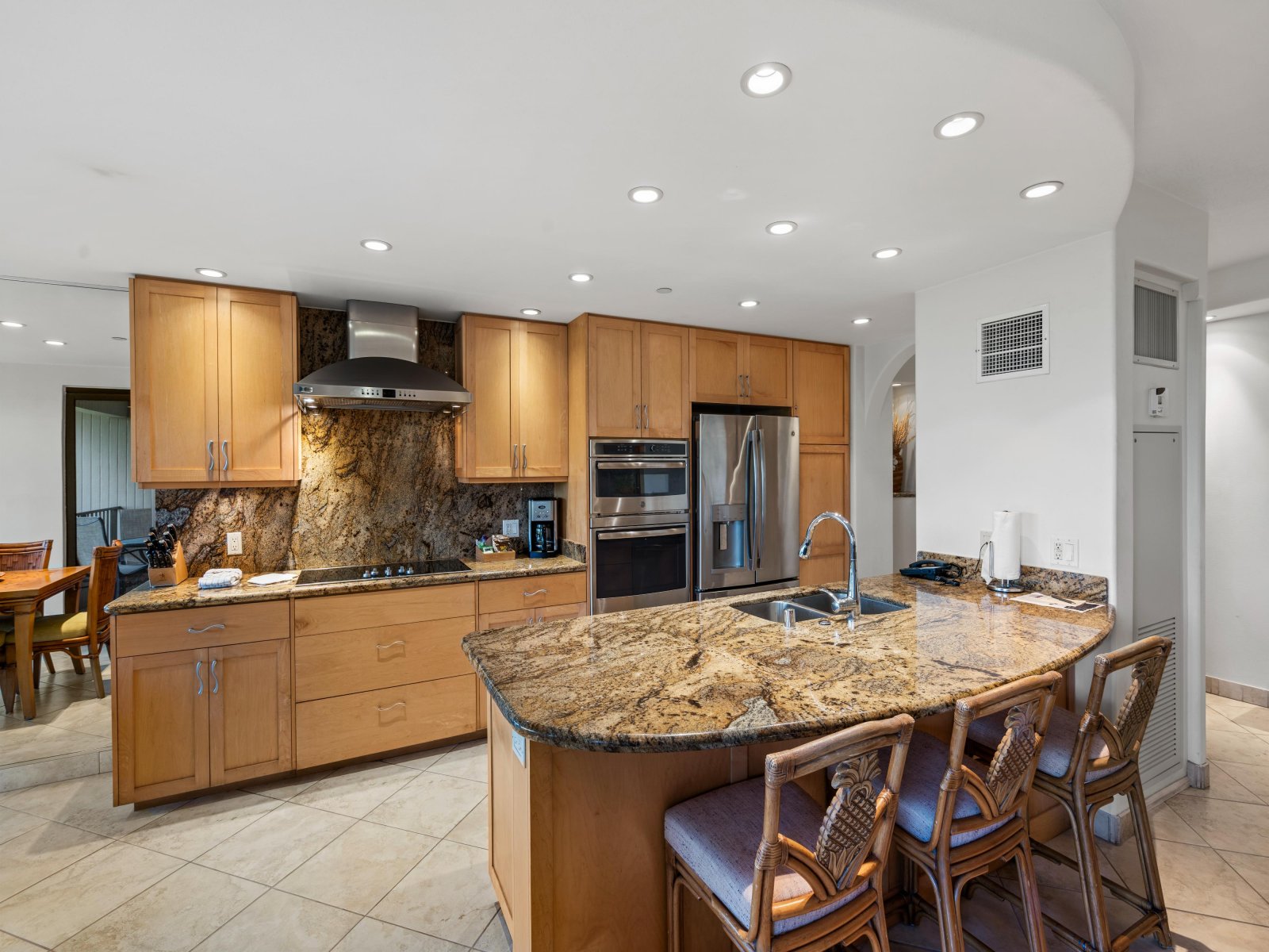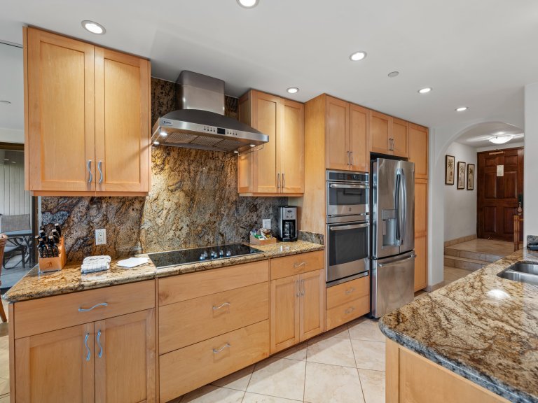 The fully equipped gourmet kitchen features stainless steel appliances, granite countertops, and bar seating for three. A dining table seating four offers a comfortable setting for shared meals, while the open layout allows easy conversation between the kitchen and living areas. A full-size washer and dryer add convenience for extended stays.Outdoor Living