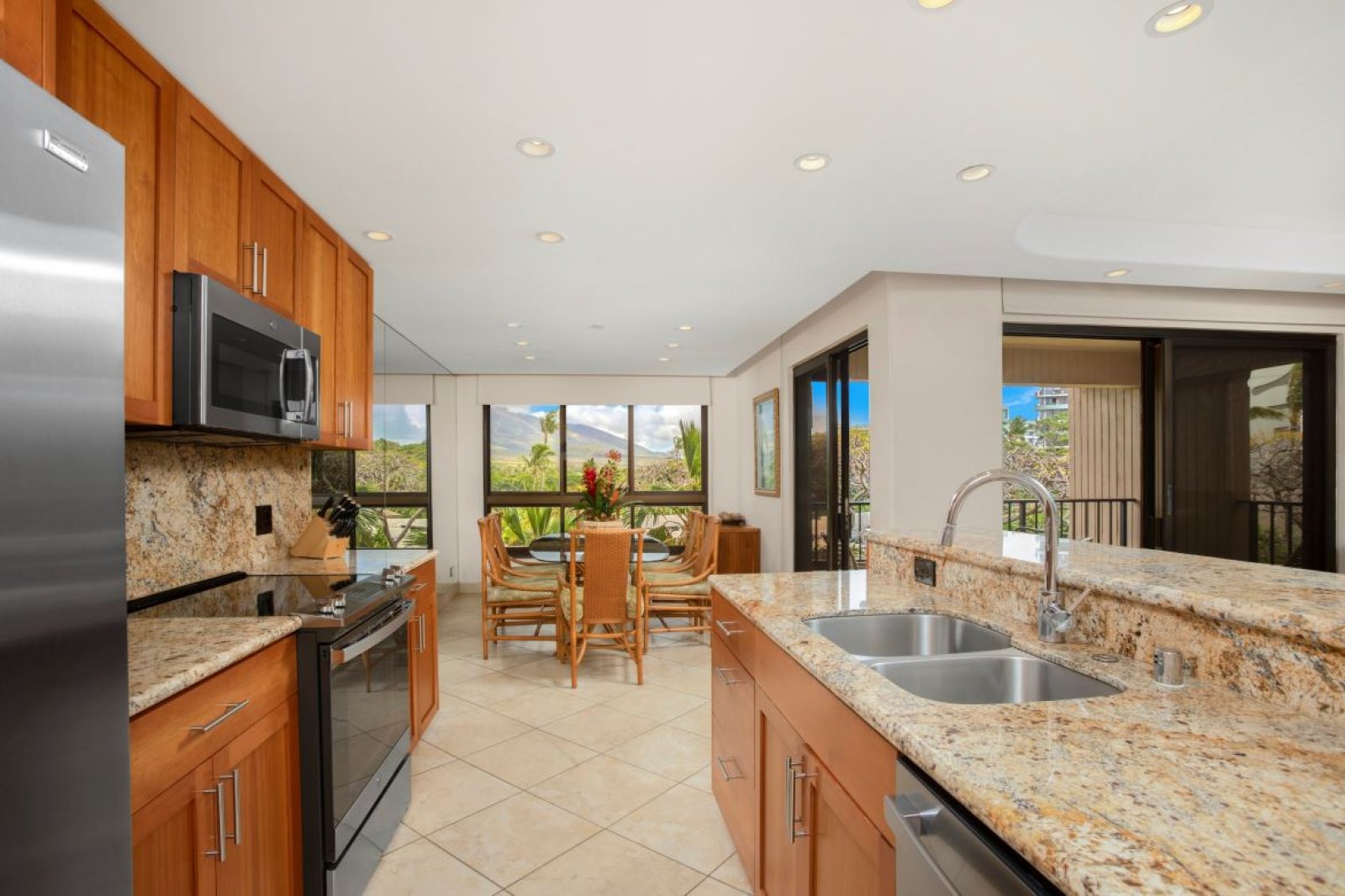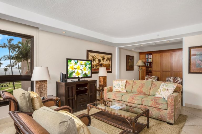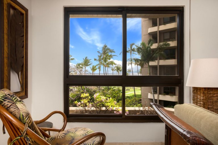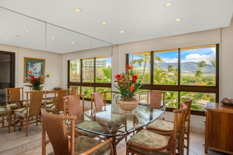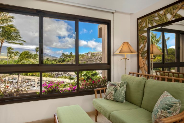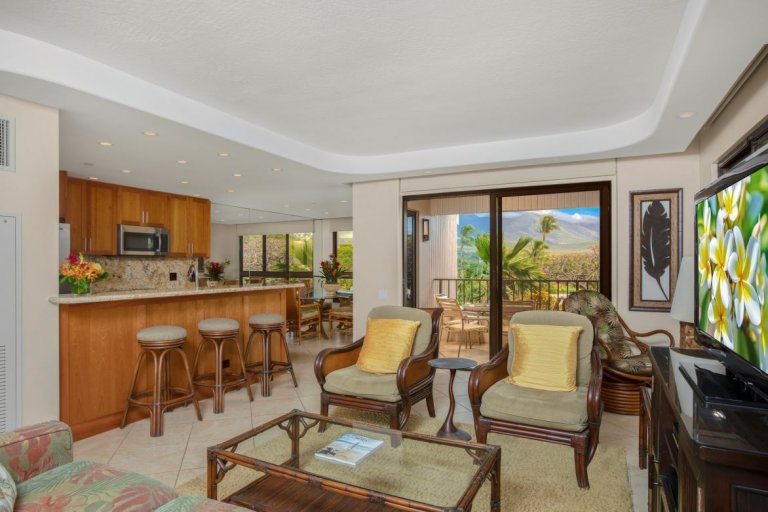 Residence 441 is an elegant garden-view vacation home located within the renowned Kaʻanapali Alii Resort. Situated on the fourth floor, this spacious residence offers approximately 1,544 square feet of thoughtfully designed living space with elevated views across lush tropical landscaping toward the West Maui Mountains. With a fully enclosed den that functions as a second bedroom, this residence delivers flexibility, comfort, and refined island living.Large windows fill the interiors with natural light and frame the surrounding greenery, creating a relaxed yet sophisticated atmosphere throughout. Central air conditioning ensures year-round comfort, while the open layout allows guests to enjoy both privacy and connection within the space.