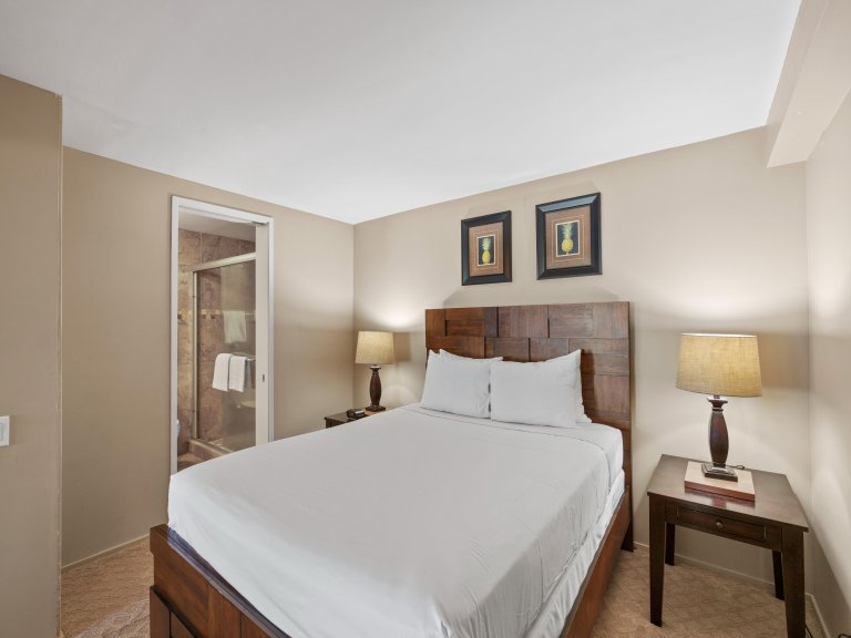 Fully enclosed with privacy doors and furnished with a queen bed, serving seamlessly as a second bedroom.