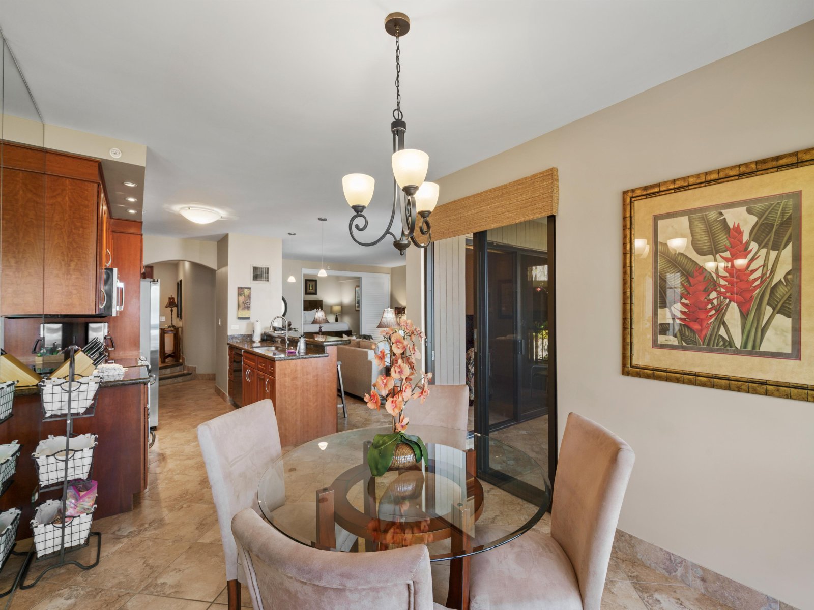 The fully stocked gourmet kitchen is equipped with high-end stainless steel appliances and ample counter space, making meal preparation simple and enjoyable. A dining table seating four offers an inviting place for casual meals or evening dining with ocean views nearby.Outdoor Living