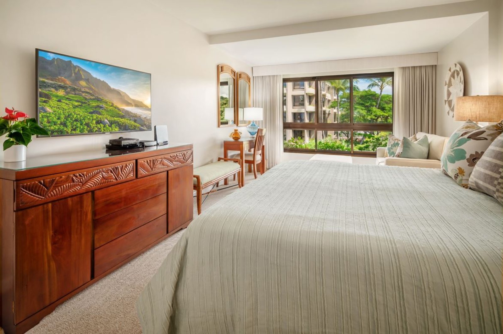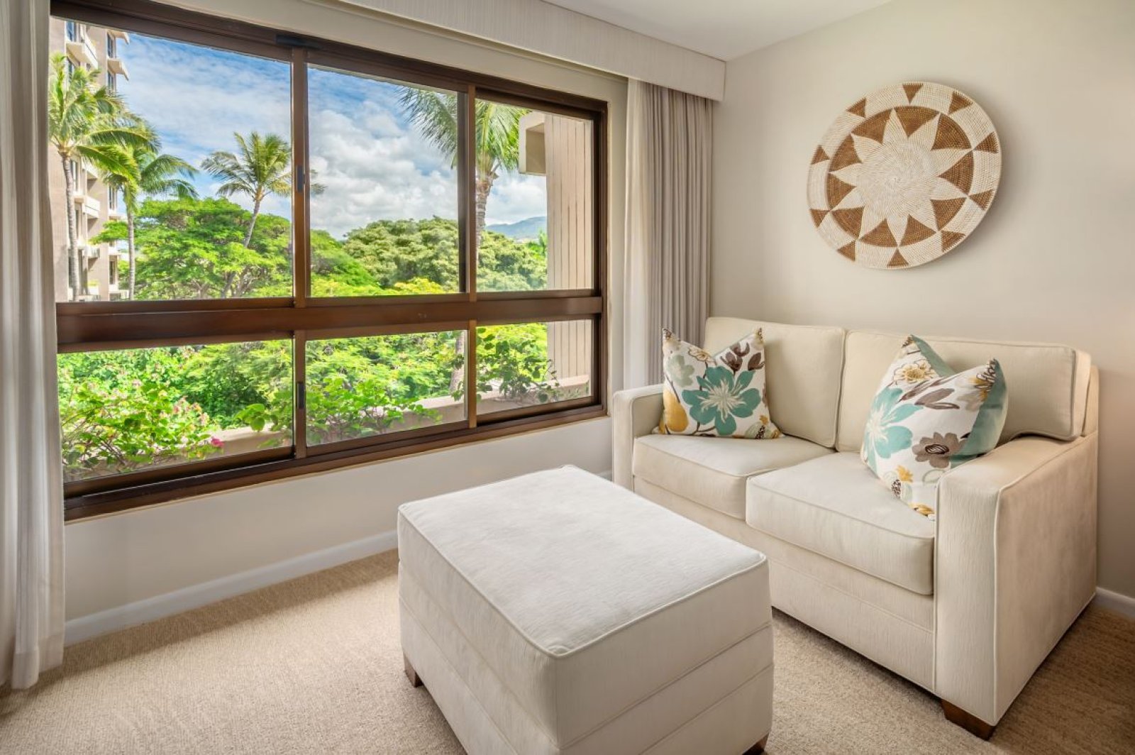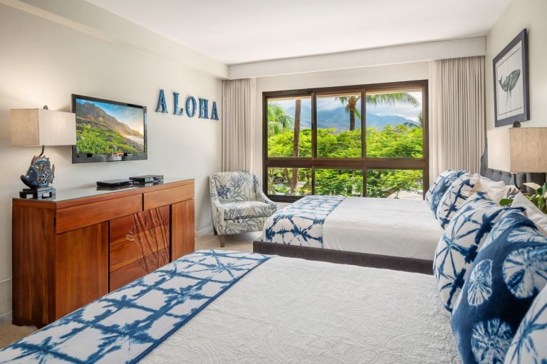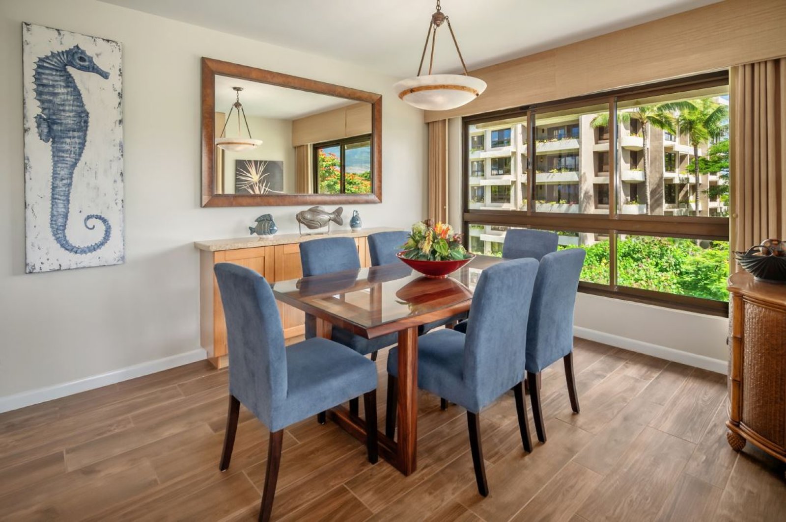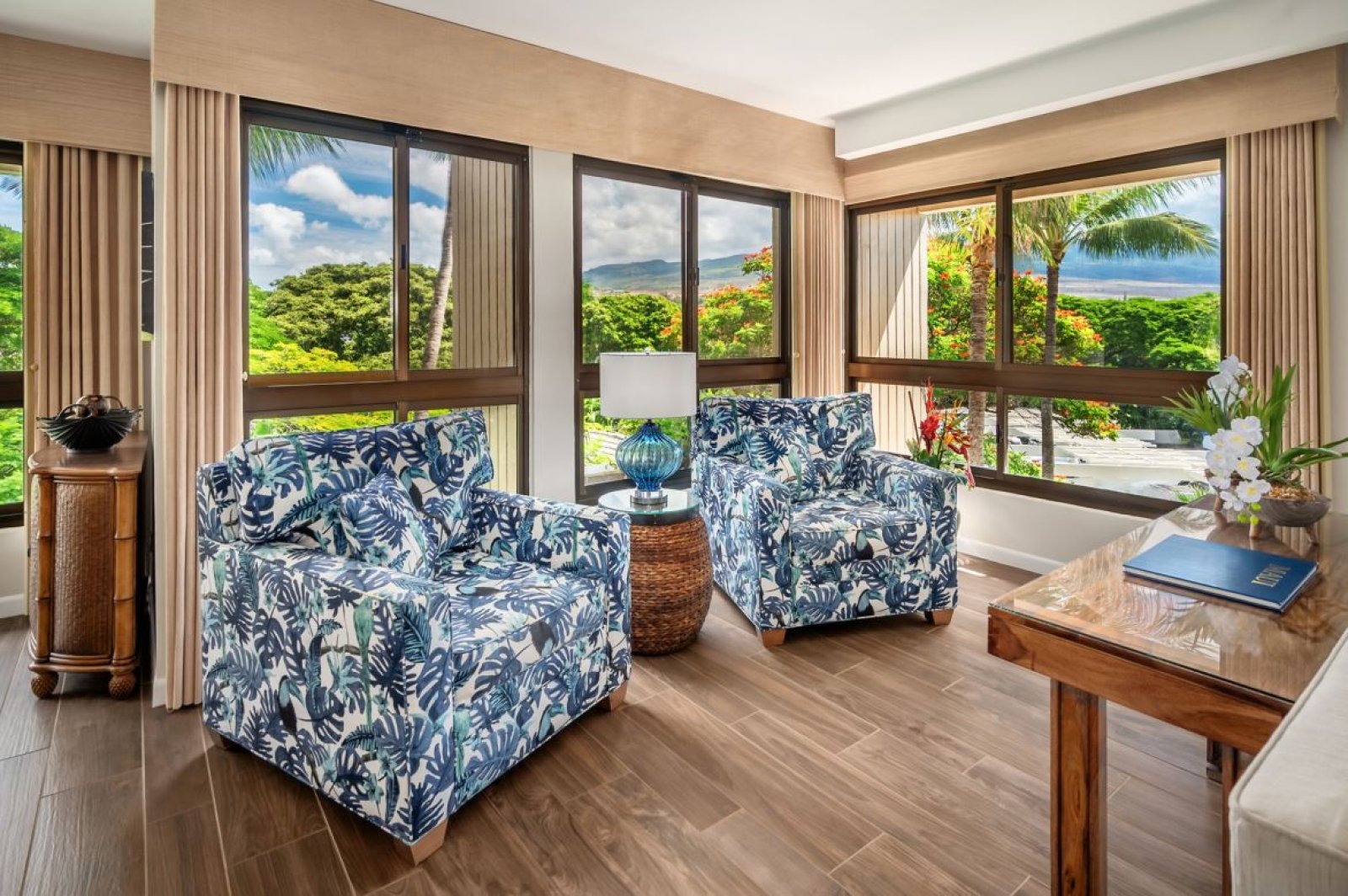 Residence 445 is a light-filled, two-bedroom garden-view retreat located just steps from the shoreline at the exclusive Kaʻanapali Alii Resort. Surrounded by lush tropical landscaping, this spacious residence offers a relaxed yet refined setting for an unforgettable Maui vacation. Modern finishes, warm wood and tile flooring, and thoughtfully selected furnishings create a welcoming home base near one of Hawaii’s most celebrated beaches.Natural light pours through expansive windows, while colorful garden views enhance the peaceful island ambiance. With generous living areas and an open layout, this residence is designed for both social gatherings and quiet moments of relaxation.