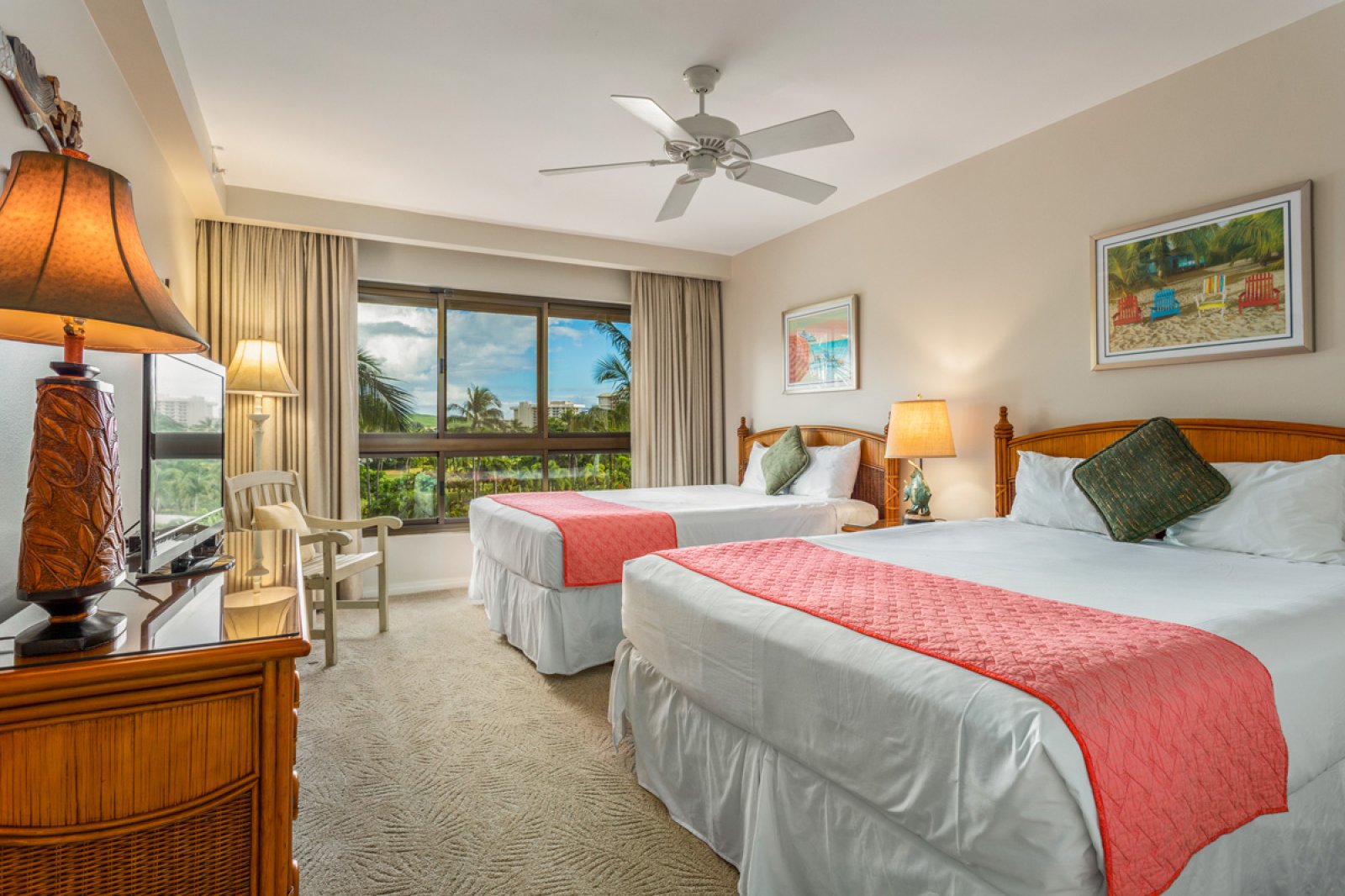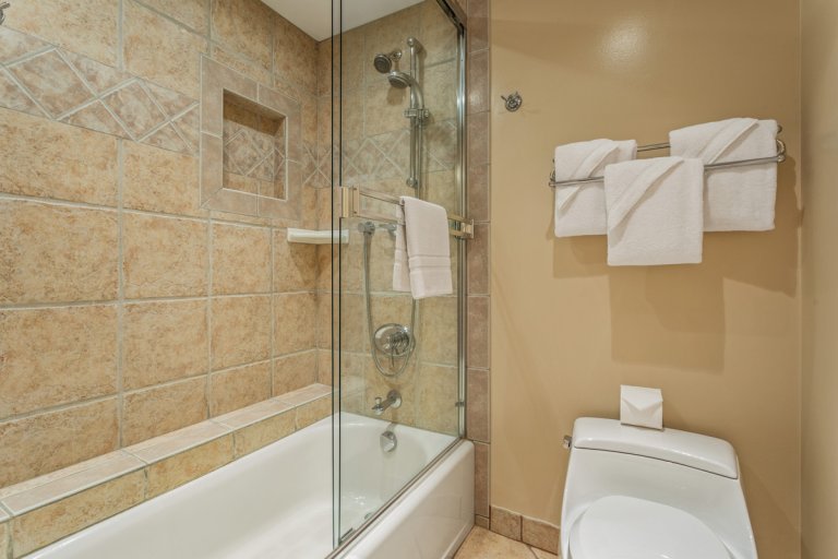 2 Bed: Full Beds • En-Suite Bath with Shower and Bathtub • TV • Ceiling Fan