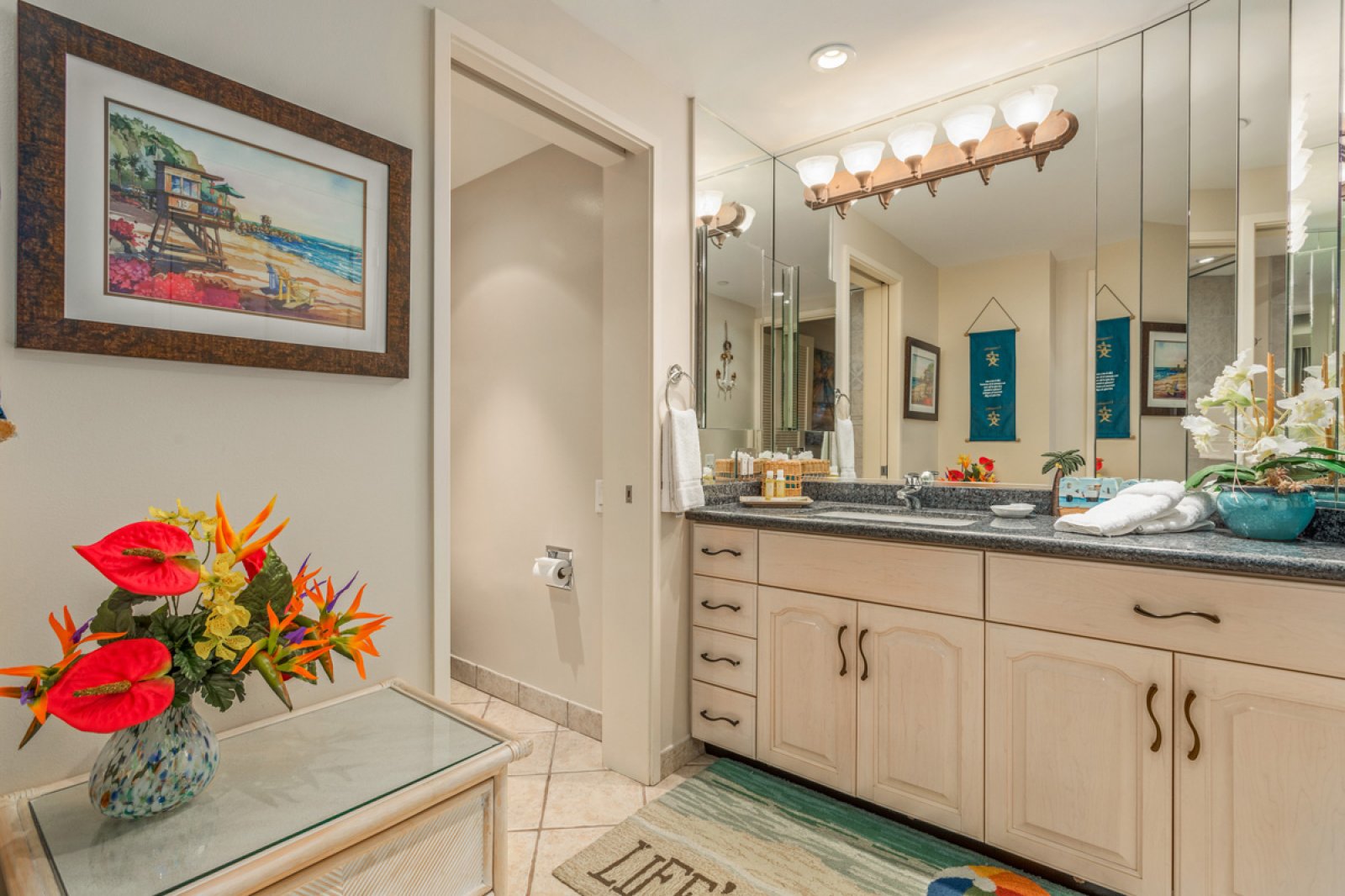• Primary BedroomKing bed with a comfortable lounge chair and striking photographic artwork inspired by Kaʻanapali Beach. The en-suite bathroom features a vanity and glass walk-in shower.