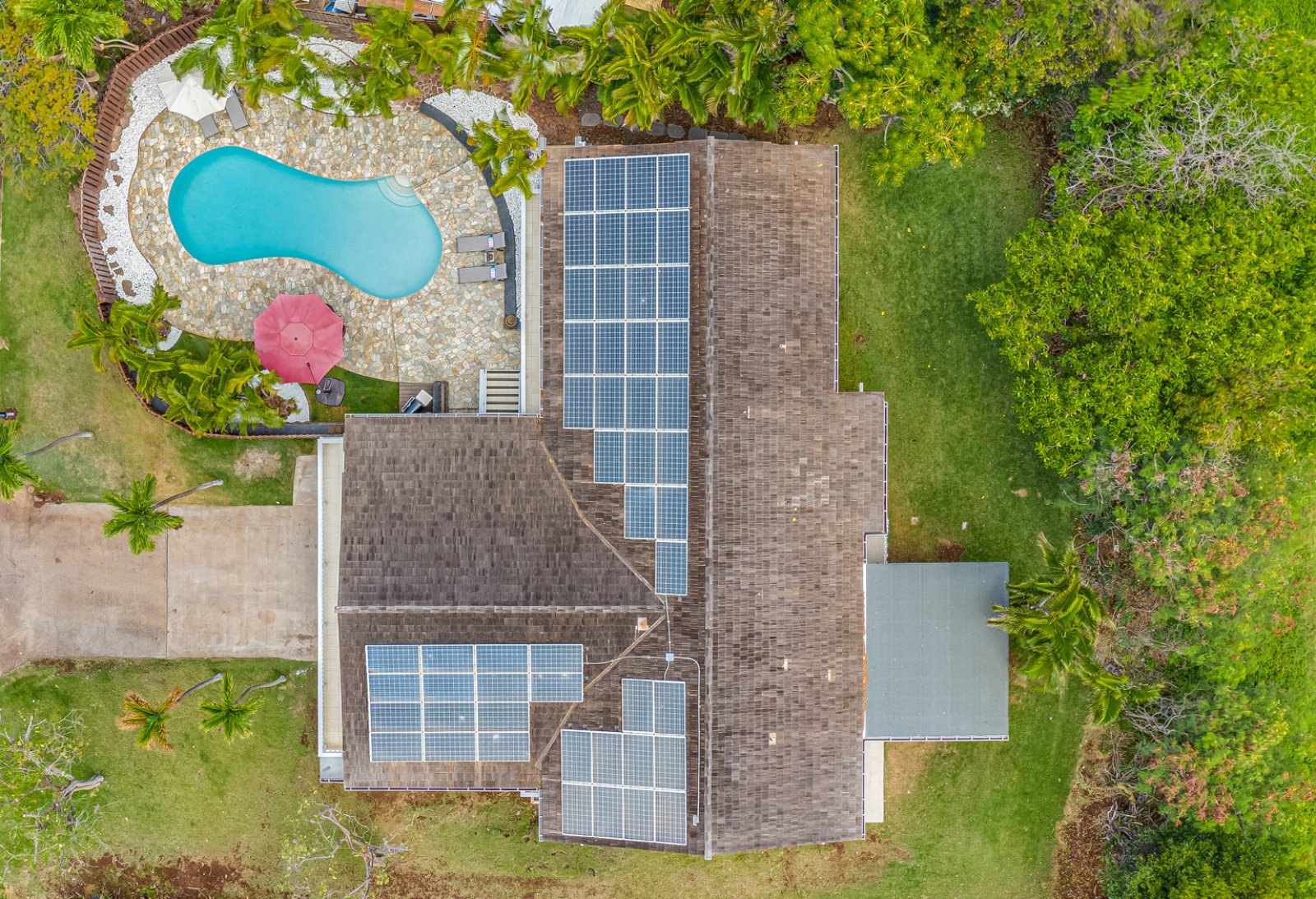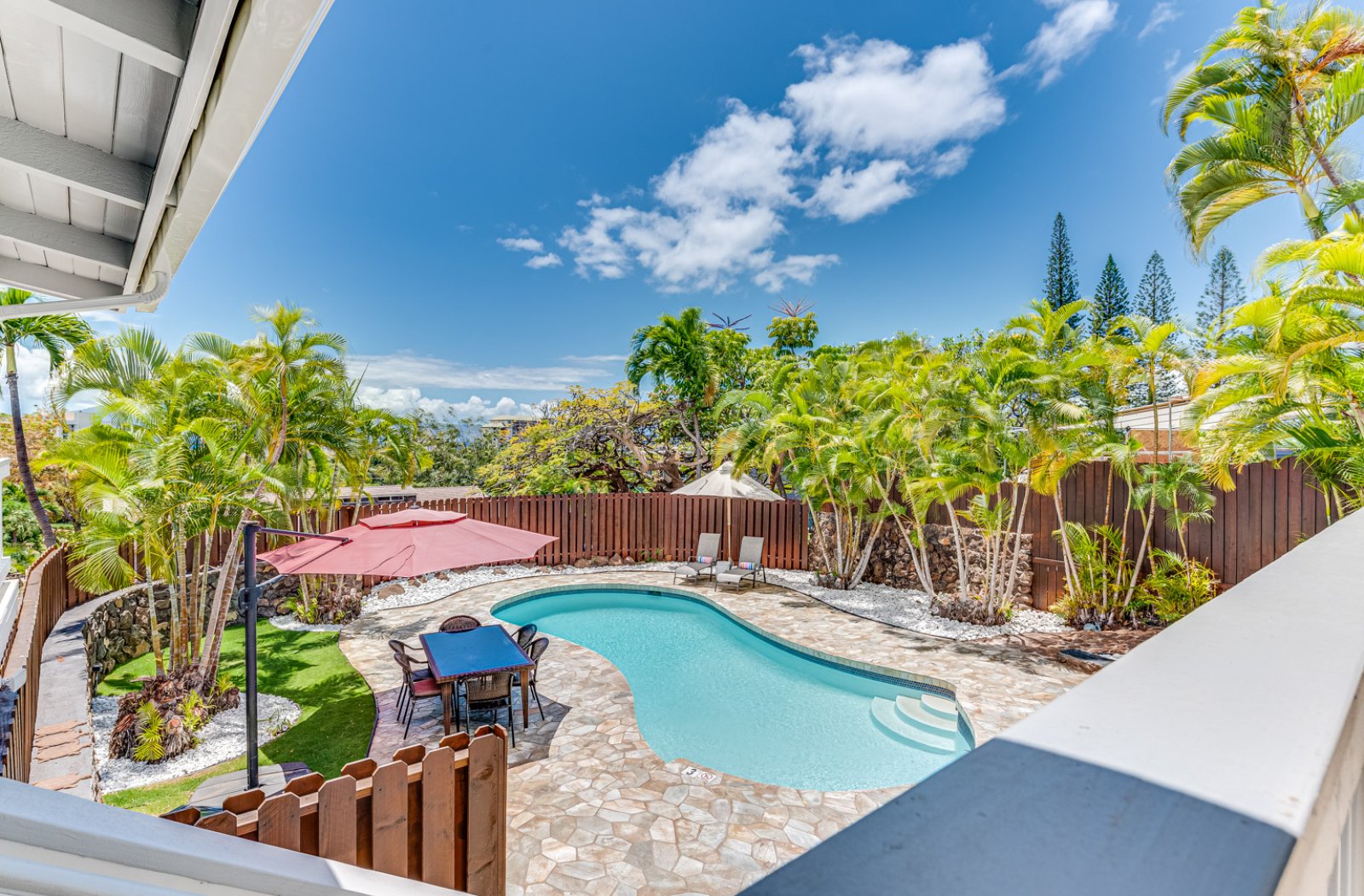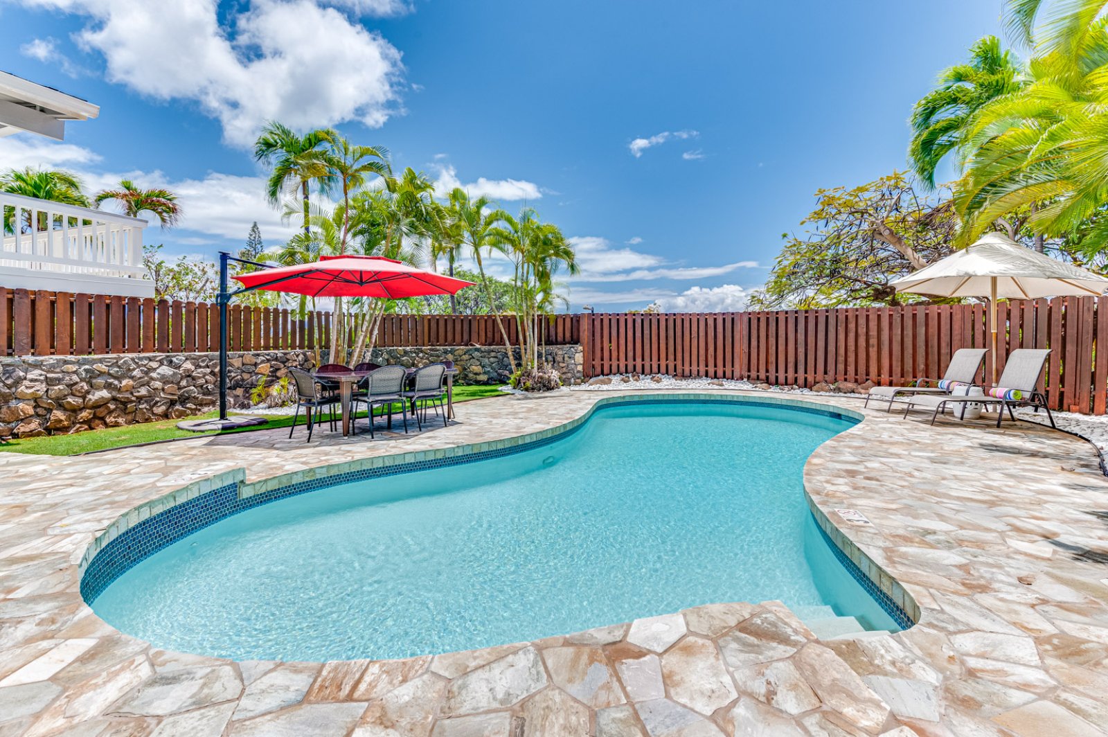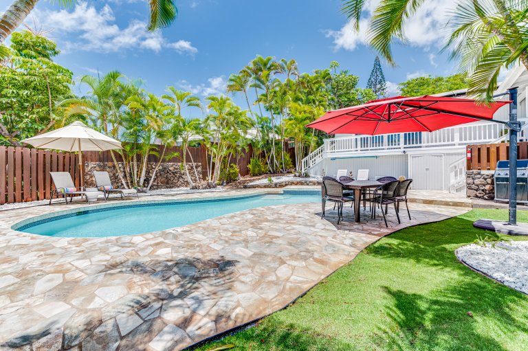 A private, fenced swimming pool and lanai, a large