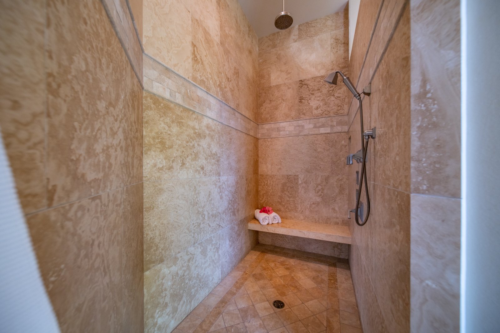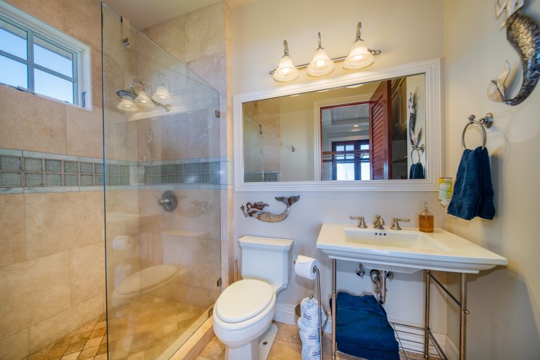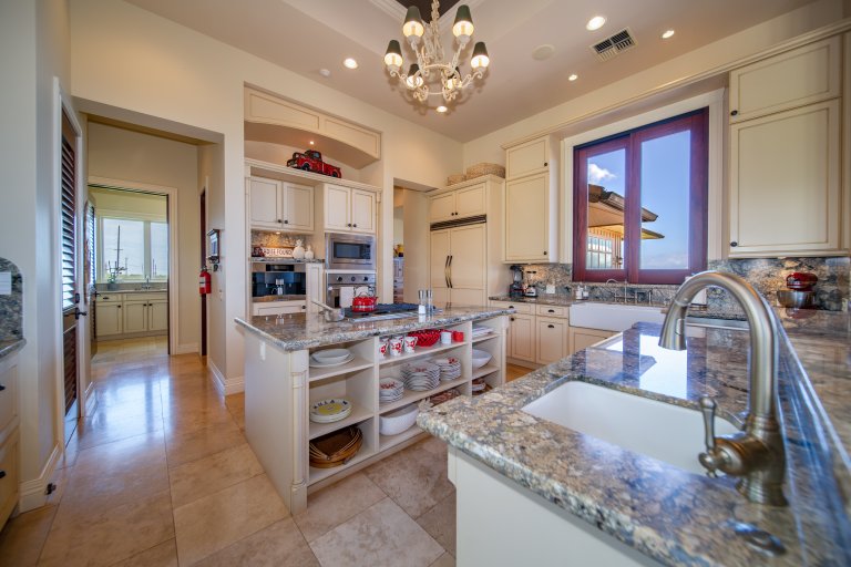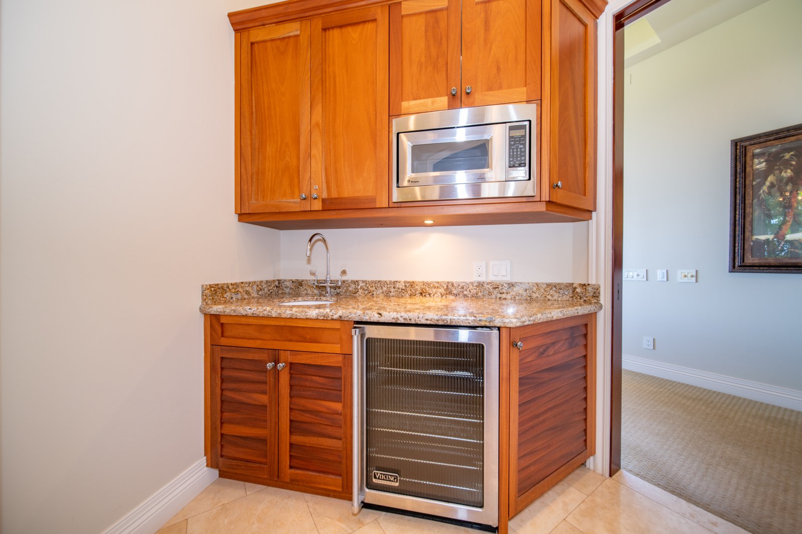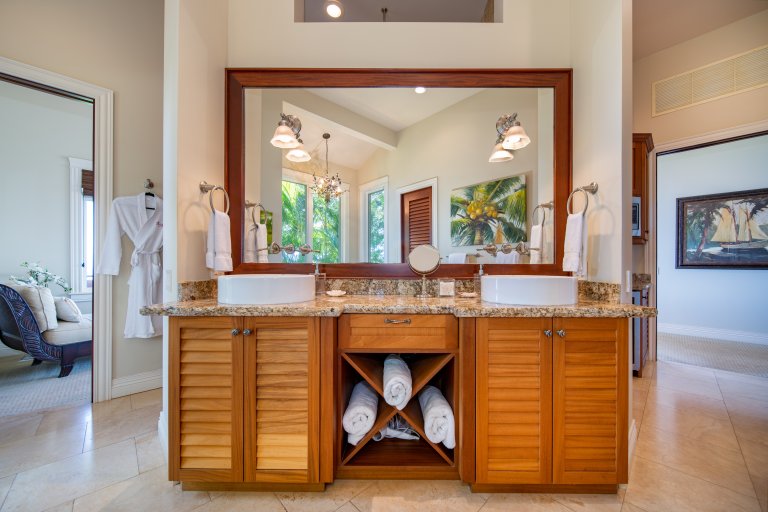 This estate provides three spacious bedrooms, each with King beds and en-suite baths. The master bedroom boasts its own private lanai, whirlpool tub and walk-in shower, as well as a wet bar. In addition, there is a fourth bedroom/media room that offers a queen sleeper sofa that can be closed off with a sliding door to allow for additional guests.