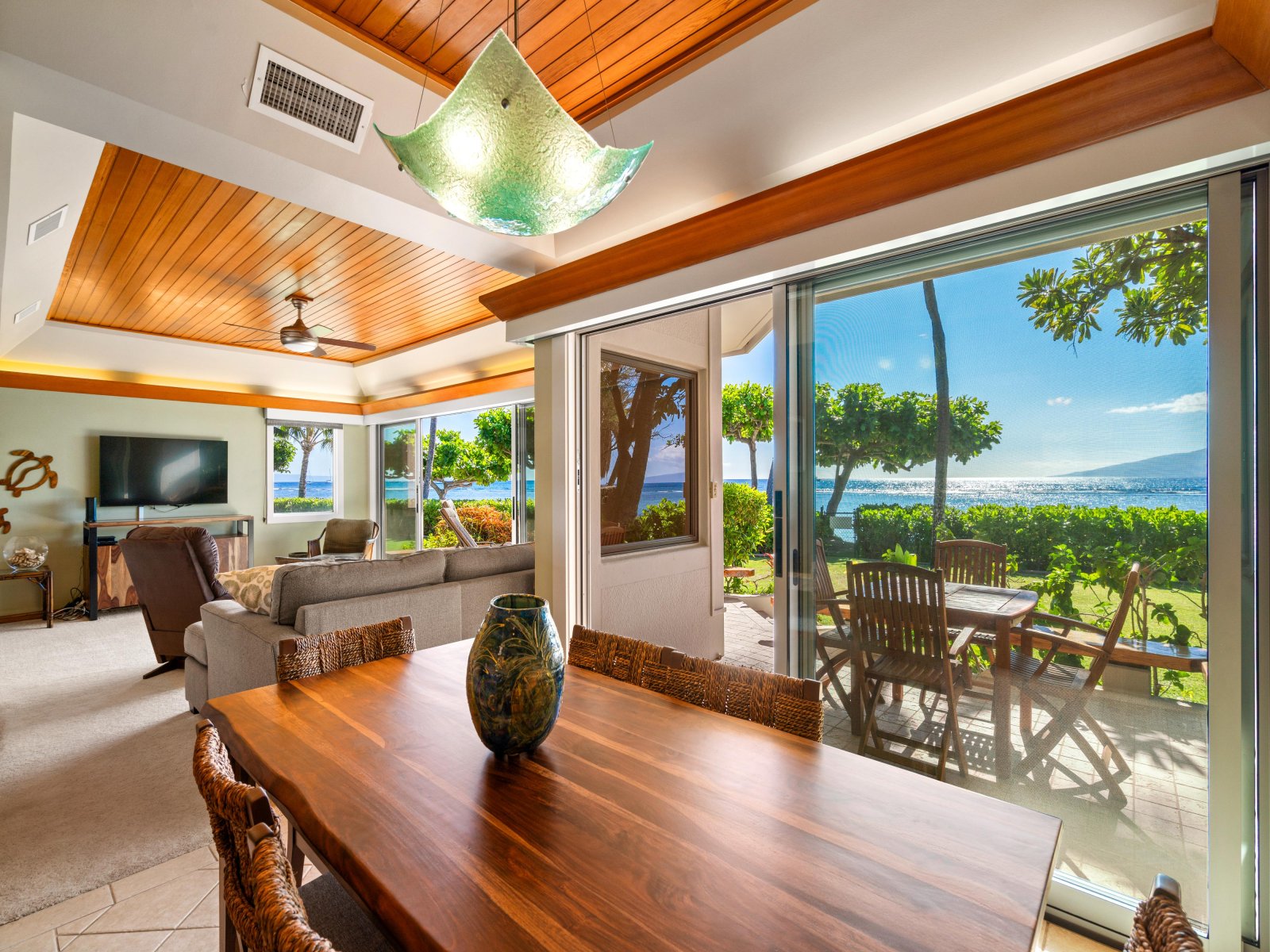 Step inside to discover a spacious 1,700 square foot open-concept living area with modern furnishings. Oversized sliding glass doors frame the living room with dreamy ocean views and allow natural light to fill the vacation villa. The living room is perfect for unwinding after a day of exploring Maui’s sights and treasures.