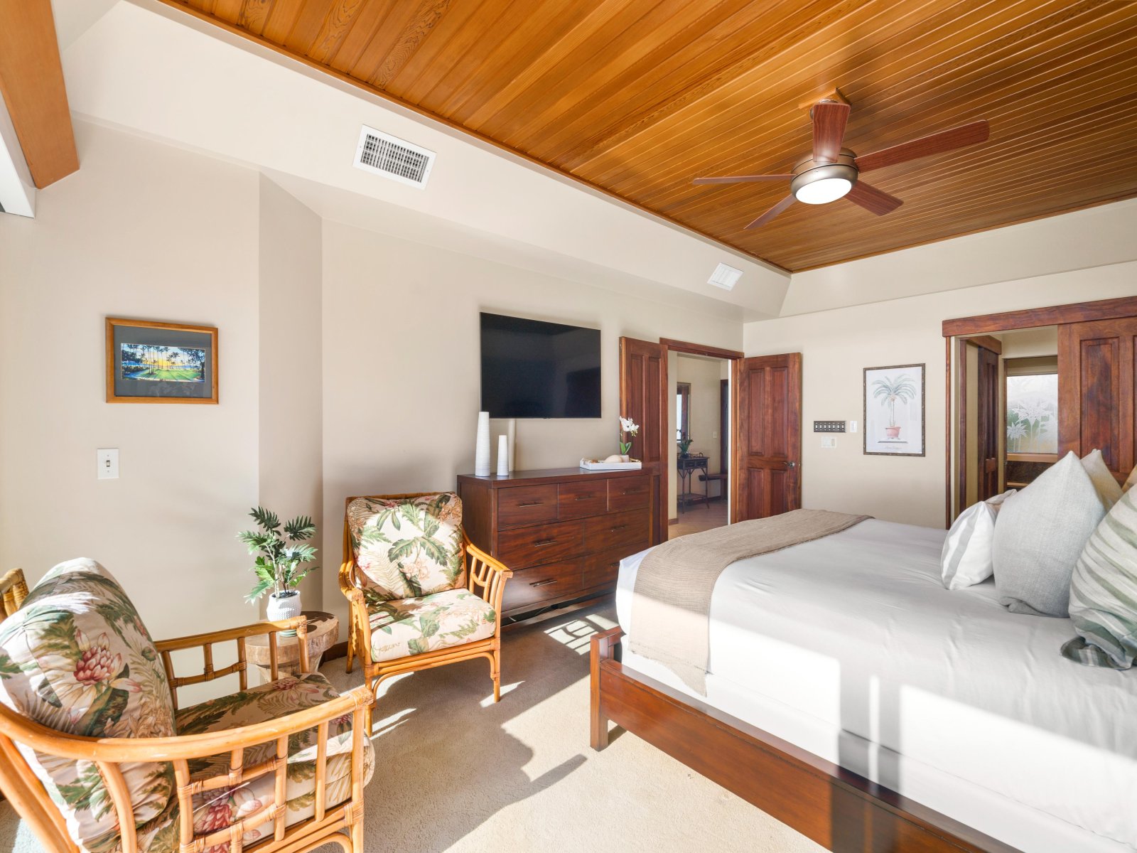 Dramatic wood paneling on the ceiling and custom koa wood cabinets in the fully-equipped kitchen add to the prestige and luxury of this home. A built-in wet bar off the living room with temperature-controlled wine refrigerator is the perfect nook to prepare sunset cocktails to take out on your lanai. Retreat to the dining table that comfortably seats six for a relaxing post-sunset snack or meal.