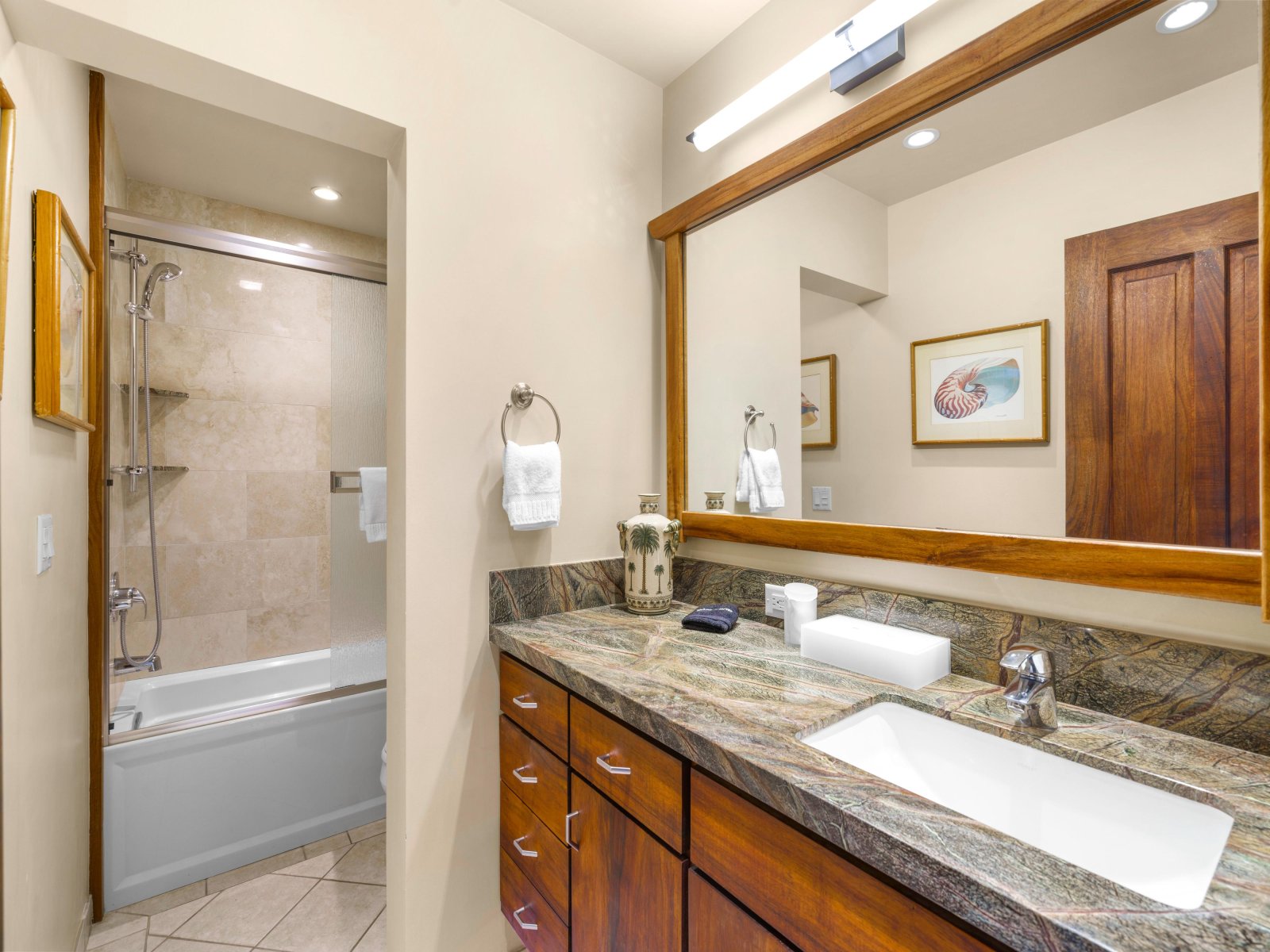 Both bedrooms feature plush California King beds, ensuring a restful night's sleep. The primary bedroom boasts an en-suite bathroom with a soaking bathtub and a walk-in shower, while the second bedroom also has its own full bathroom. The primary bedroom also enjoys private access out to the oceanfront lanai. Check the beach conditions from your bed each morning as you rise.