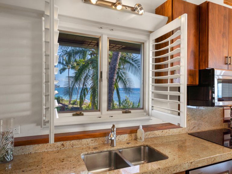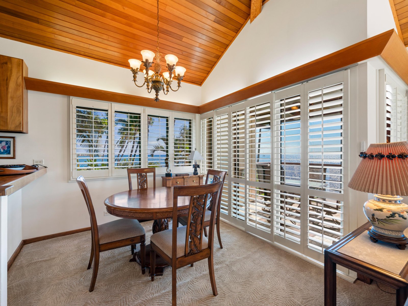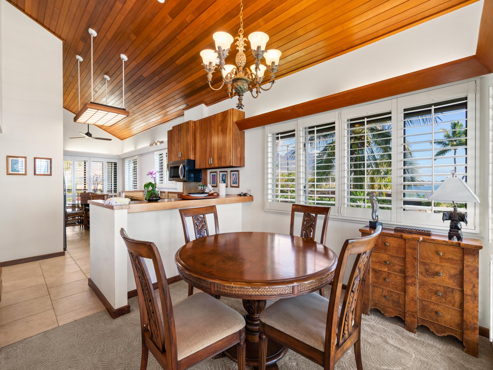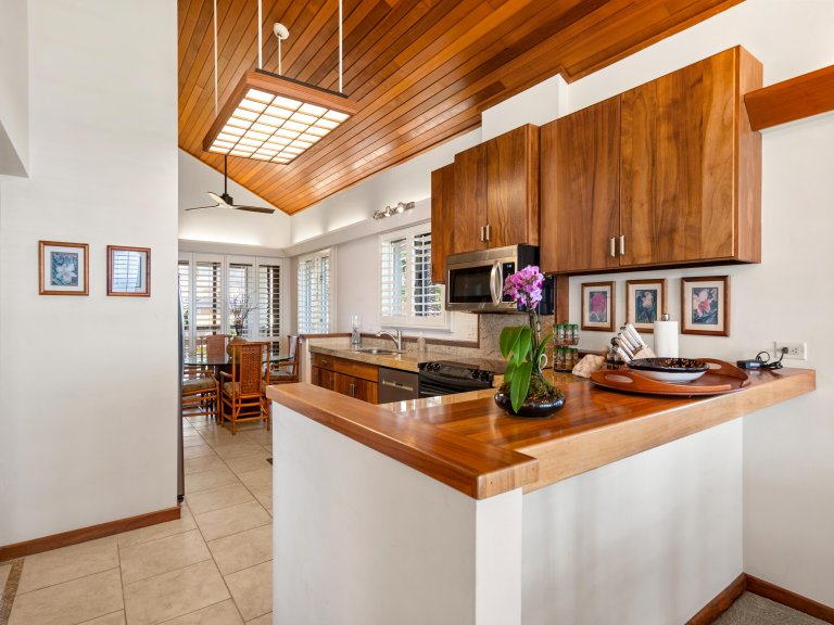 Hand-crafted Koa wood cabinets in the kitchen and detailed wood paneling on the ceiling add to the charm and elegance of this Maui vacation rental. The closer you look, the more island-inspired details you notice, such as a pineapple-inspired chandelier, wall art featuring local flowers, and polished kukui nut leis that drape over lampshades.