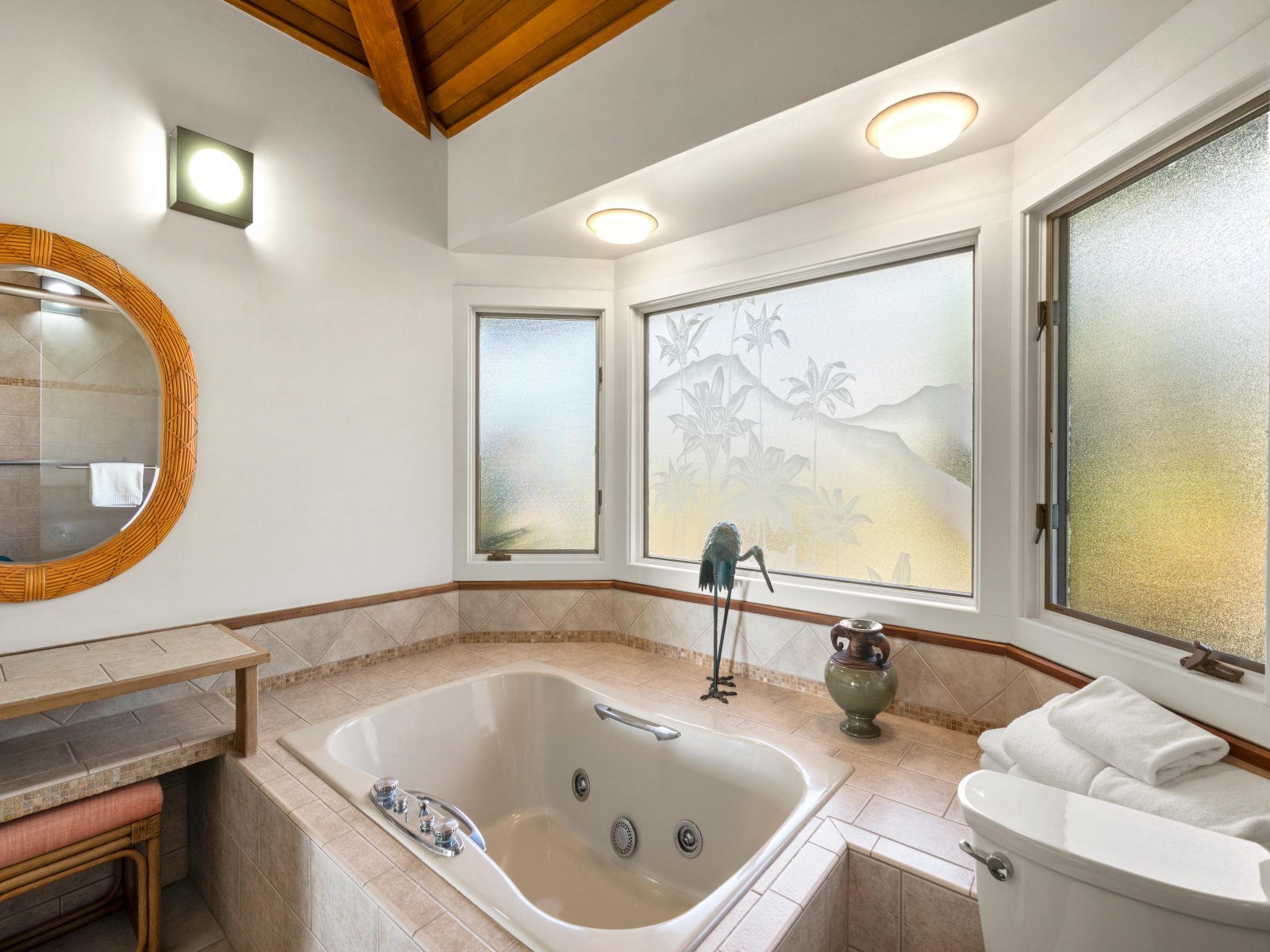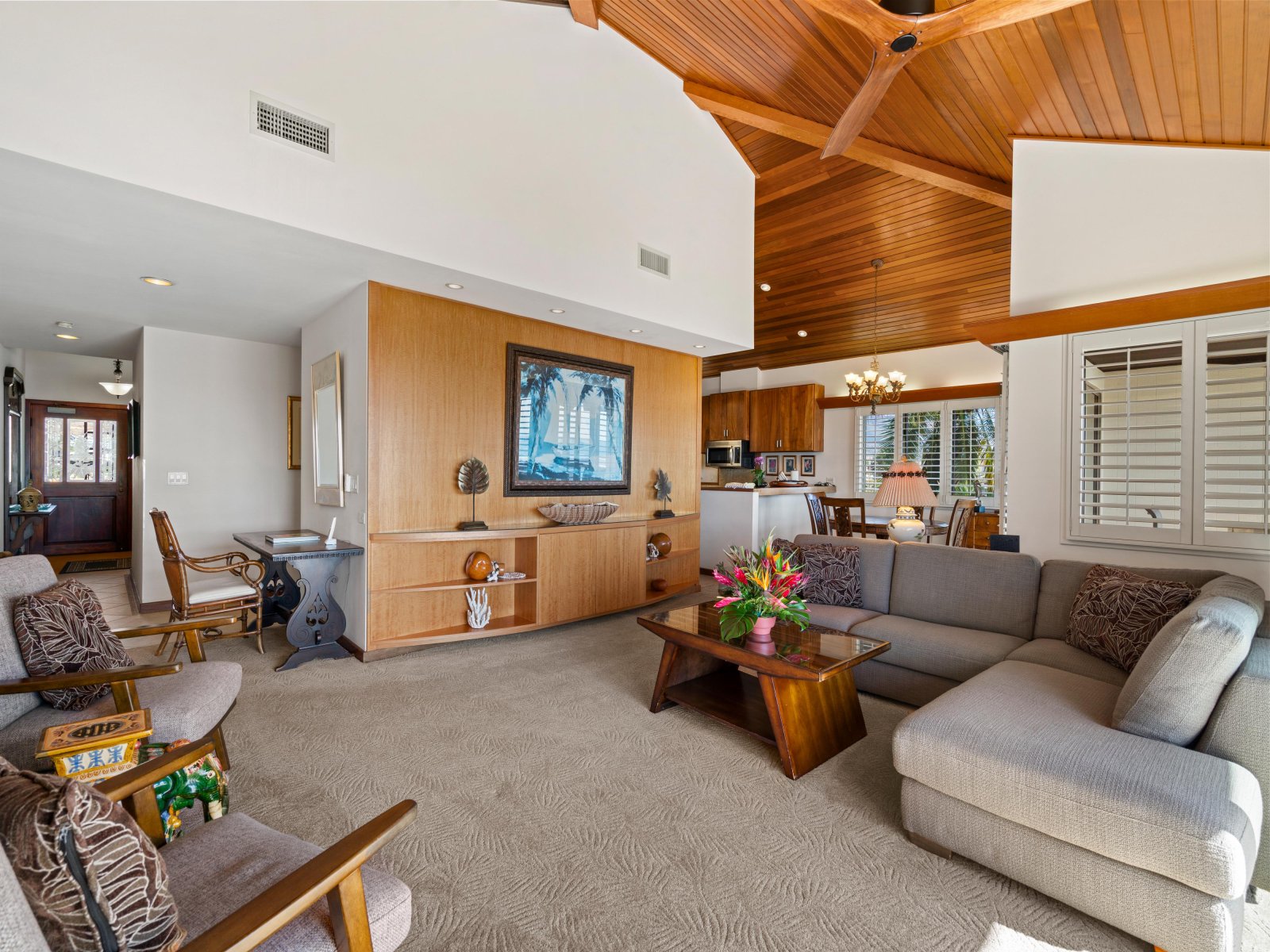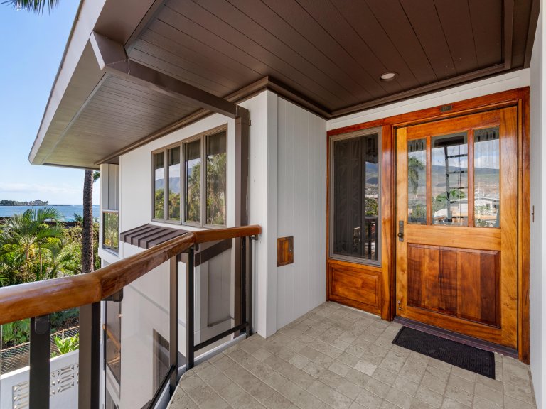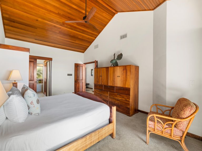 Hand-crafted Koa wood cabinets in the kitchen and detailed wood paneling on the ceiling add to the charm and elegance of this Maui vacation rental. The closer you look, the more island-inspired details you notice, such as a pineapple-inspired chandelier, wall art featuring local flowers, and polished kukui nut leis that drape over lampshades.