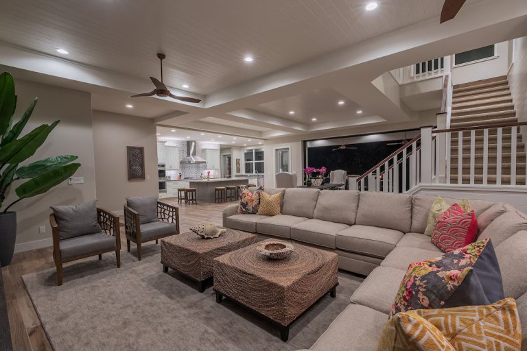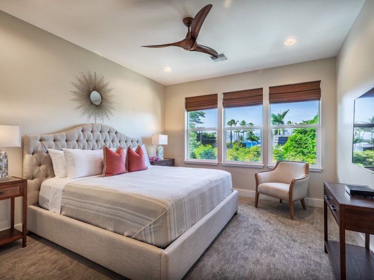 Inside, the Jewel of Napili offers seven beautifully appointed bedrooms, including two luxurious primary suites—one on each level. Five bedrooms feature en-suite bathrooms, and six rooms offer king-sized beds, each dressed in 1000-thread-count linens for a five-star experience. Every space is tastefully curated with a mix of custom furnishings and Restoration Hardware pieces, blending comfort and sophistication throughout.