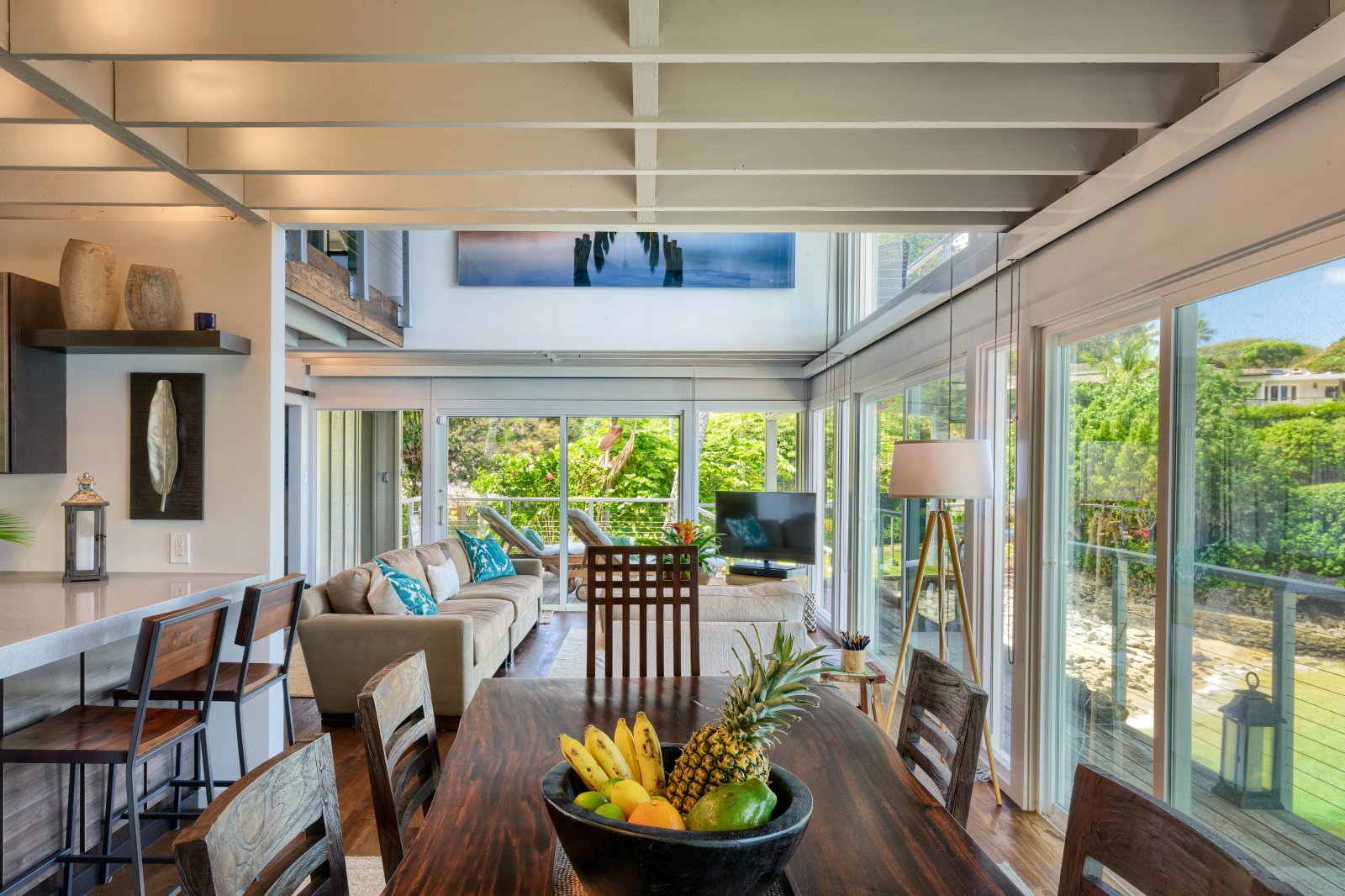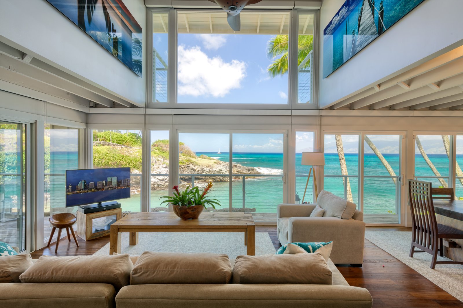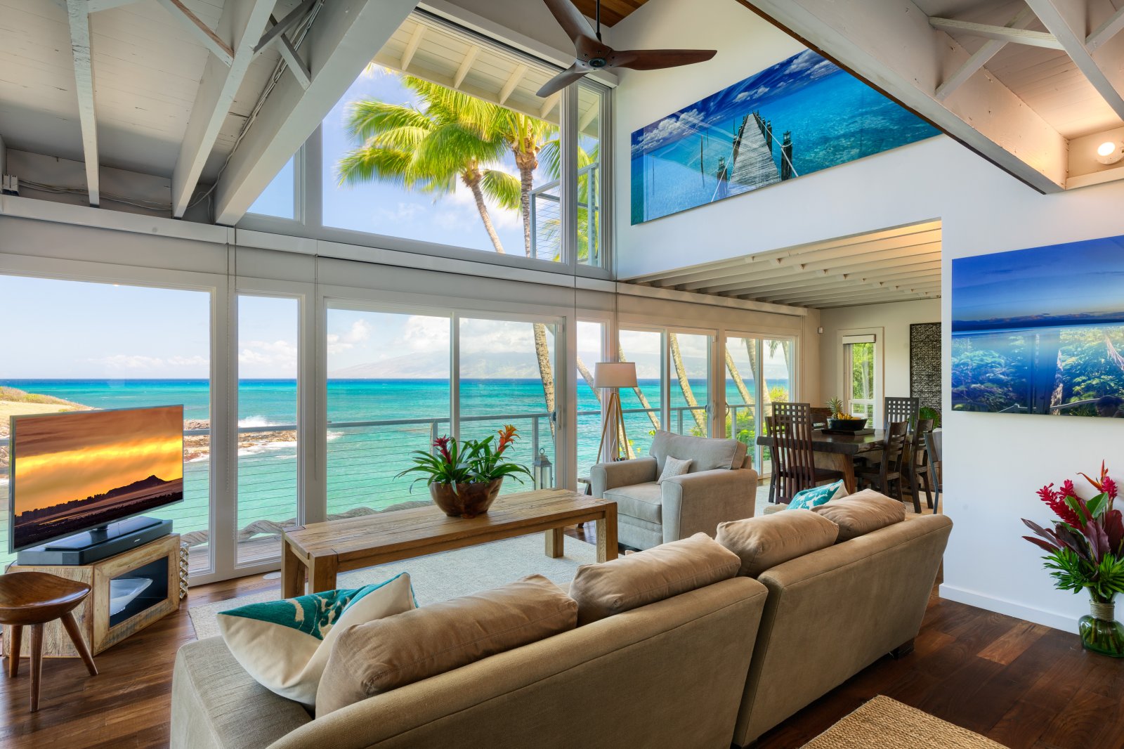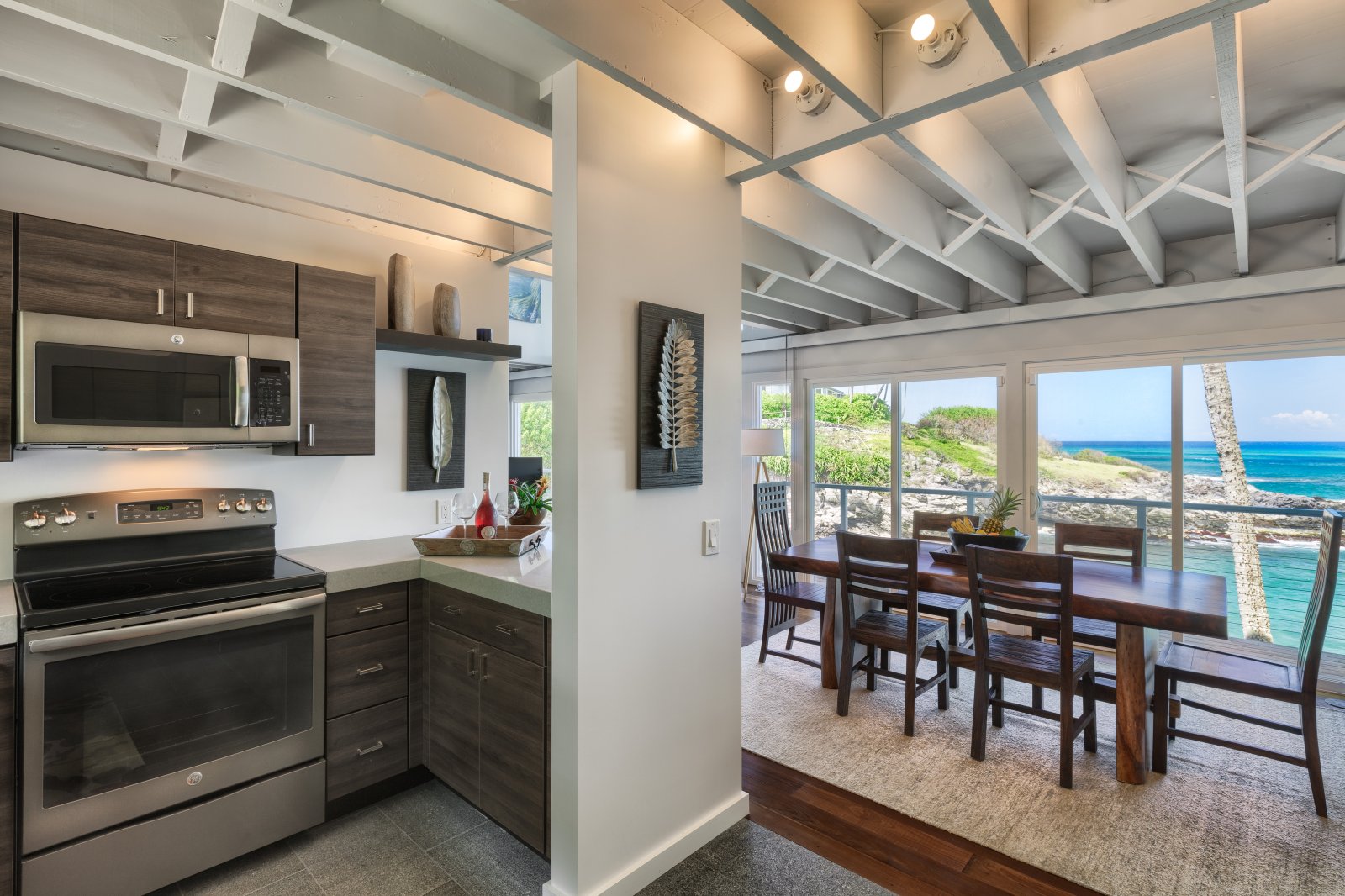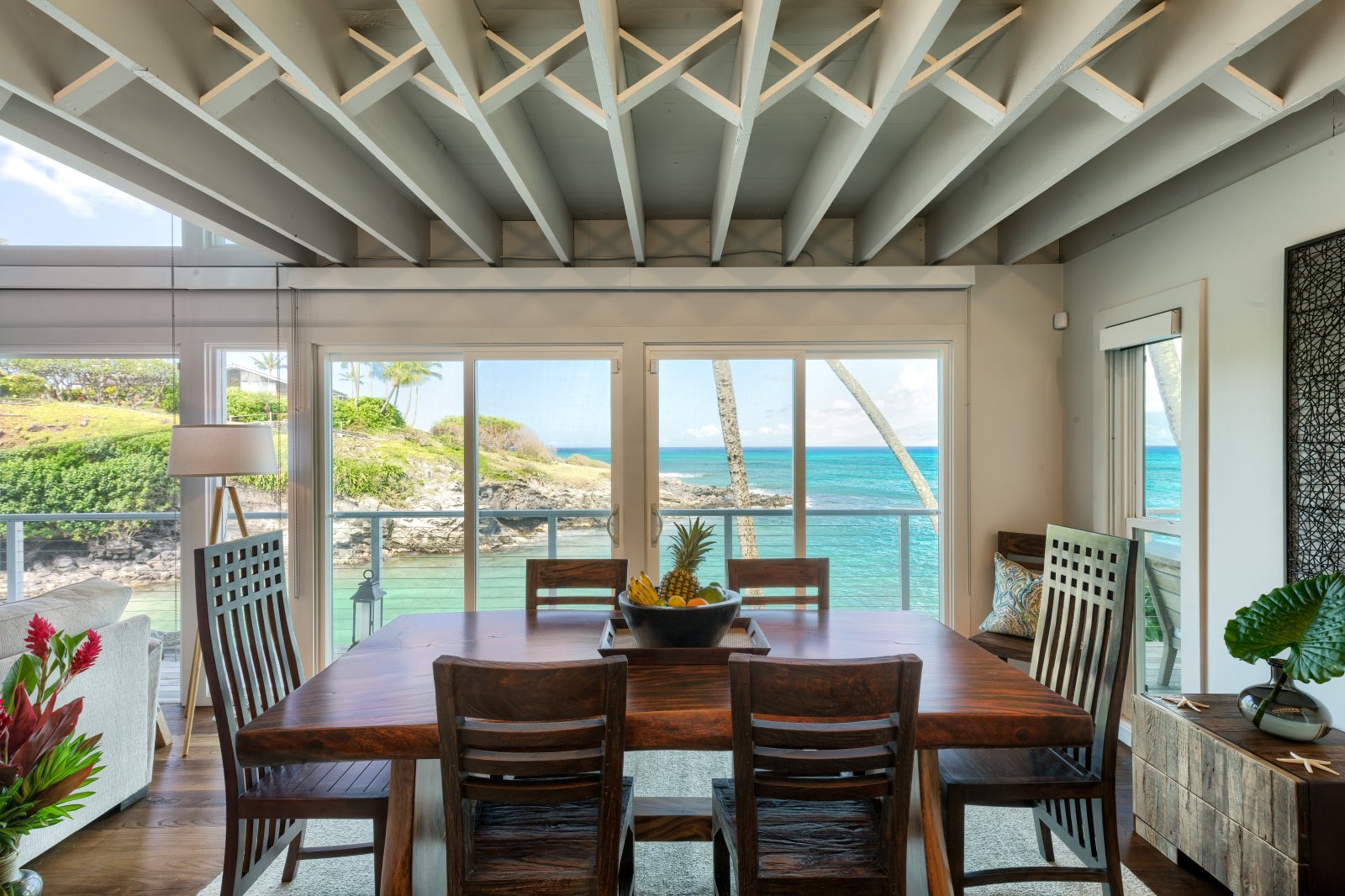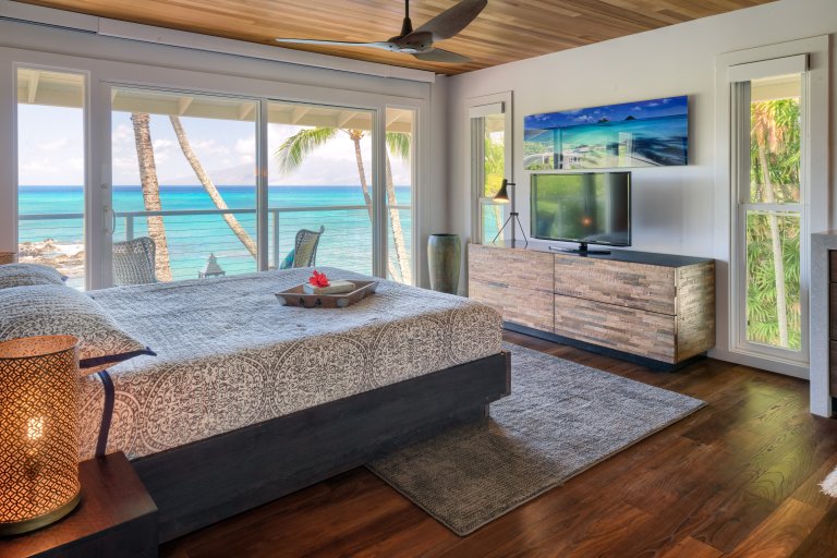 Preparing meals in the chef’s kitchen is a joy, with state-of-the-art, stainless-steel appliances. An open plan allows cooks and guests to socialize, while the breakfast bar and six-person dining table allow for comfortable dining. Again, the stunning tropical vistas and blue Hawaiian waters serve as the backdrop for almost every room.