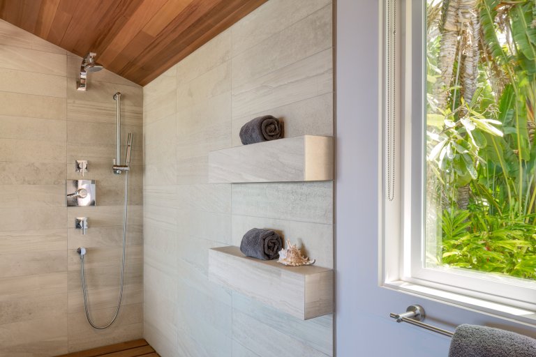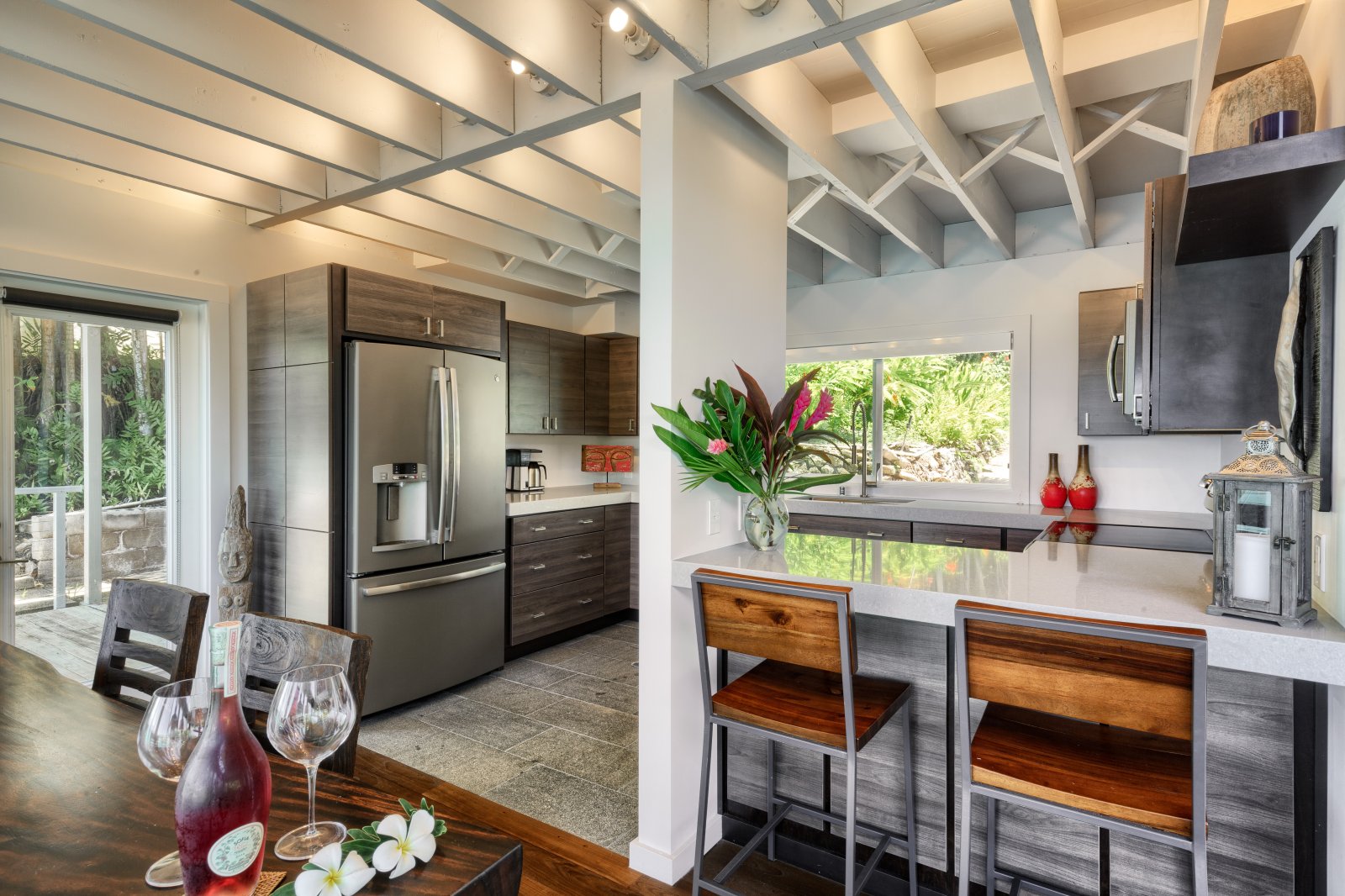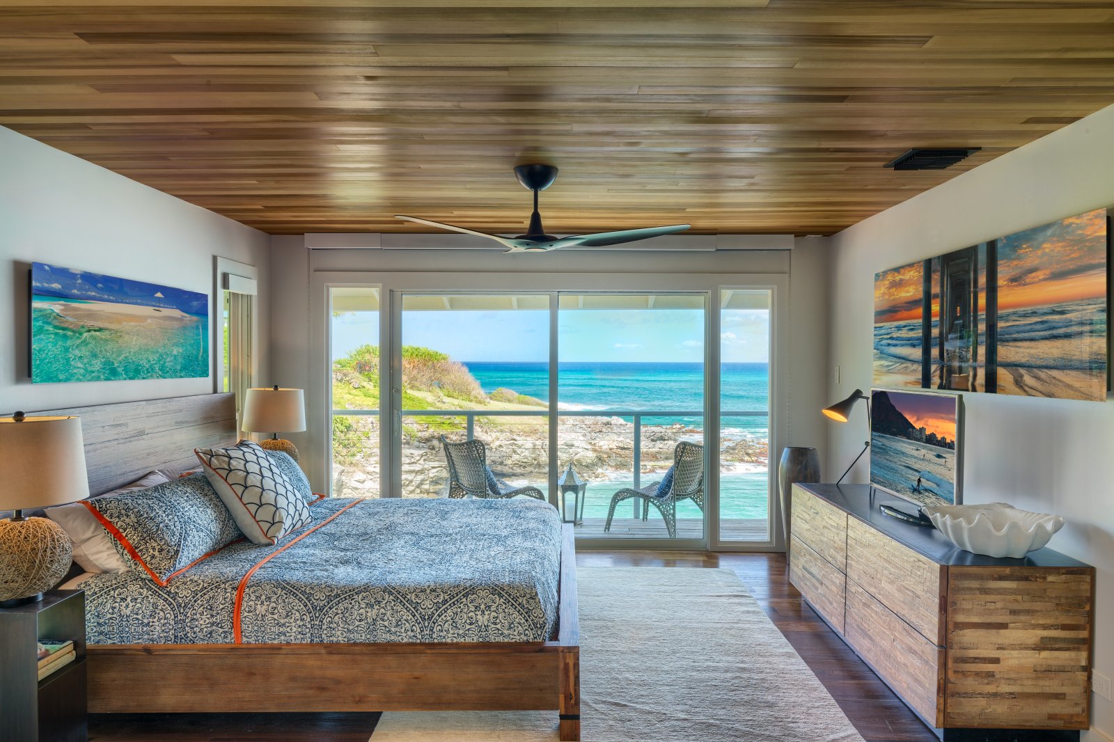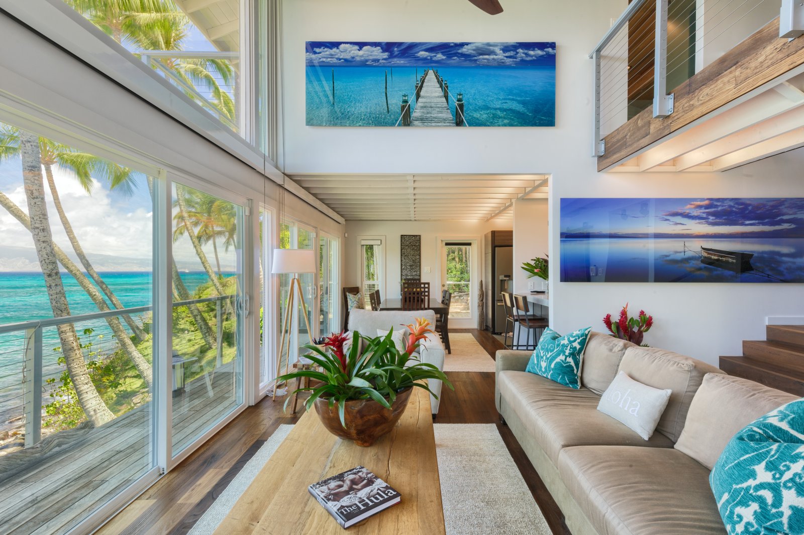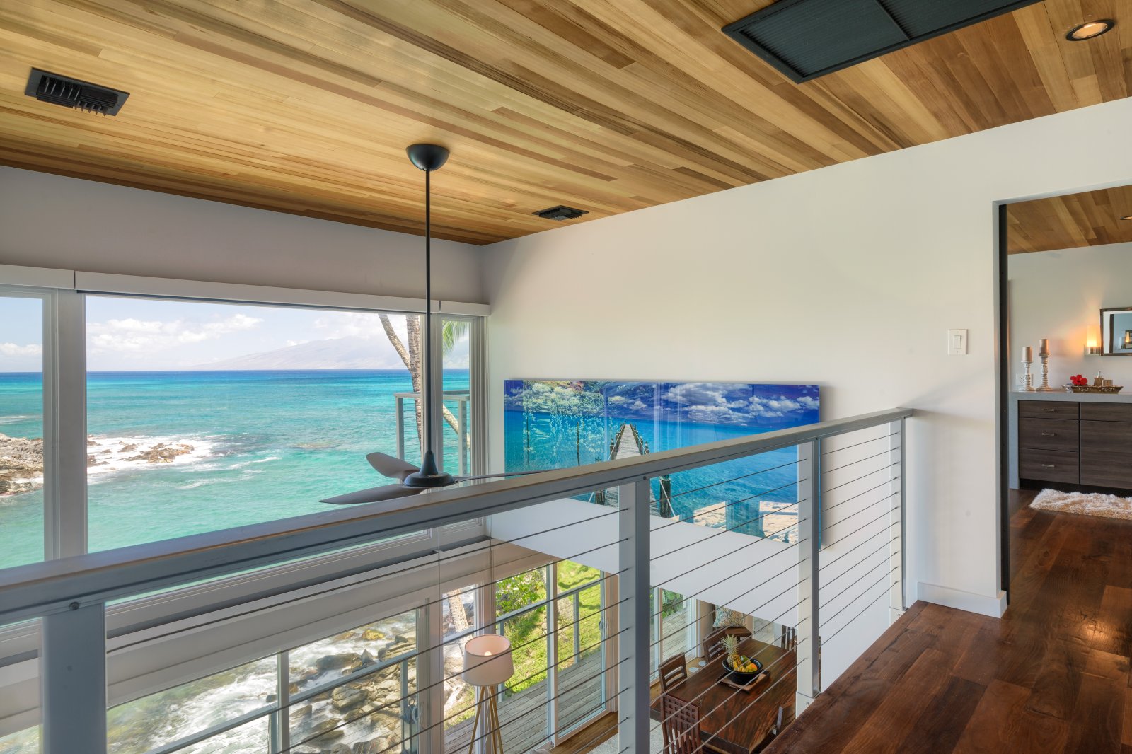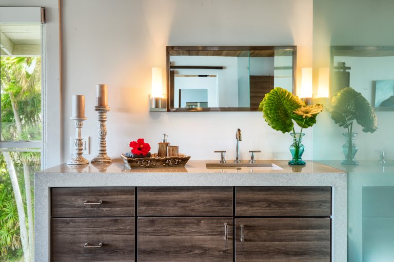 Preparing meals in the chef’s kitchen is a joy, with state-of-the-art, stainless-steel appliances. An open plan allows cooks and guests to socialize, while the breakfast bar and six-person dining table allow for comfortable dining. Again, the stunning tropical vistas and blue Hawaiian waters serve as the backdrop for almost every room.
