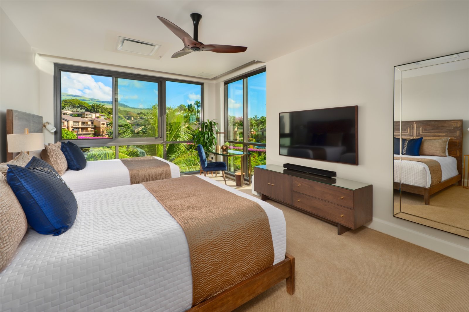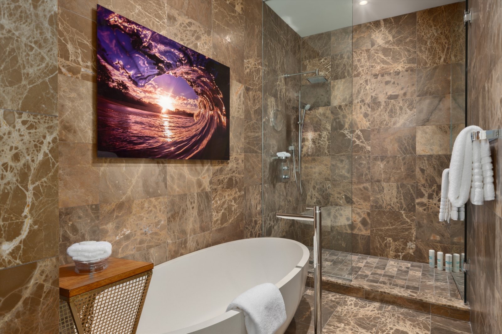 Bed: California King • En-Suite Bath with Shower, Bathtub and Dual Vanity • Flat-Screen, Cable, Smart, Apple TV Service TV • iPod Docking Station • Sound System • Walk-In Closet • Additional Seating • Desk • Ocean View