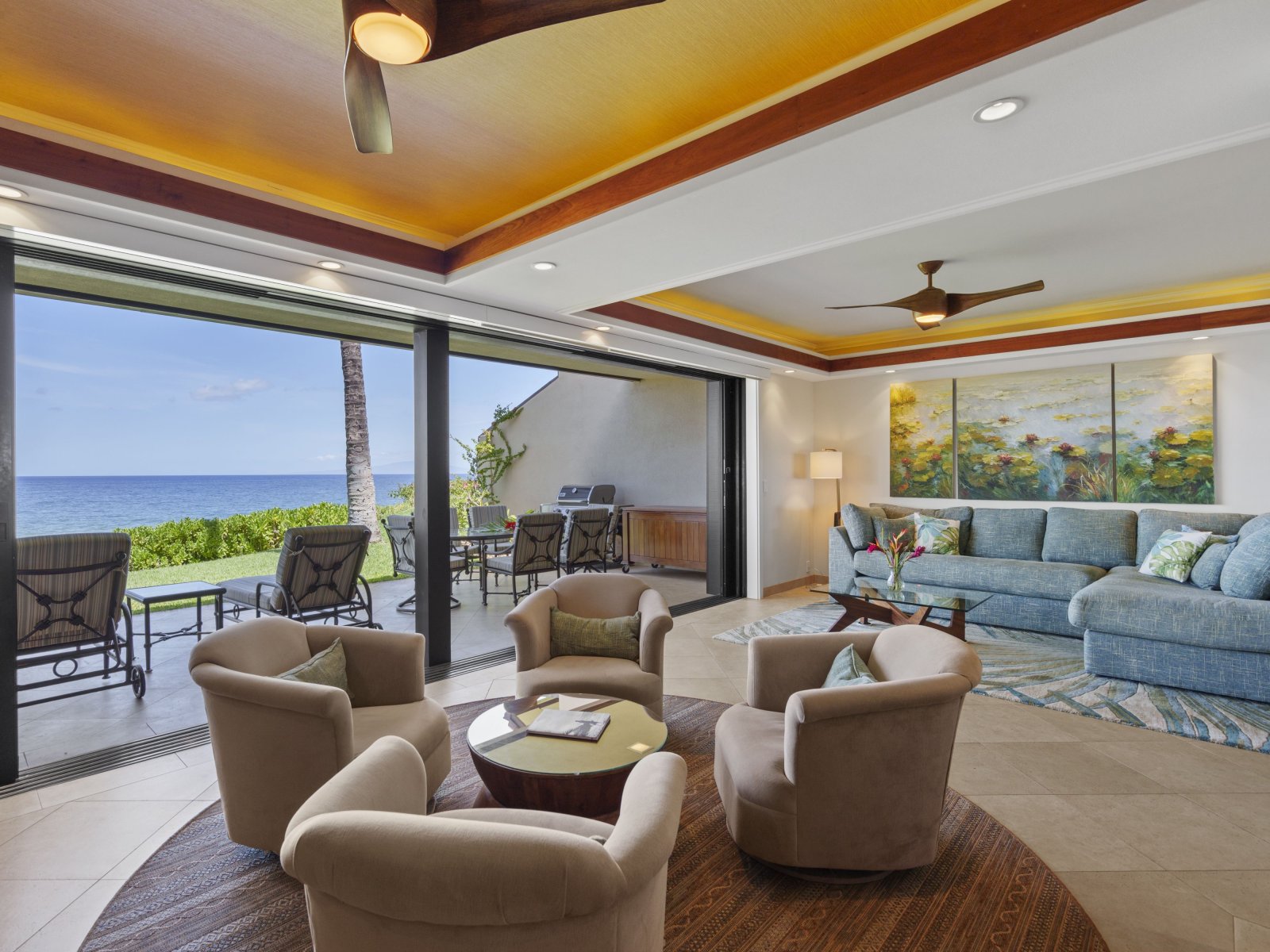 Welcome to the Makena Surf B106 Beachfront Resort, your perfect Hawaiian retreat. This stunning 2-bedroom, 2-bathroom oceanfront condo offers a luxurious escape for up to six guests. Step into the open-concept living area, where modern furnishings and large windows create a bright, airy atmosphere. The living room features a cozy sofa bed, perfect for additional guests.