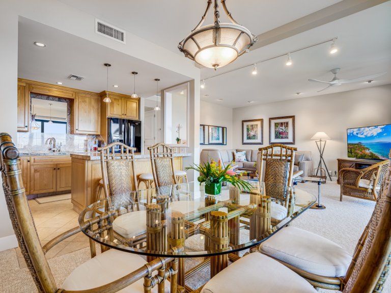 Welcome to the Makena Surf B205 Beachfront Resort, your perfect Hawaiian retreat. This stunning 2-bedroom, 2-bathroom oceanfront condo offers a luxurious blend of comfort and style, ideal for a family getaway. The spacious open-plan living area features a fully equipped kitchen, a cozy dining area, and a comfortable living room with a plush sofa and a flat-screen TV, perfect for unwinding after a day of adventure.