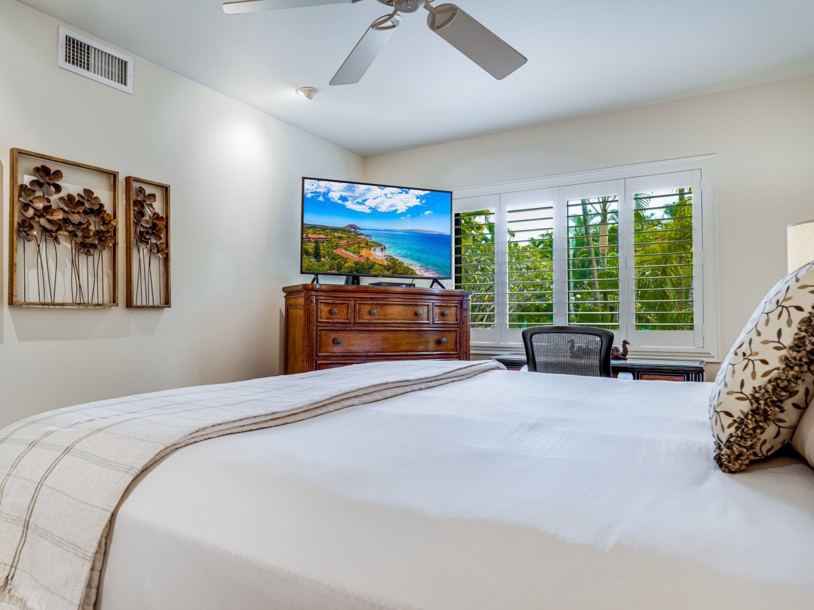 Bed: King Bed • En-Suite Bath with Shower and Dual Vanity • TV • Desk • Ceiling Fan