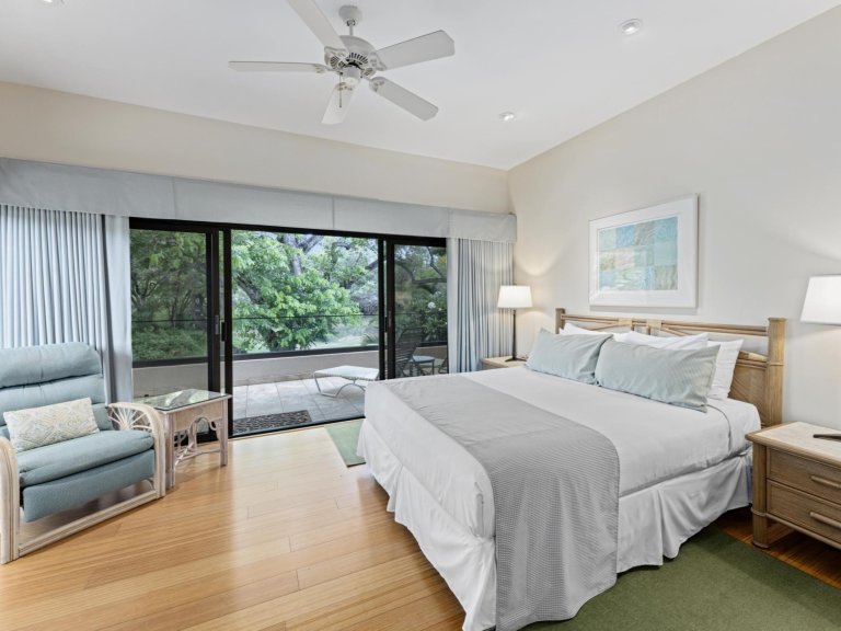 The master bedroom features a plush king bed, while the second bedroom comfortably accommodates two guests with a set of twin beds. Both bedrooms offer serene ocean views and walk-in closets for ample storage.
