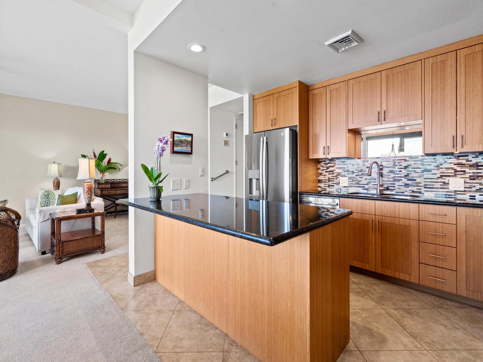 Welcome to the Makena Surf G202 Beachfront Resort, your perfect oasis in Wailea, Hawaii. This stunning 2-bedroom, 2-bathroom oceanfront condo offers a luxurious escape for up to six guests. Step inside to find a spacious, open-concept living area that seamlessly blends modern elegance with coastal charm. The living room features a comfortable sofa bed, perfect for unwinding after a day at the beach.