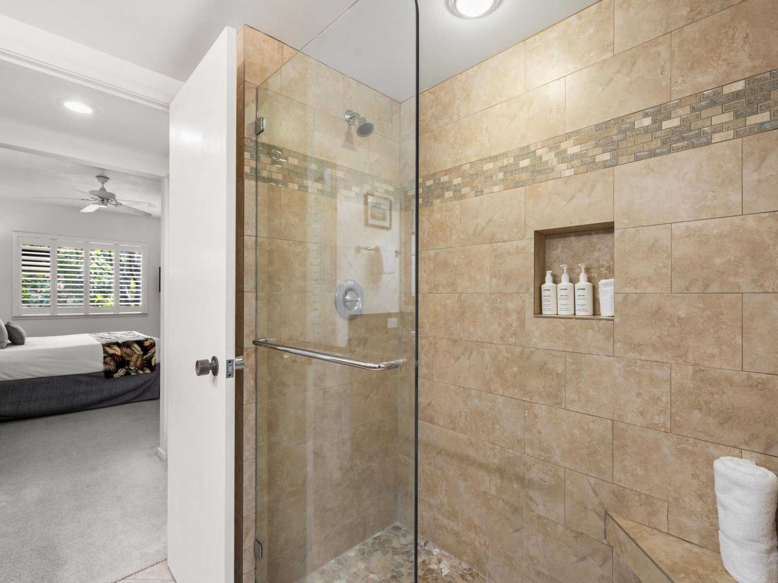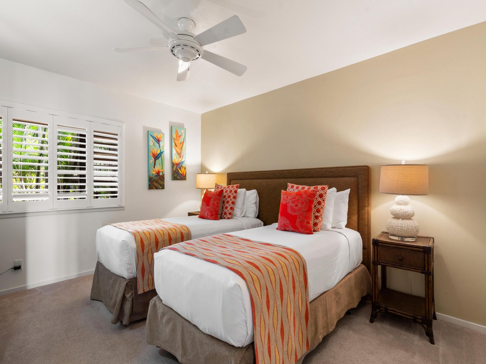2 Bed: Twin Beds • En-Suite Bath with Walk-In Shower • TV • Ceiling Fan