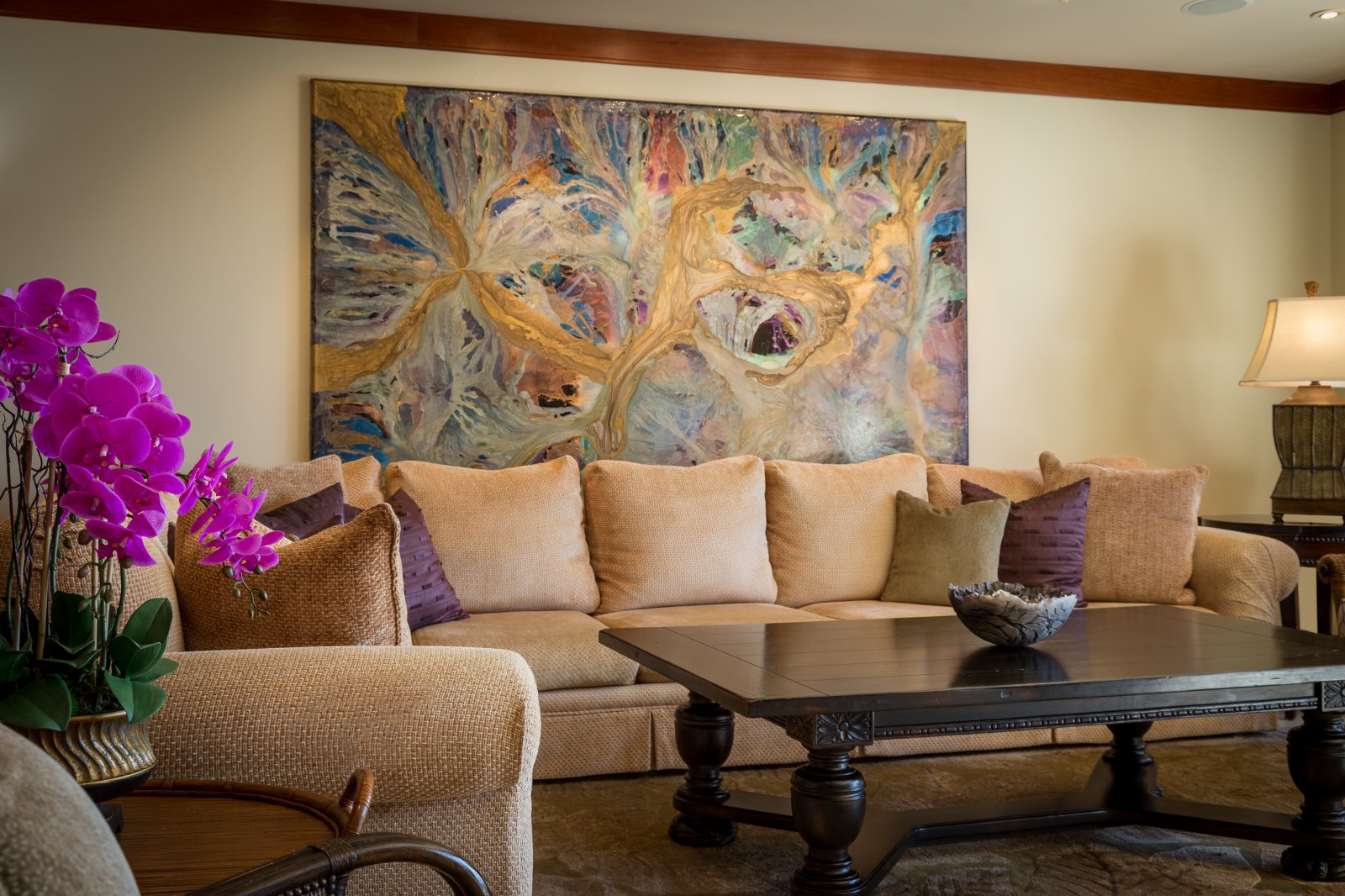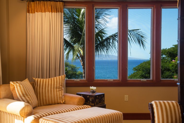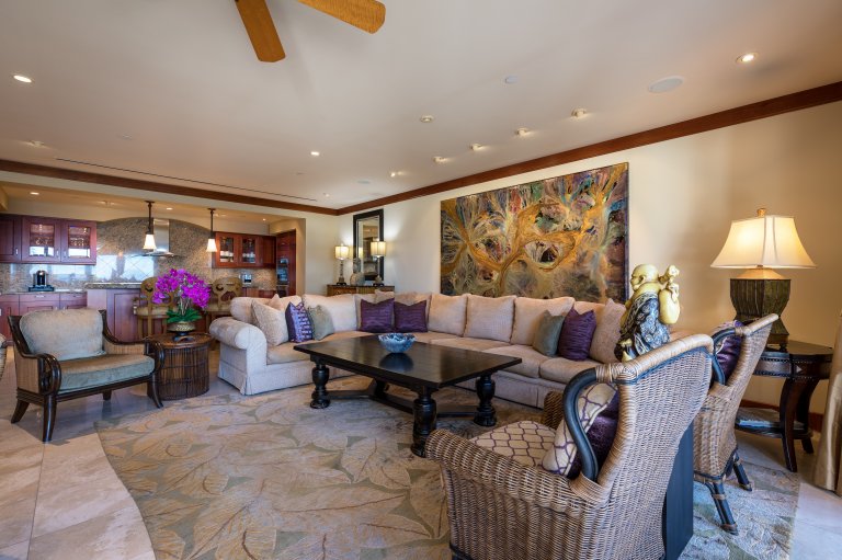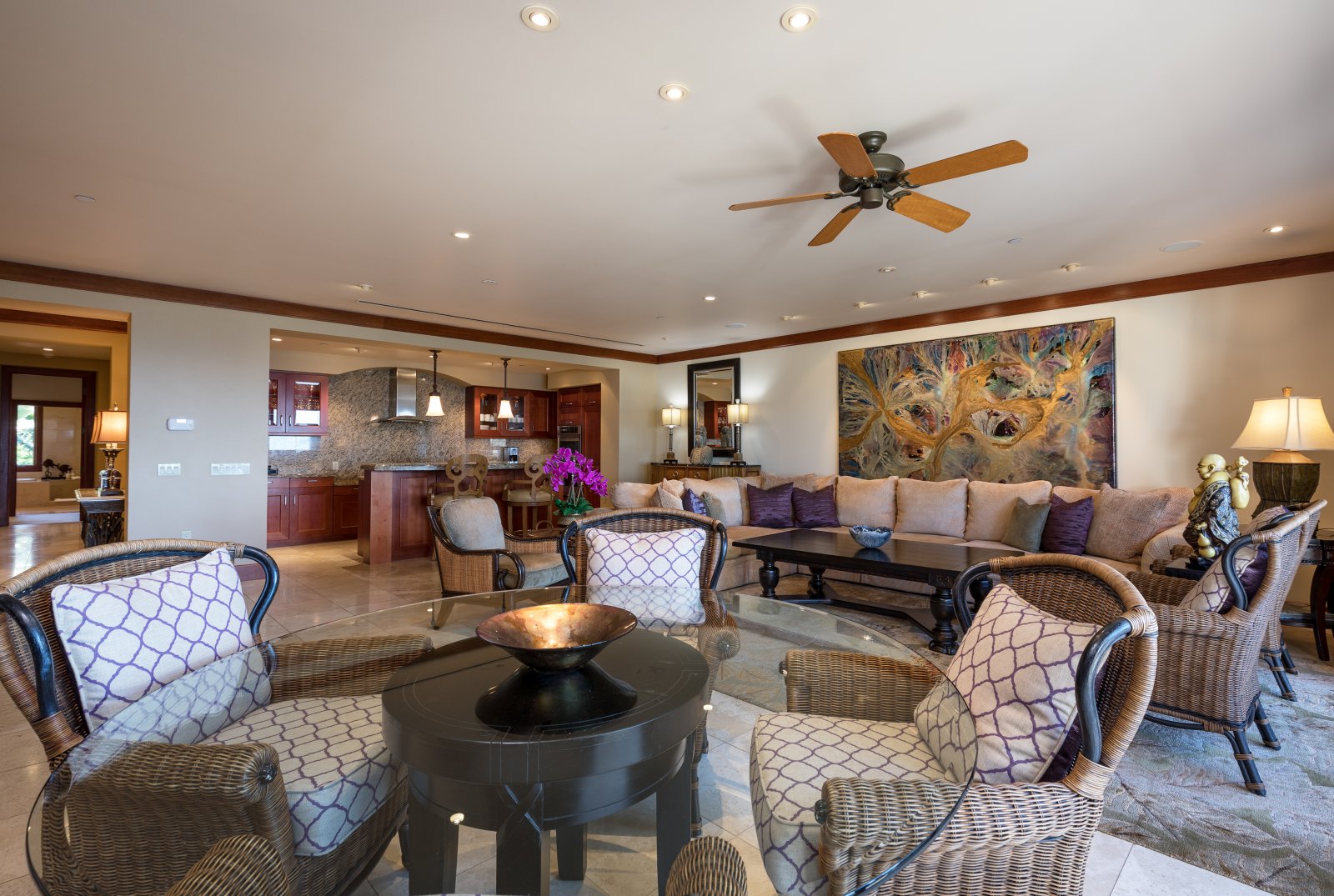 Step into the sprawling great room, where deep amethyst and jade tones set the scene for relaxation and sophistication. Every inch of this 3,000 sq. ft. villa radiates class, with custom Ralph Lauren furnishings and opulent touches throughout. Picture yourself sipping coffee on your private lanai, gazing at the sunset, or catching sight of whales dancing in the waves below. As night falls, you'll even get a free show from the nearby luau!