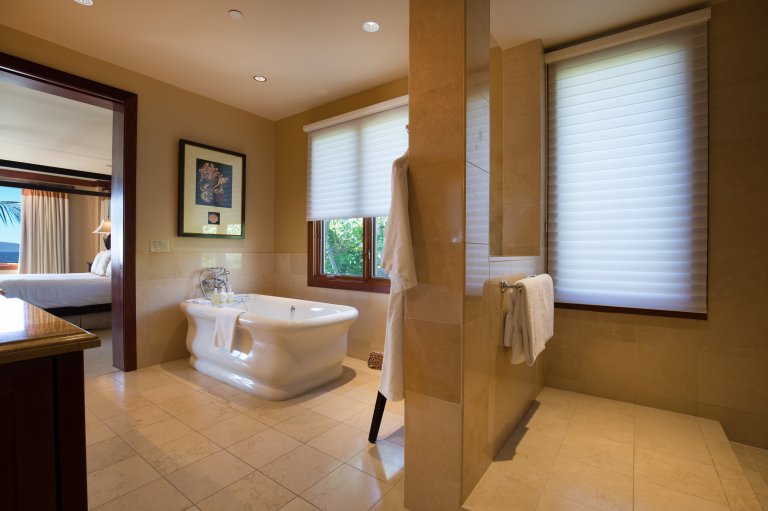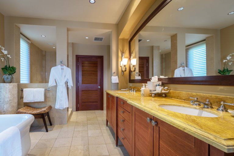 On the opposite side of the villa, the second primary bedroom offers luxurious privacy with its warm mahogany bed, spa-like bathroom, and walk-in closet. Meanwhile, the third bedroom is a cozy, coral-hued retreat, complete with its own ensuite bath and private lanai.
