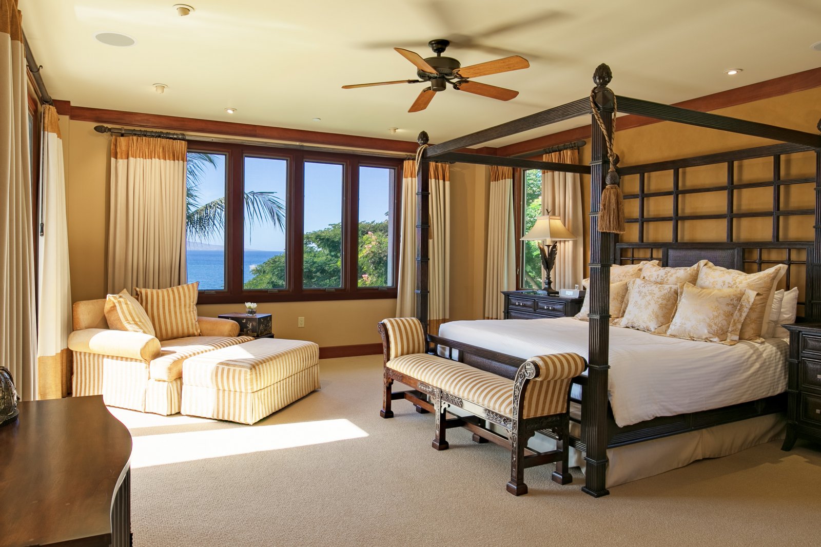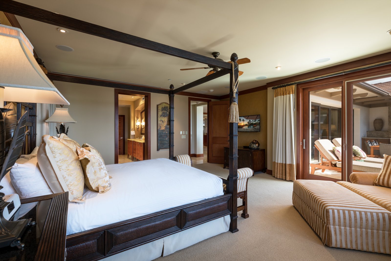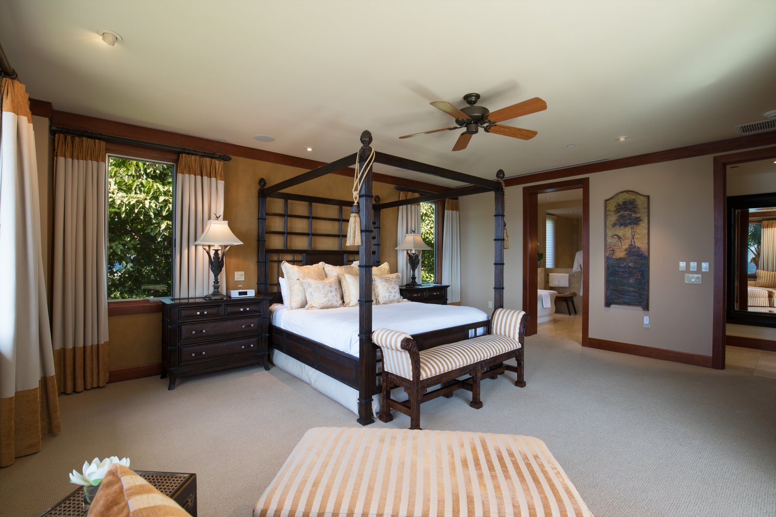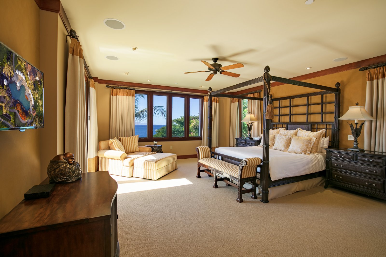 The primary suite is an absolute haven, complete with a grand four-poster king bed, chic furnishings, and an entire wall of windows framing the Pacific Ocean. Imagine waking up to that view every morning! The ensuite bathroom is equally indulgent with a free-standing soaking tub, a walk-in shower, and a custom closet perfect for an extended stay.