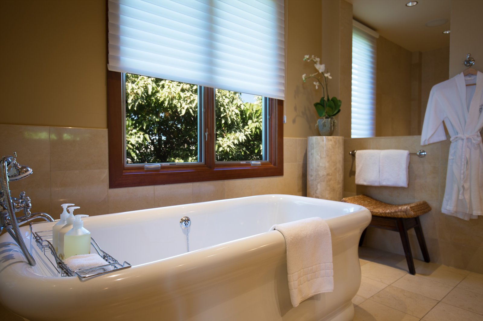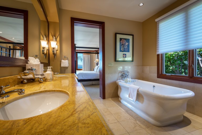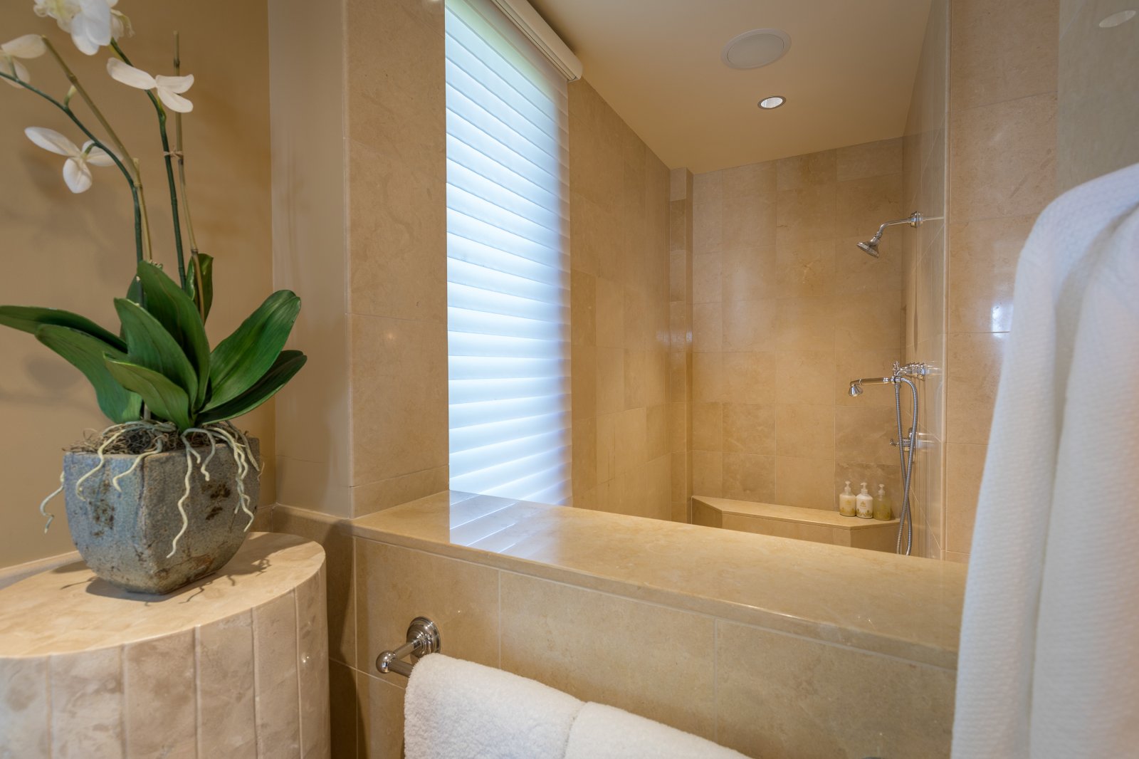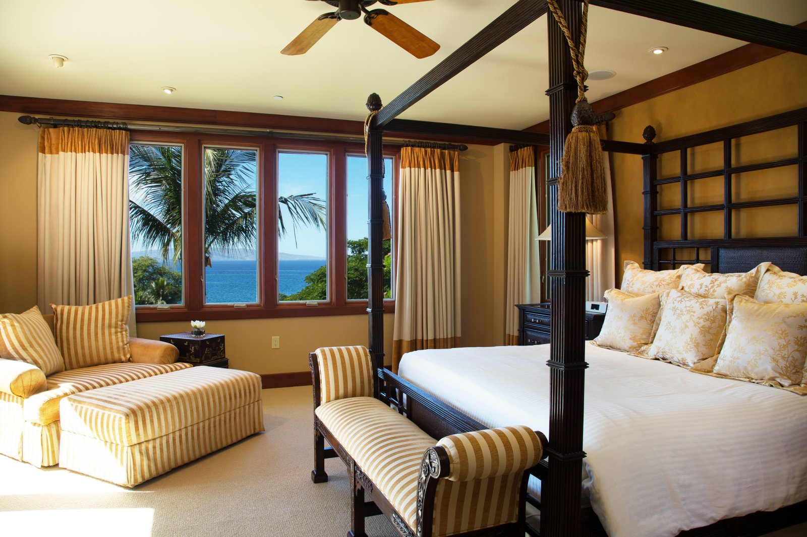 The primary suite is an absolute haven, complete with a grand four-poster king bed, chic furnishings, and an entire wall of windows framing the Pacific Ocean. Imagine waking up to that view every morning! The ensuite bathroom is equally indulgent with a free-standing soaking tub, a walk-in shower, and a custom closet perfect for an extended stay.