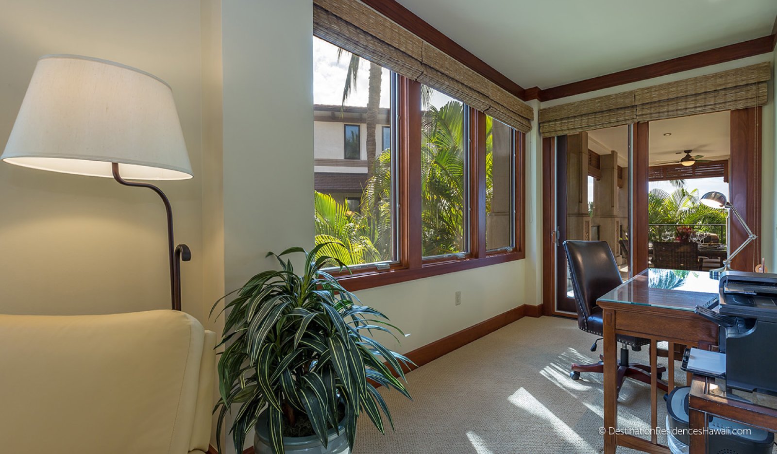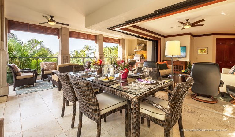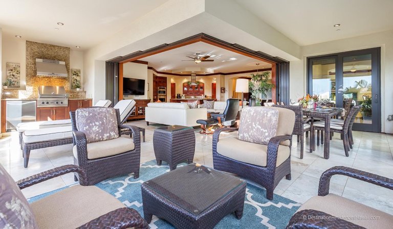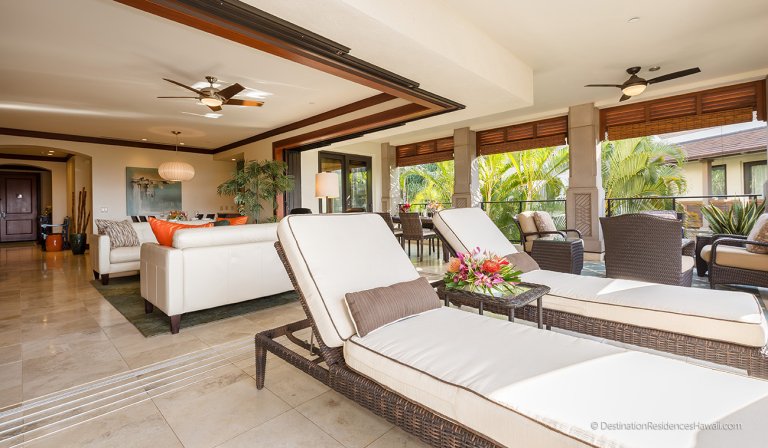 The covered lanai serves as an extension of the interior living space, offering a comfortable setting for morning coffee, afternoon relaxation, or evening conversations. Surrounded by tropical greenery, this private outdoor area provides a calm and inviting environment throughout the day.