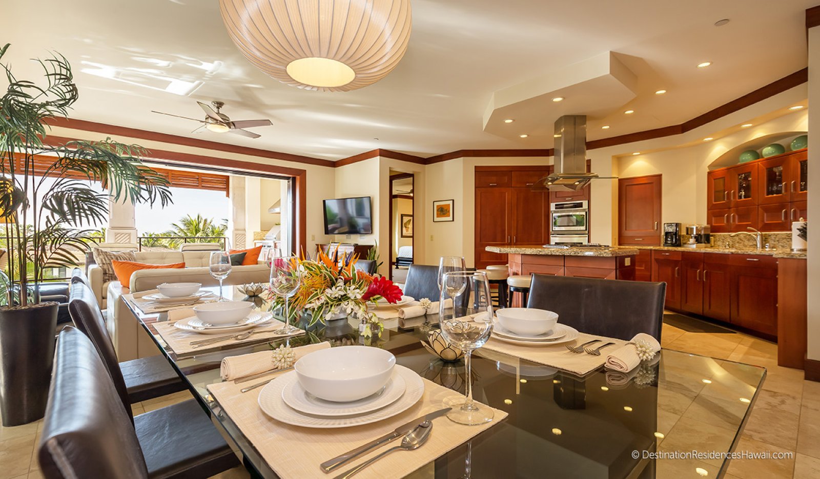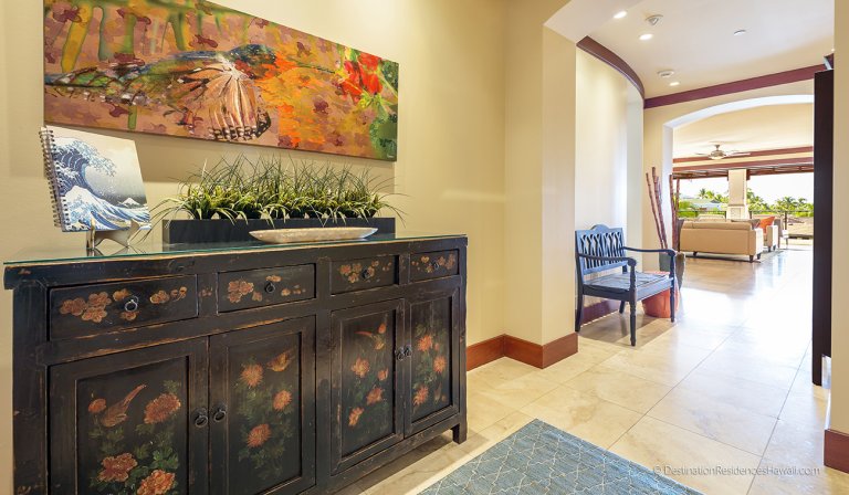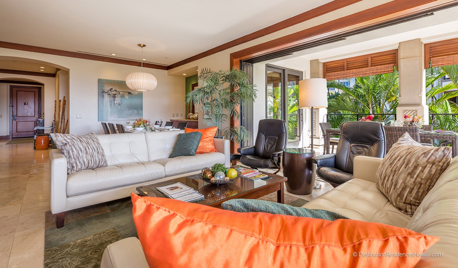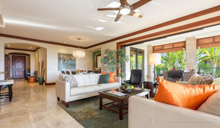 The main living area is open, airy, and designed to connect seamlessly with the outdoors. Large glass doors open to a private lanai, allowing warm breezes and garden views to become part of the interior experience. Comfortable furnishings in earth-inspired tones are complemented by subtle pops of color that reflect the surrounding landscape.
