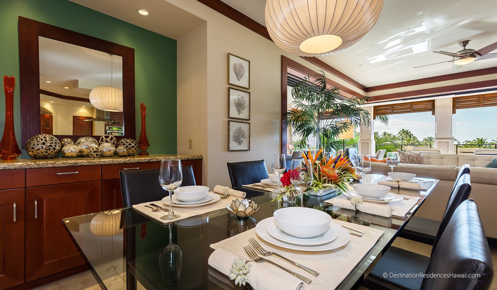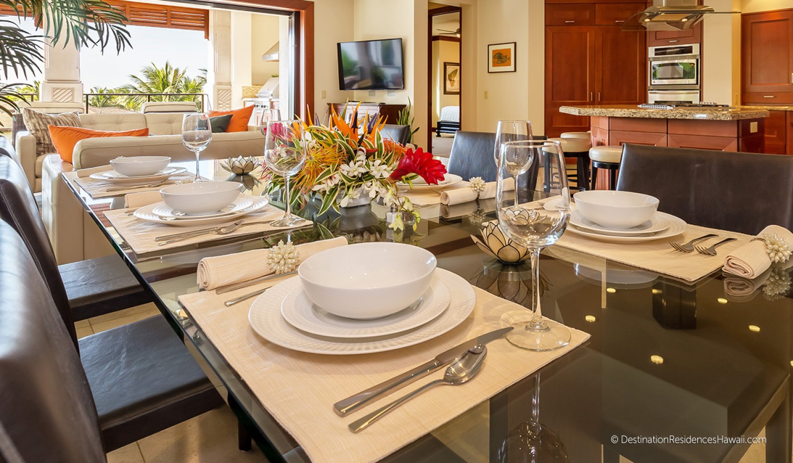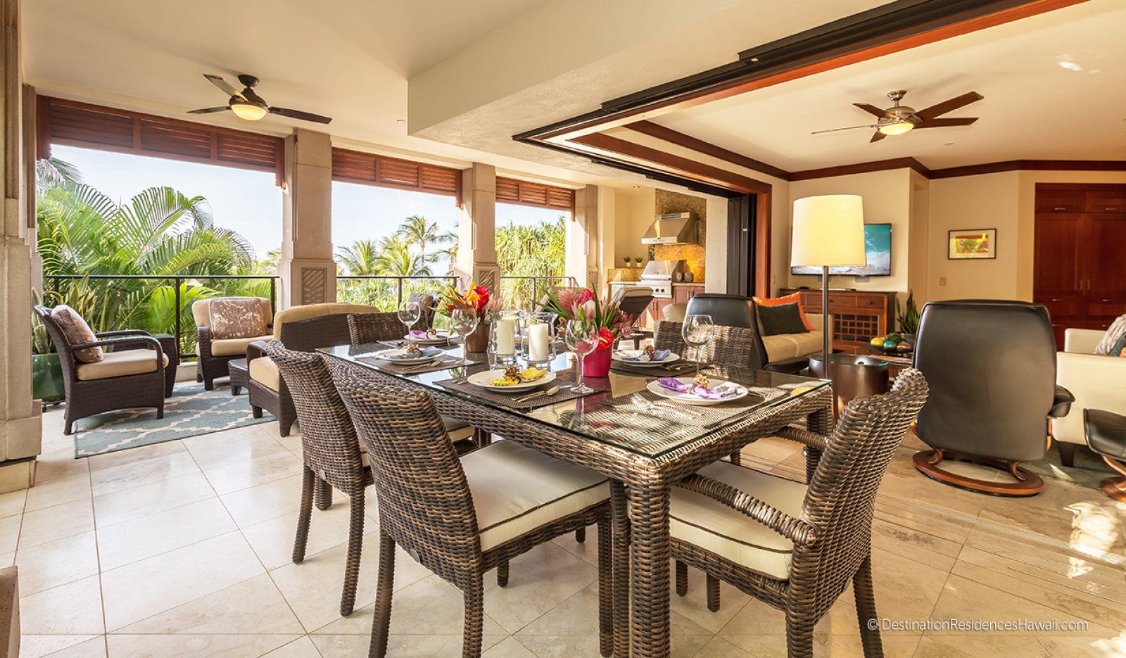 The main living area is open, airy, and designed to connect seamlessly with the outdoors. Large glass doors open to a private lanai, allowing warm breezes and garden views to become part of the interior experience. Comfortable furnishings in earth-inspired tones are complemented by subtle pops of color that reflect the surrounding landscape.