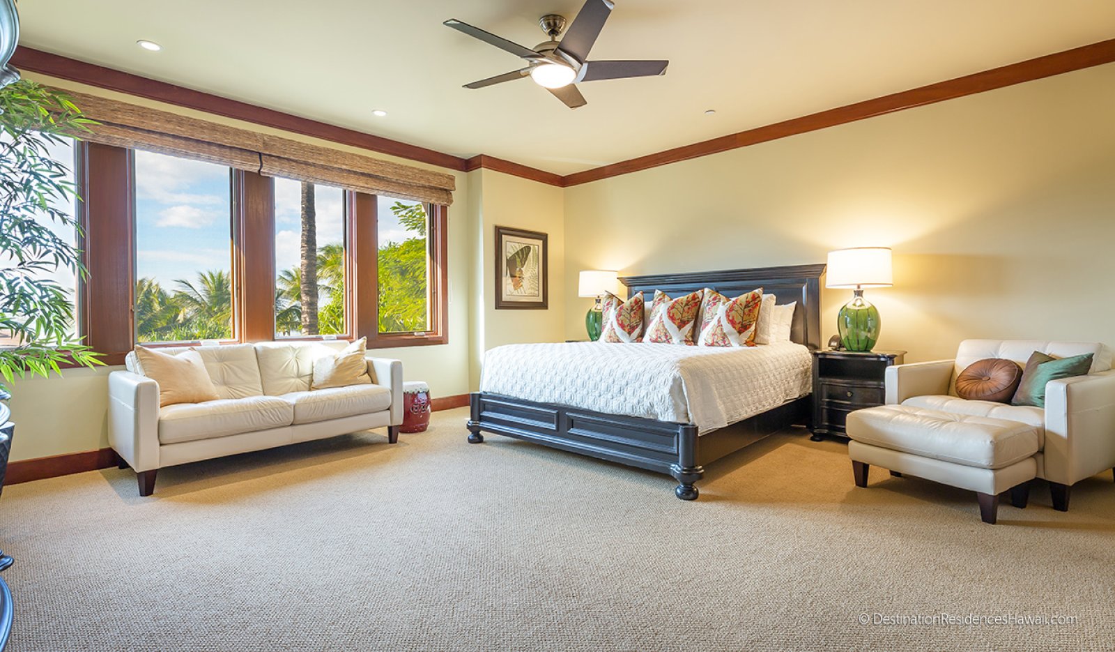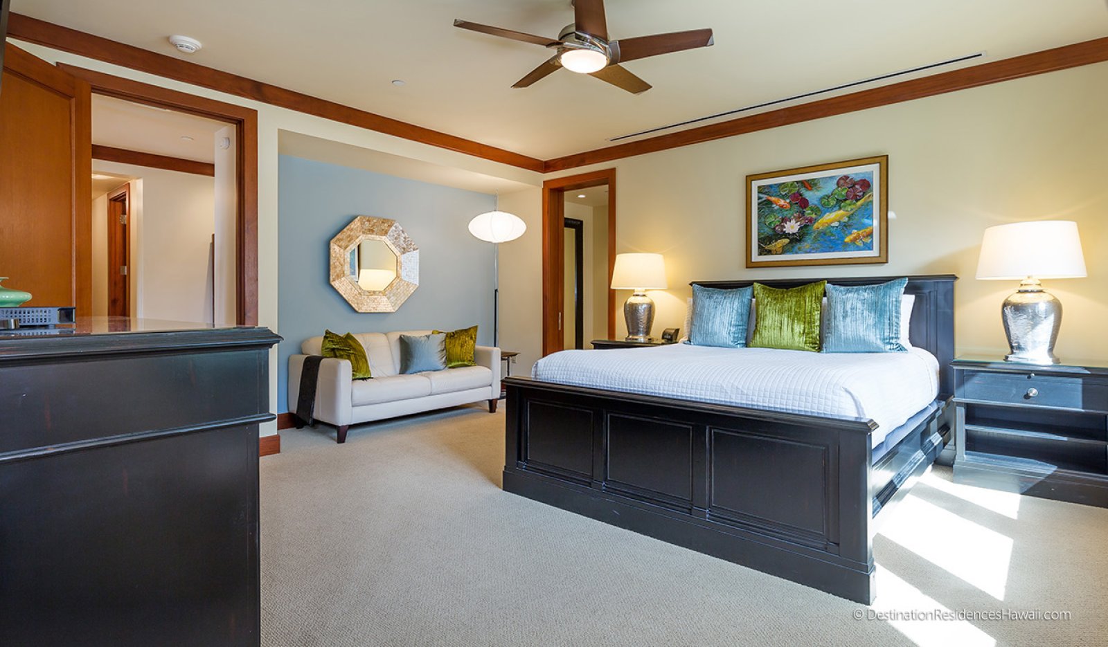 Bed: King Bed • En-Suite Bath with Shower and Bathtub • Flat-Screen TV • Desk • Sofa • Ceiling Fan