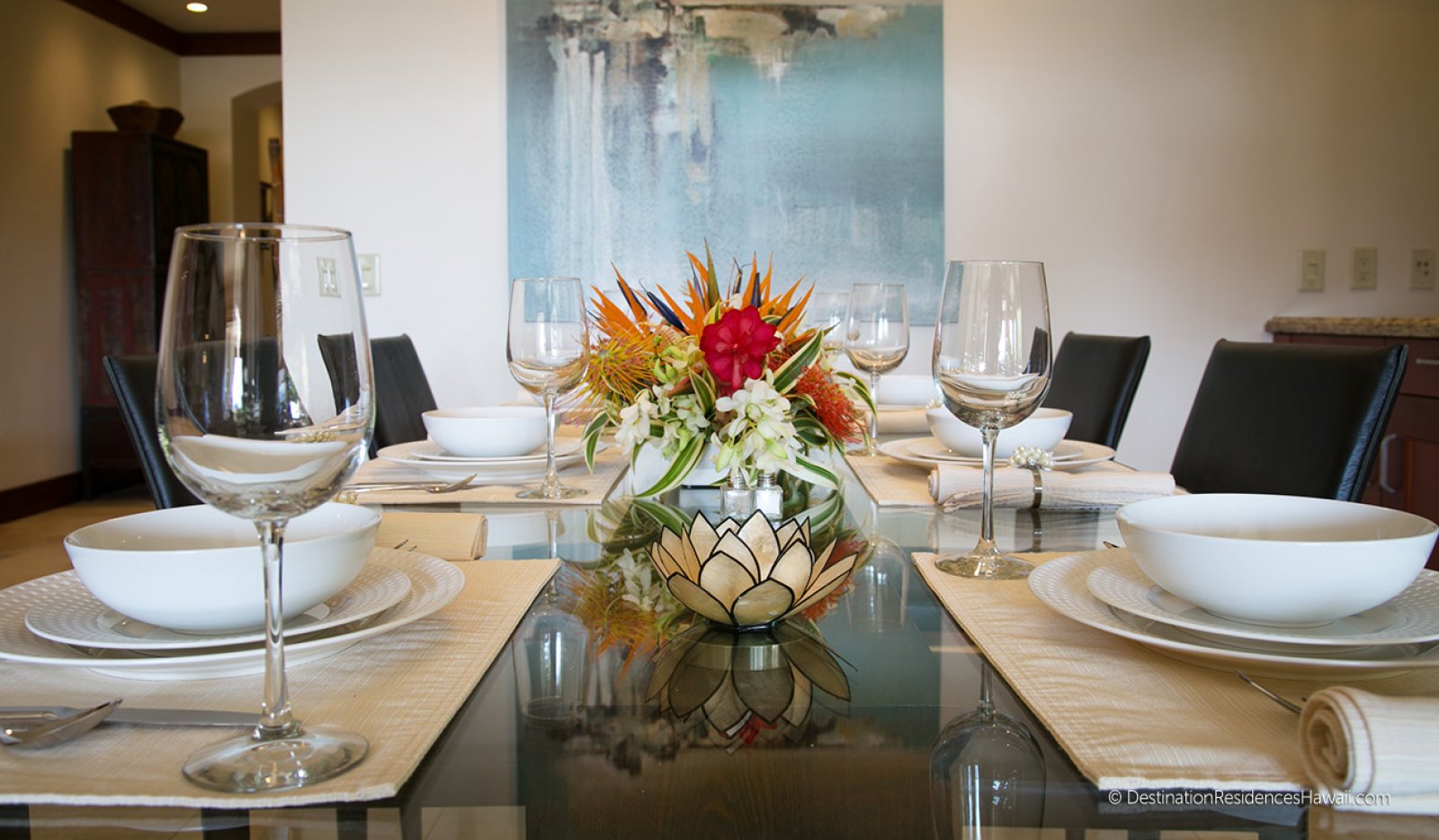 The fully equipped kitchen is designed for flexibility and ease, whether preparing light meals or arranging a private chef experience. Features include a built-in Sub-Zero refrigerator, gas range, convection oven, microwave, dishwasher, and a full suite of cookware and serving essentials.