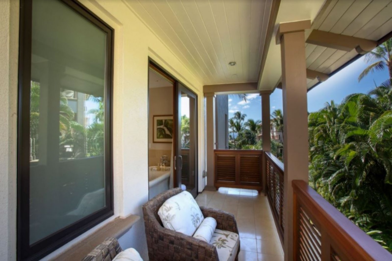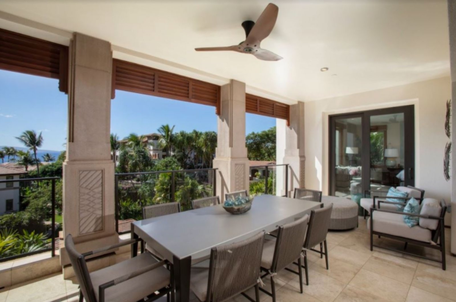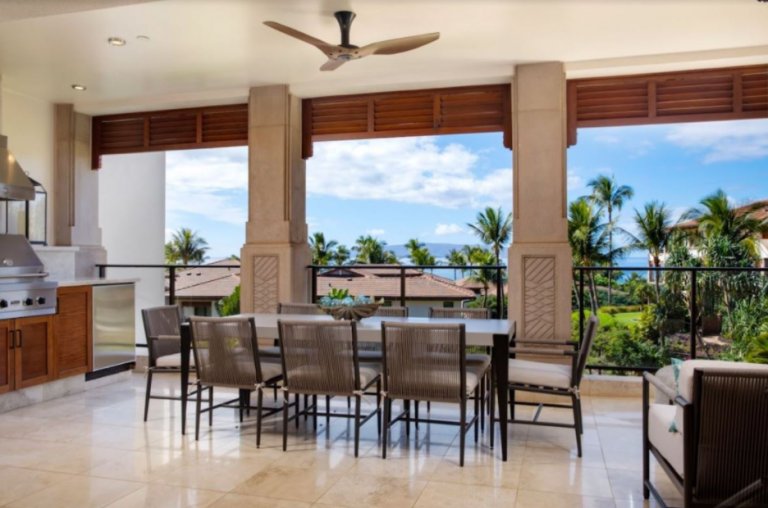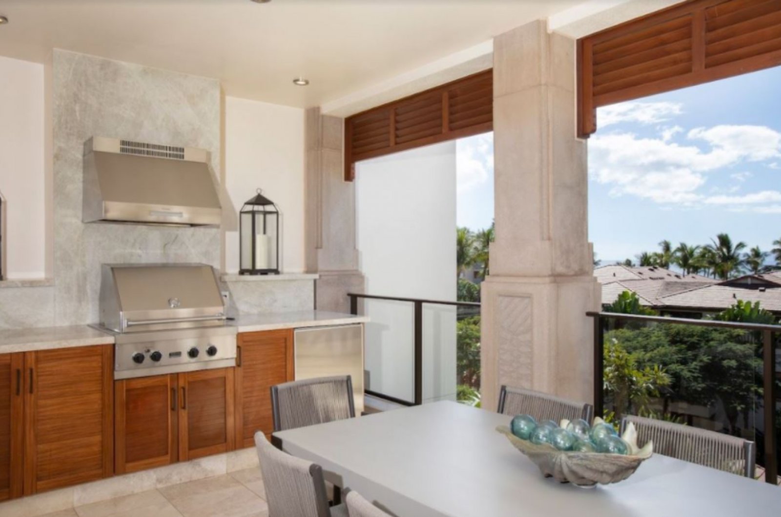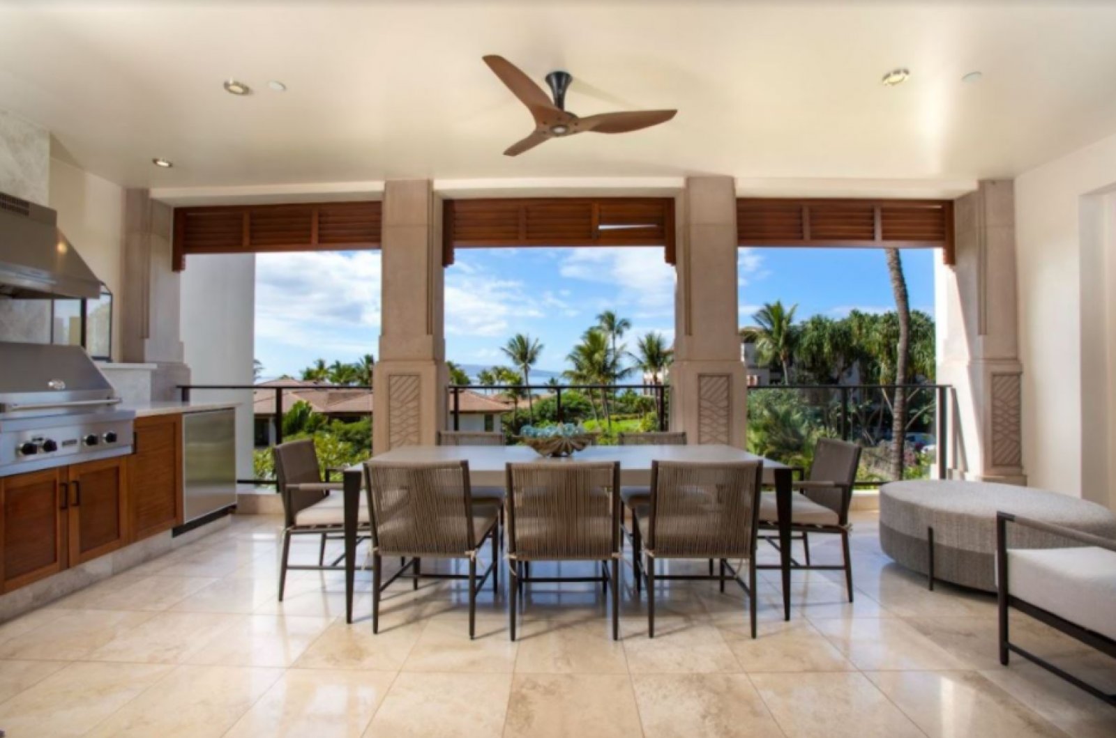 In addition to the indoor dining space, a 619 square foot outdoor lanai allows for al fresco dining with a view of the Wailea coast. The veranda includes a six-person dining table and two oversized arm chairs along with a built-in barbecue grill and beverage refrigerator. The lanai is covered with a roof and ceiling fan so that you can enjoy relaxing outdoors at your Hawaiian vacation rental at any time of day, rain or shine.
