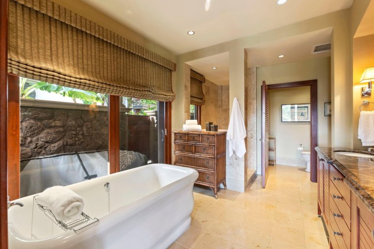Natural stone travertine floors, warm metallic accents, and soft jungle-inspired tones create an environment that encourages guests to slow down and fully embrace the rhythm of Maui. Gentle water features in the private garden provide a soothing soundtrack throughout the day.
