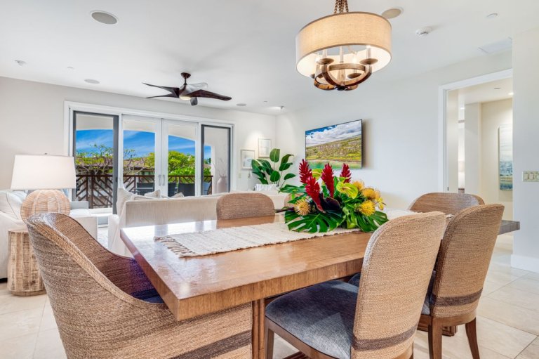 The expansive great room serves as the heart of the penthouse, offering a seamless blend of living and dining areas framed by large sliding doors that open to the lanai. Natural light fills the space throughout the day, creating a relaxed yet polished atmosphere for gathering, entertaining, or unwinding after a day at the beach.