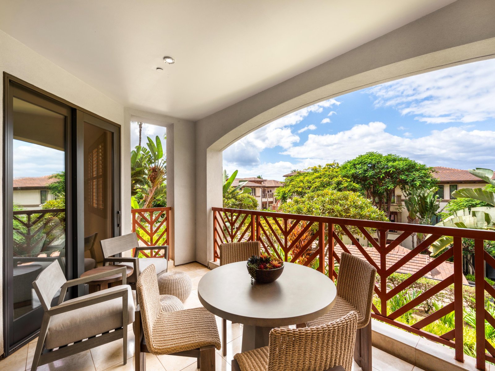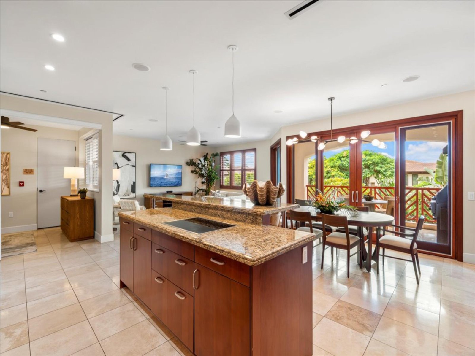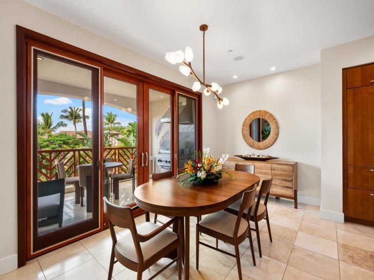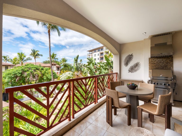 The spacious private lanai extends the living area outdoors and is surrounded by tropical greenery for added seclusion. Outfitted with seating for six and a Viking gas grill, the lanai is ideal for outdoor dining, morning coffee, or sunset gatherings in a relaxed island setting.
