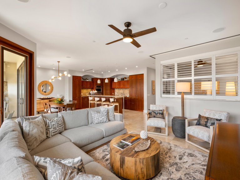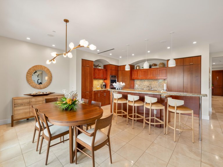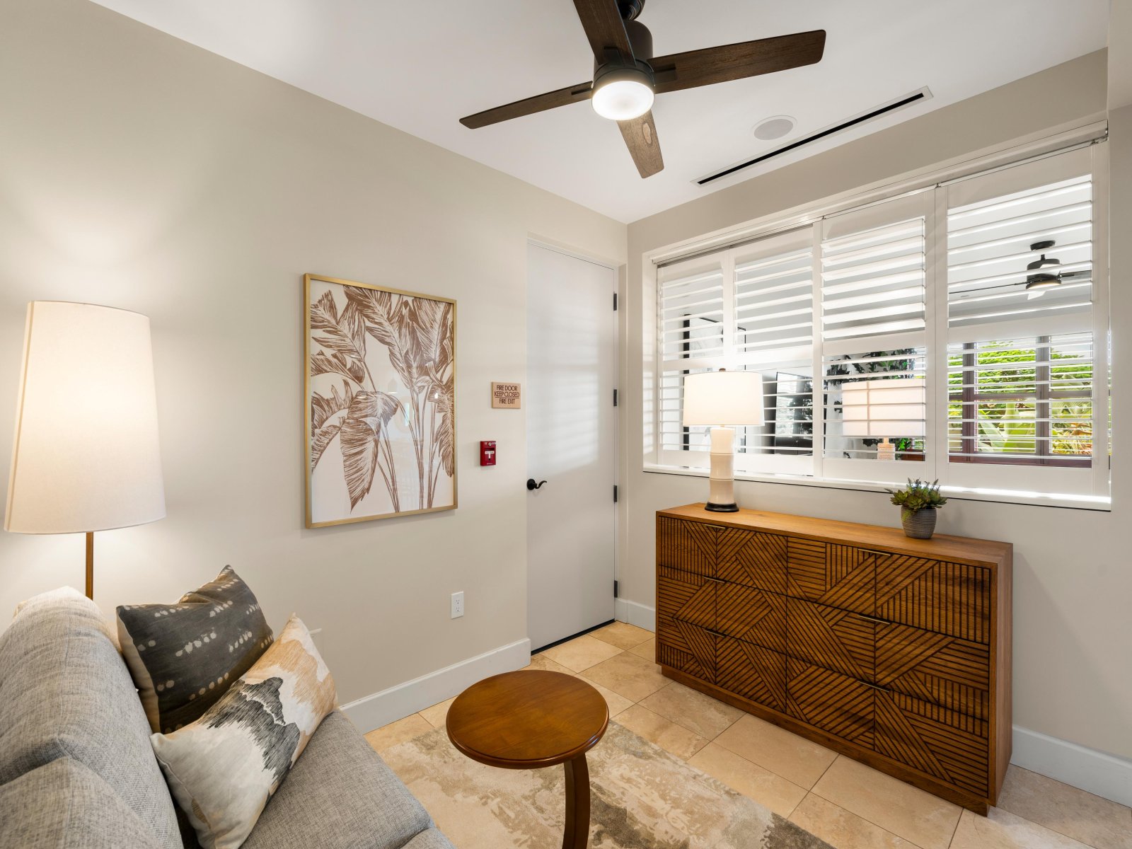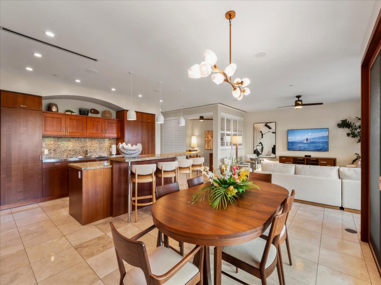 The open-concept living and dining areas are thoughtfully designed for relaxation and connection. Contemporary furnishings and updated décor create an inviting atmosphere, with generous seating and easy access to the outdoor lanai. The space flows naturally, making it well suited for quiet evenings or casual entertaining after a day in the sun.