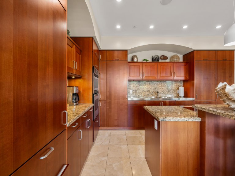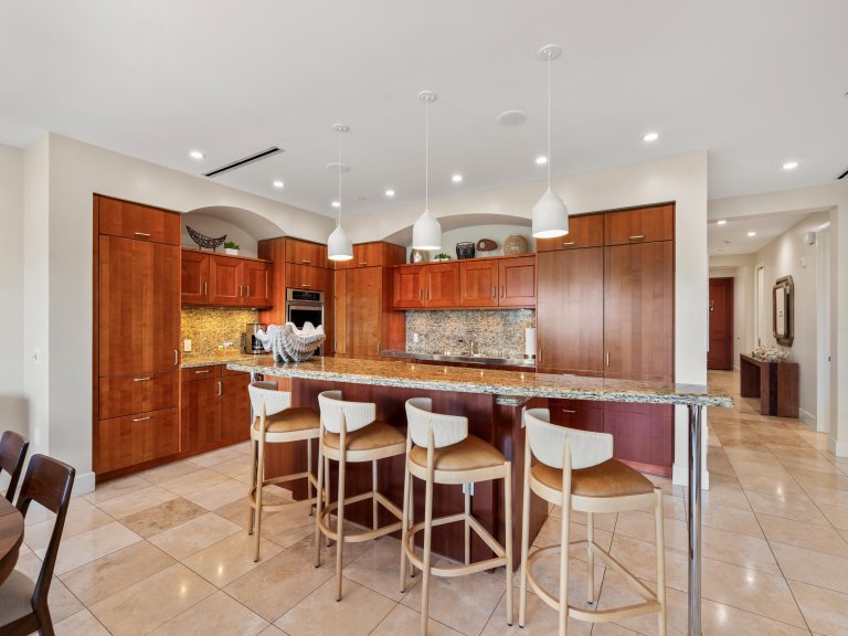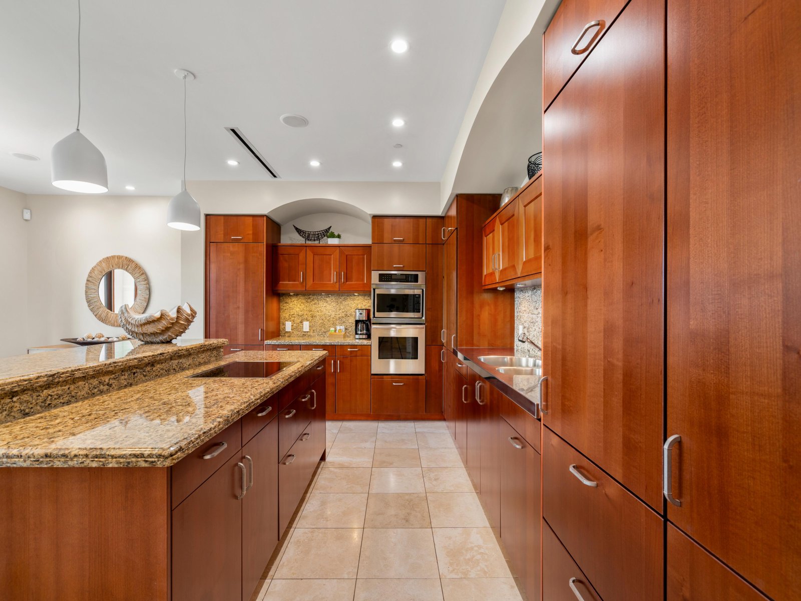 The gourmet kitchen is designed for both form and function, featuring granite countertops, rich mahogany cabinetry, and premium stainless steel appliances, including a range, oven, microwave, refrigerator, and dishwasher. Bar seating offers a casual dining option, while ample counter space allows for effortless meal preparation. A Nespresso machine adds a refined touch for morning coffee or afternoon breaks.