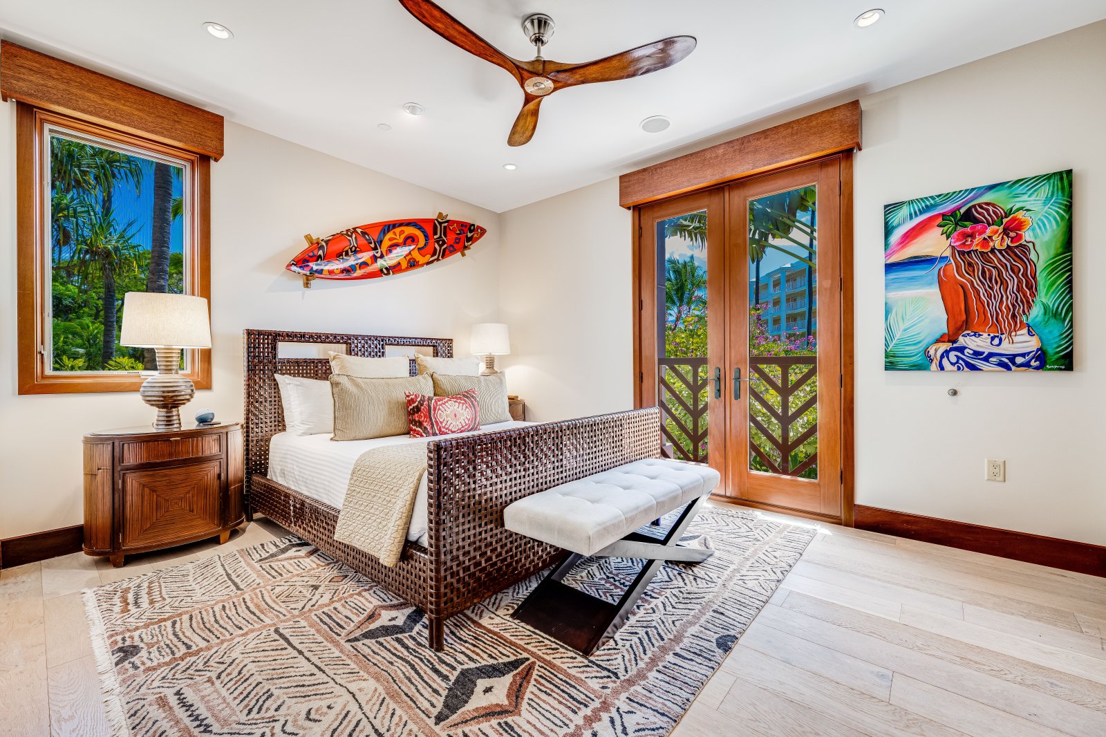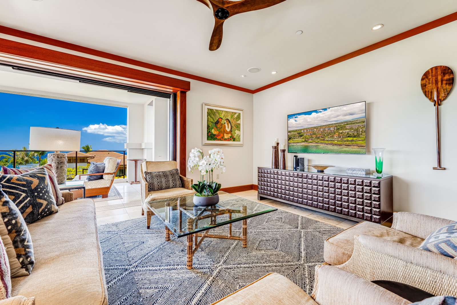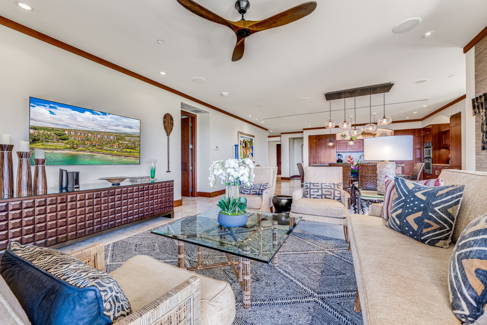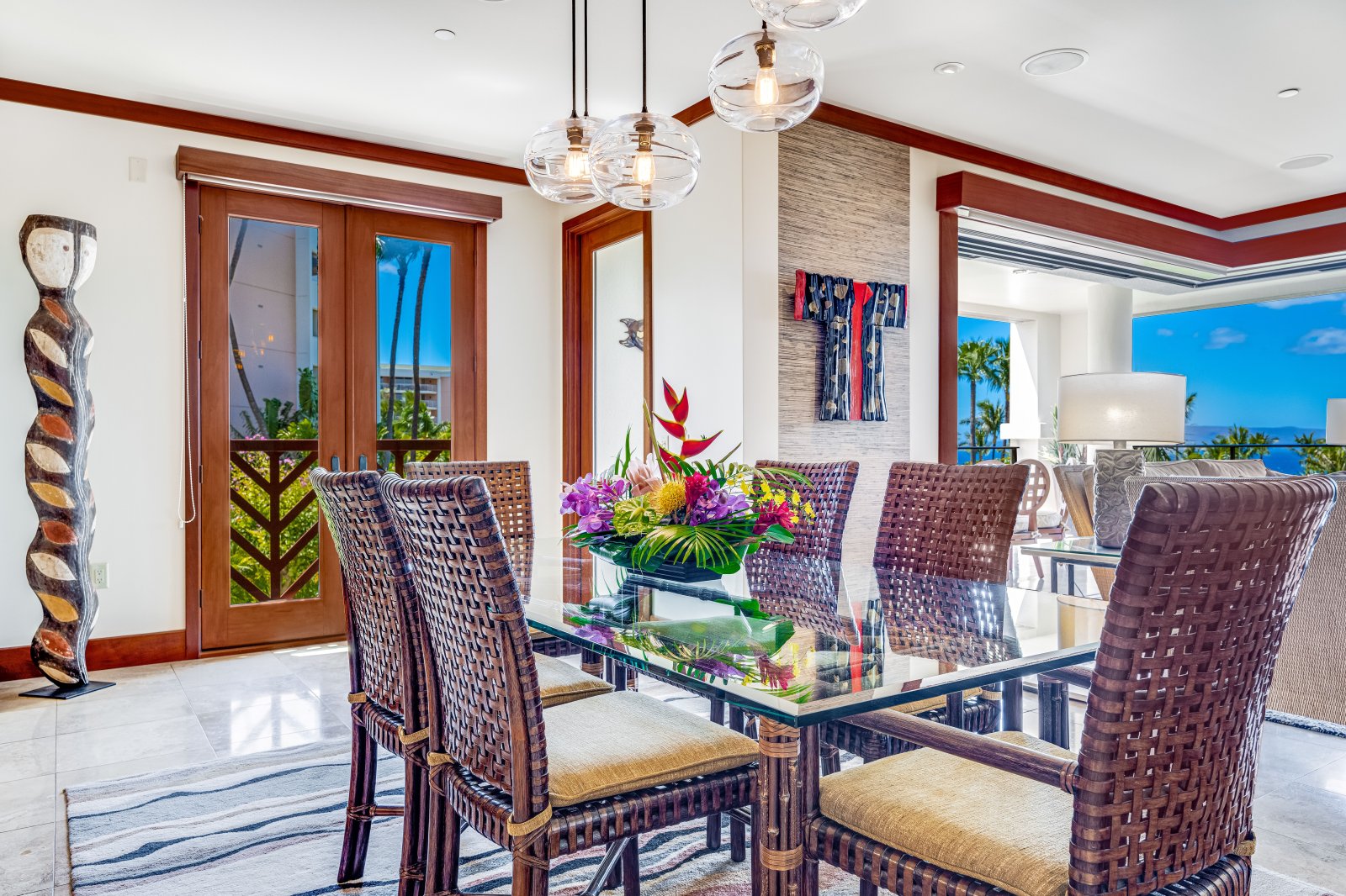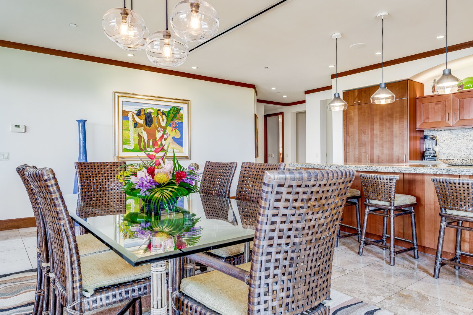 The expansive great room is the central gathering space and features a seamless flow between the living room, dining area, and gourmet kitchen. Warm, contemporary finishes and original Hawaiian artwork set a refined yet welcoming tone. Gather with friends for games or movie nights and enjoy the premium Sonos surround sound system for a true at-home entertainment experience.