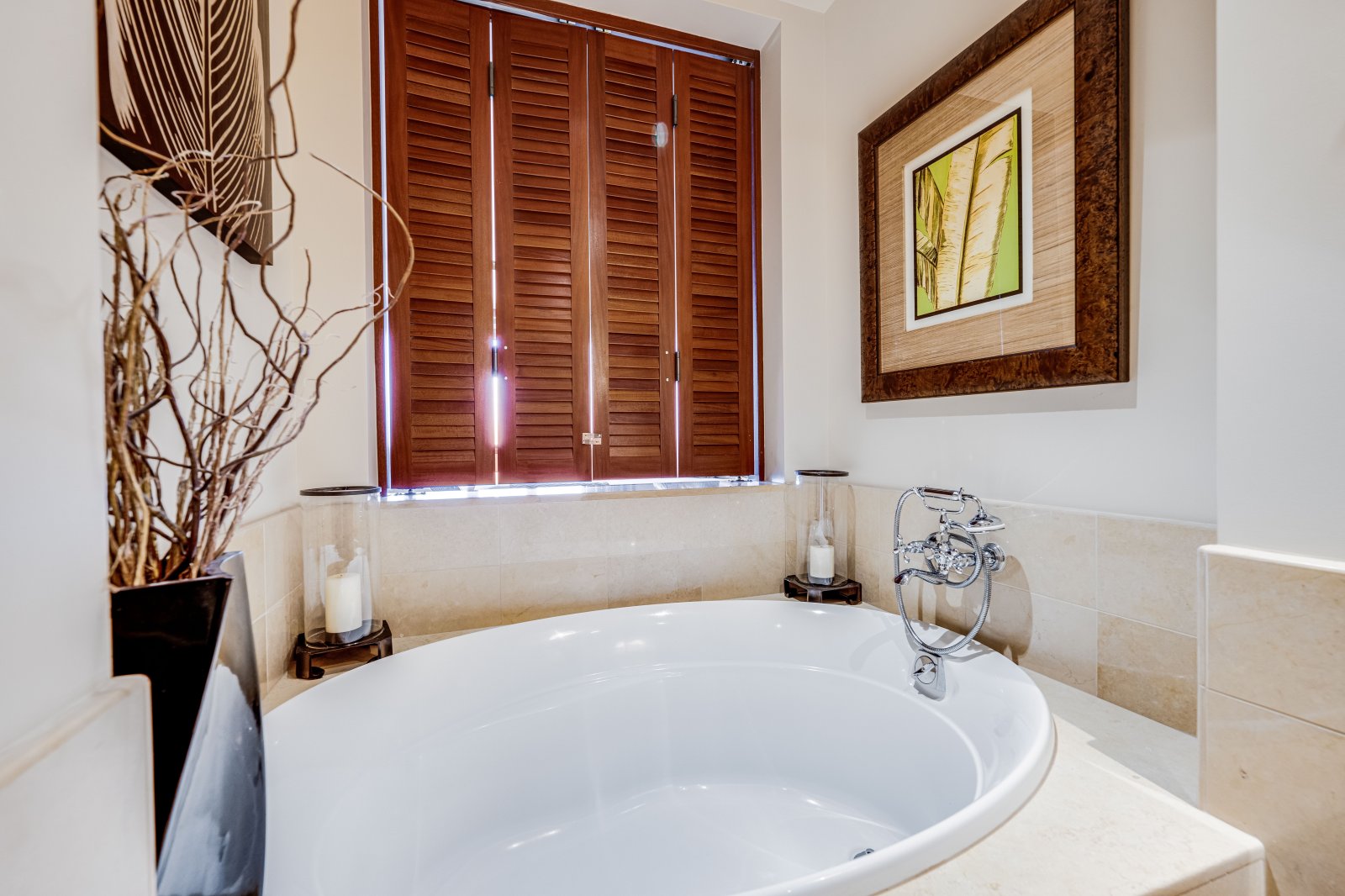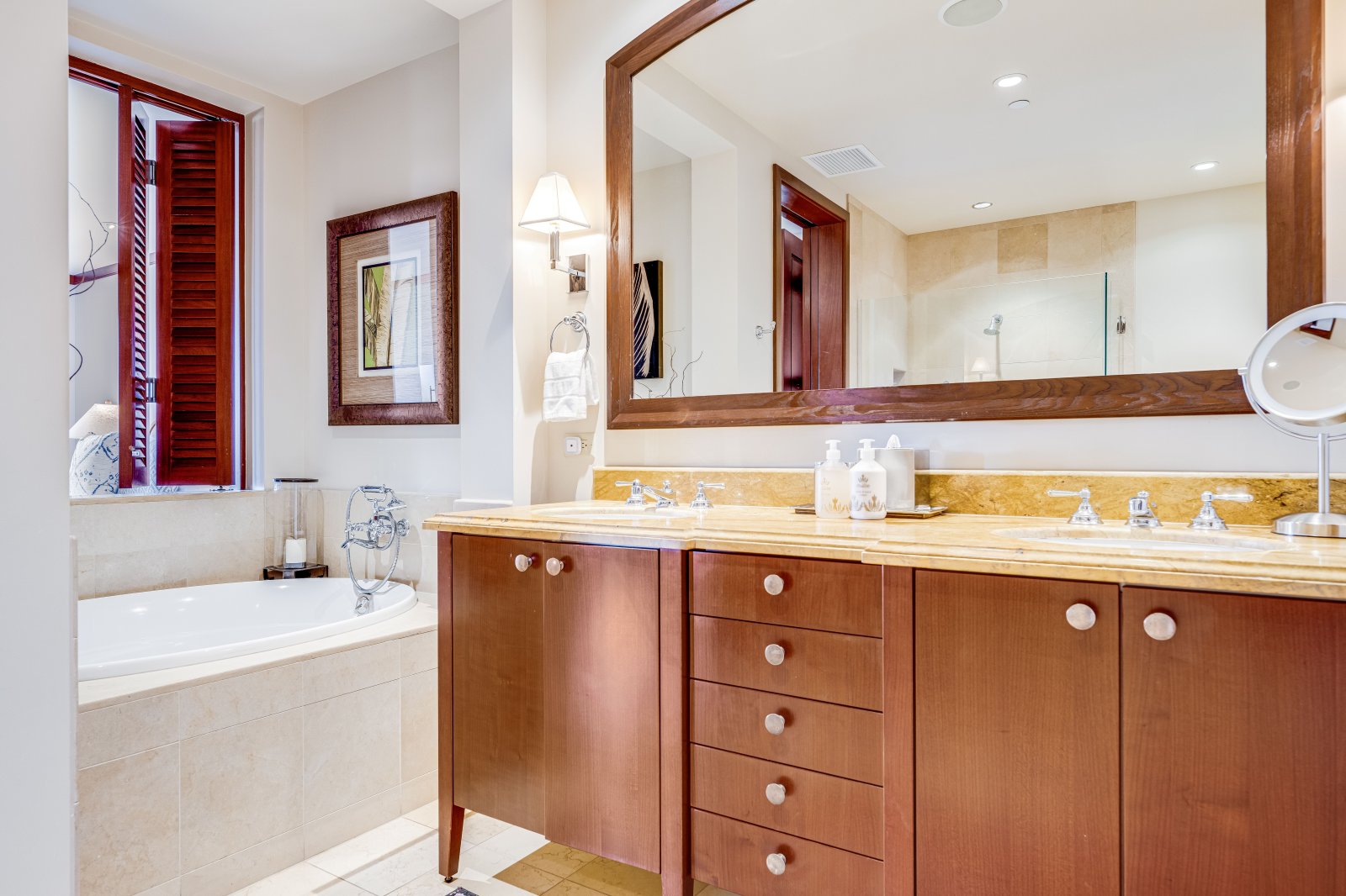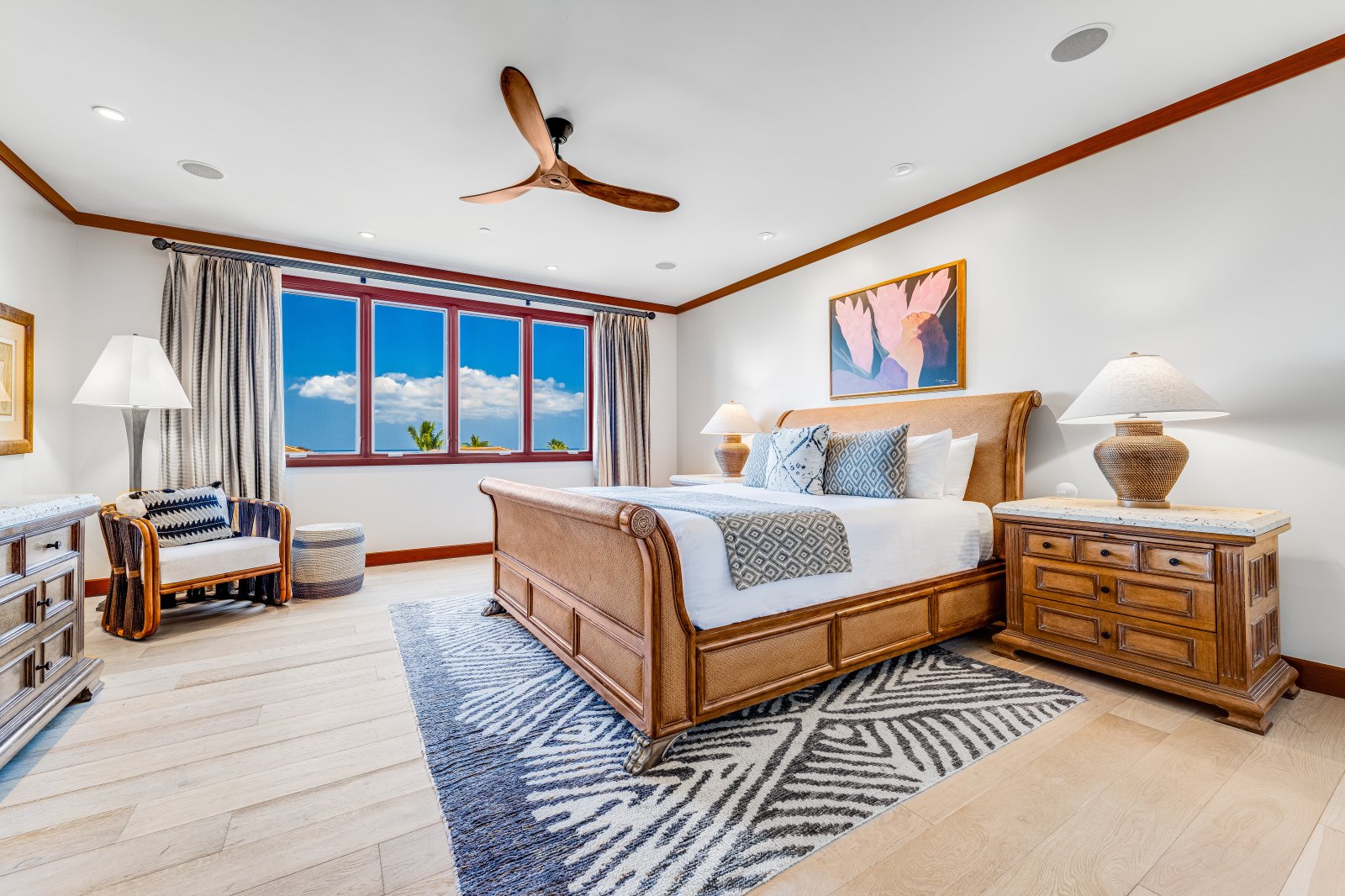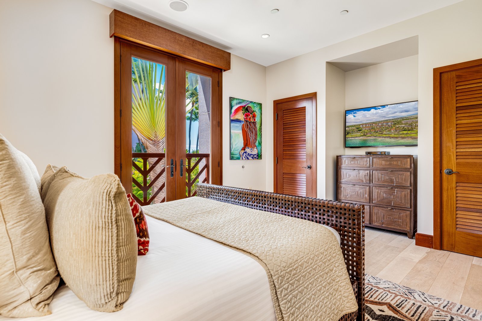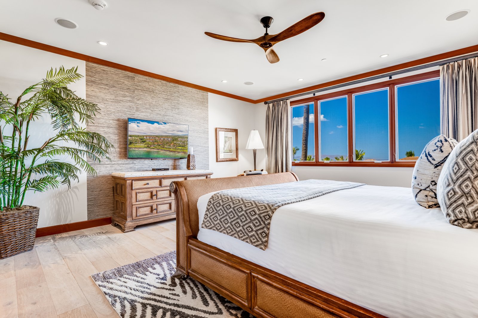 The luxurious primary suite offers a king bed, large flat-screen TV, and a spa-style ensuite bathroom with a soaking tub, dual vanity, and shower. The suite provides a serene retreat after a day exploring the island.