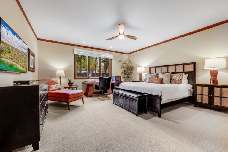 Bed: King Bed • En-Suite Bath with Walk-In Shower and Bathtub • Flat-Screen, High Definition TV • Walk-In Closet • Safe • Ceiling Fan