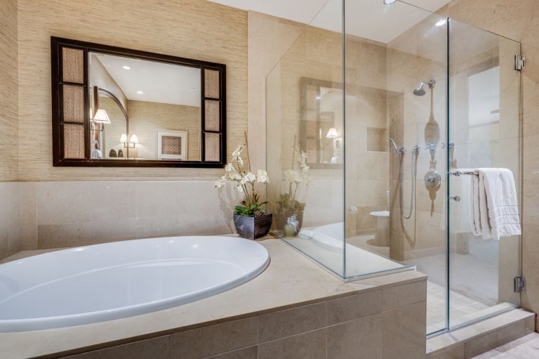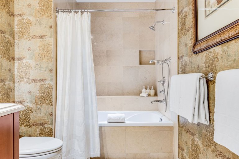 The master bedroom is a luxurious retreat featuring a king bed and an en-suite bathroom with a soaking tub, glass-enclosed seated shower, dual granite vanity, private water closet, and a spacious walk-in closet with an in-room safe.