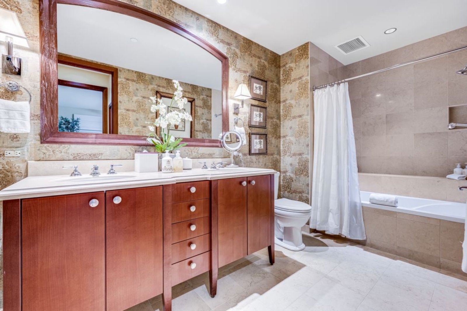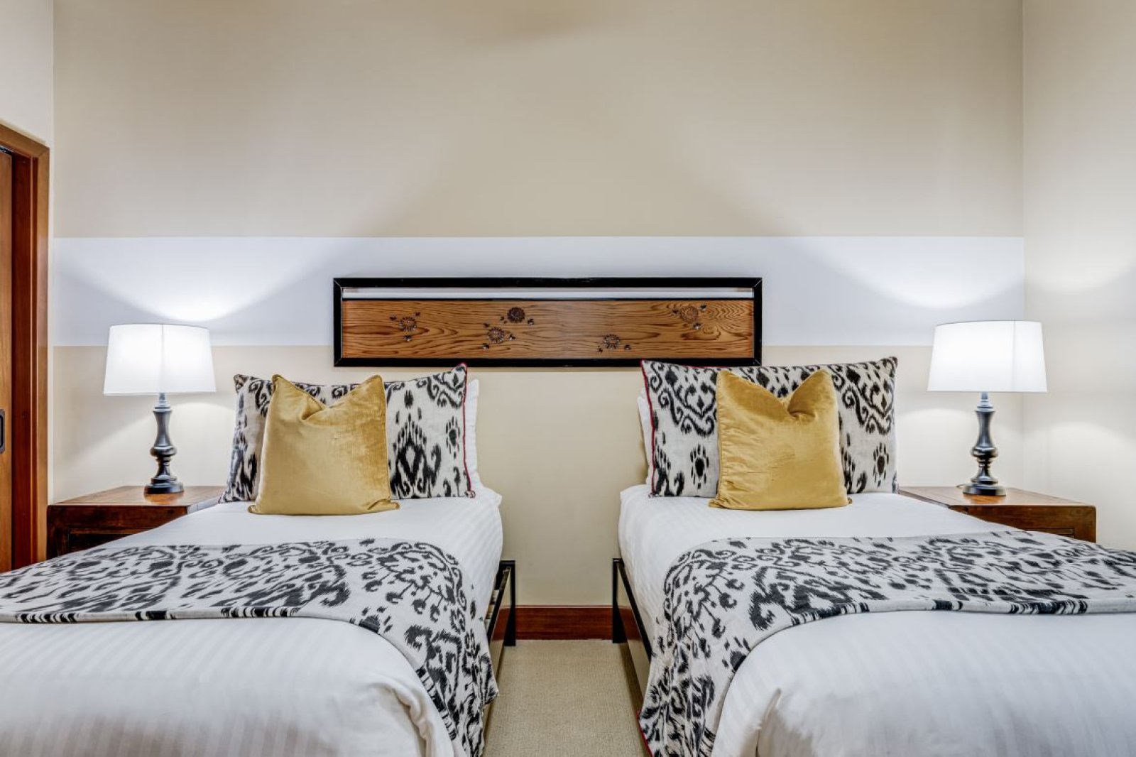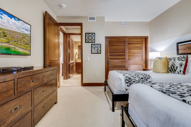 The guest bedroom includes two twin beds and access to a semi-private bathroom with a dual granite vanity, tub/shower combination, and private water closet. This bathroom also opens to the hallway for convenient common use.