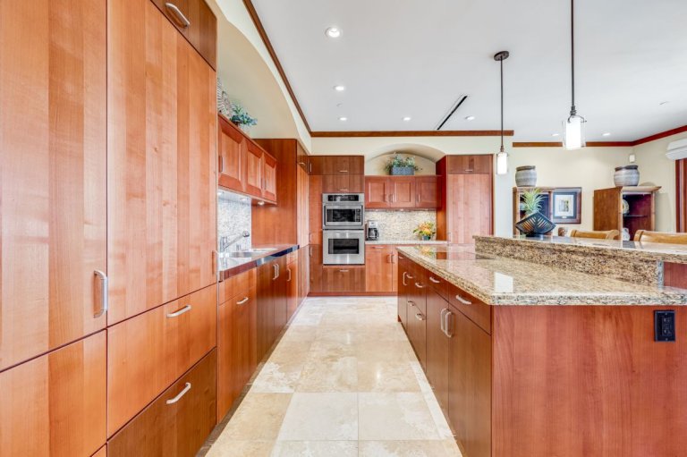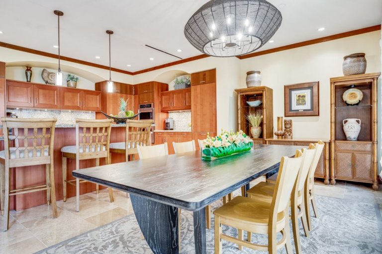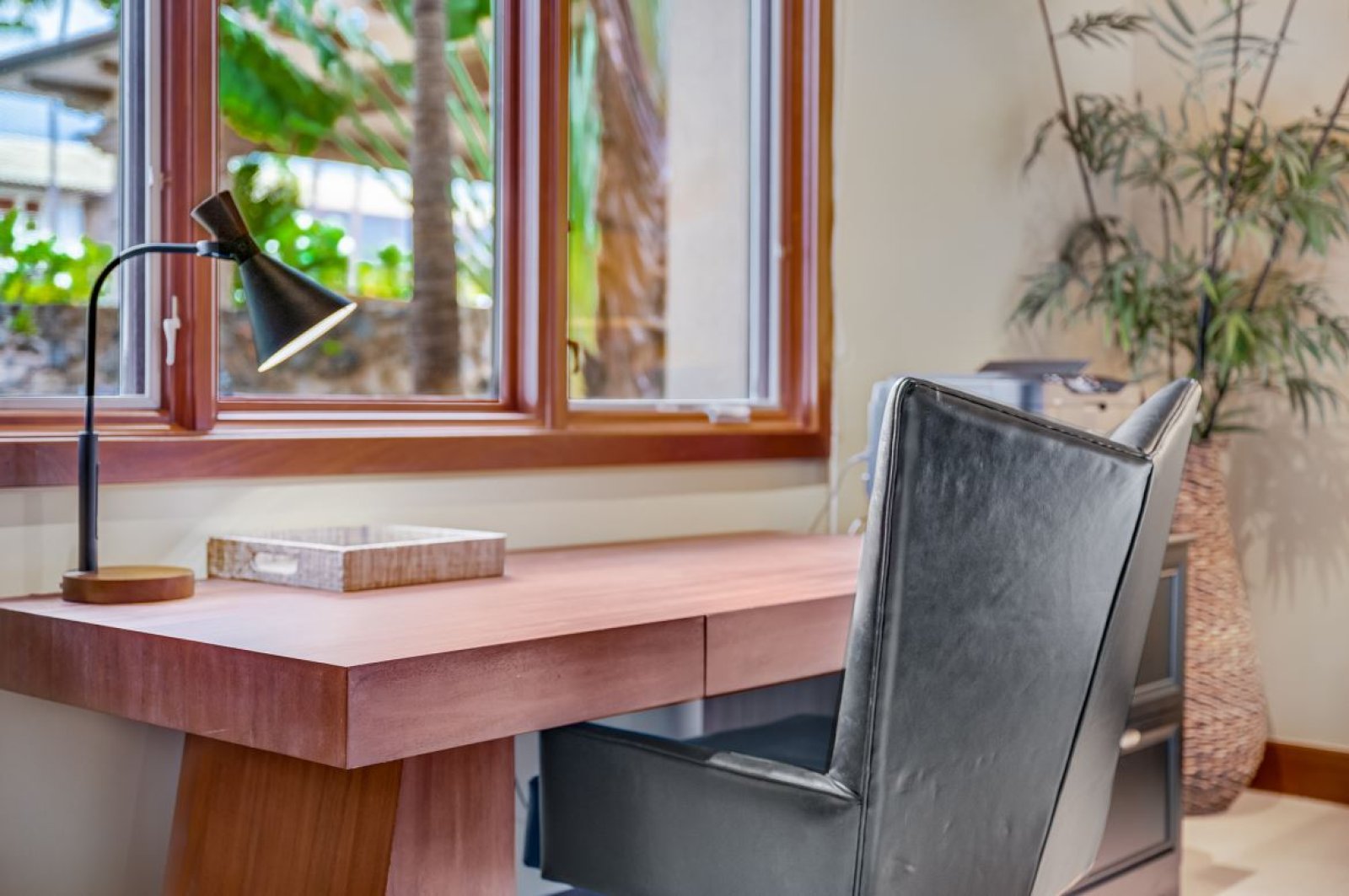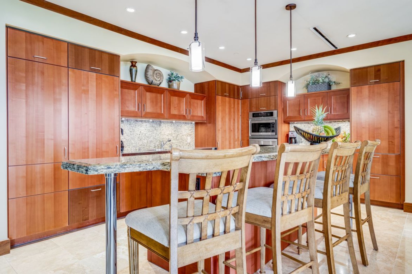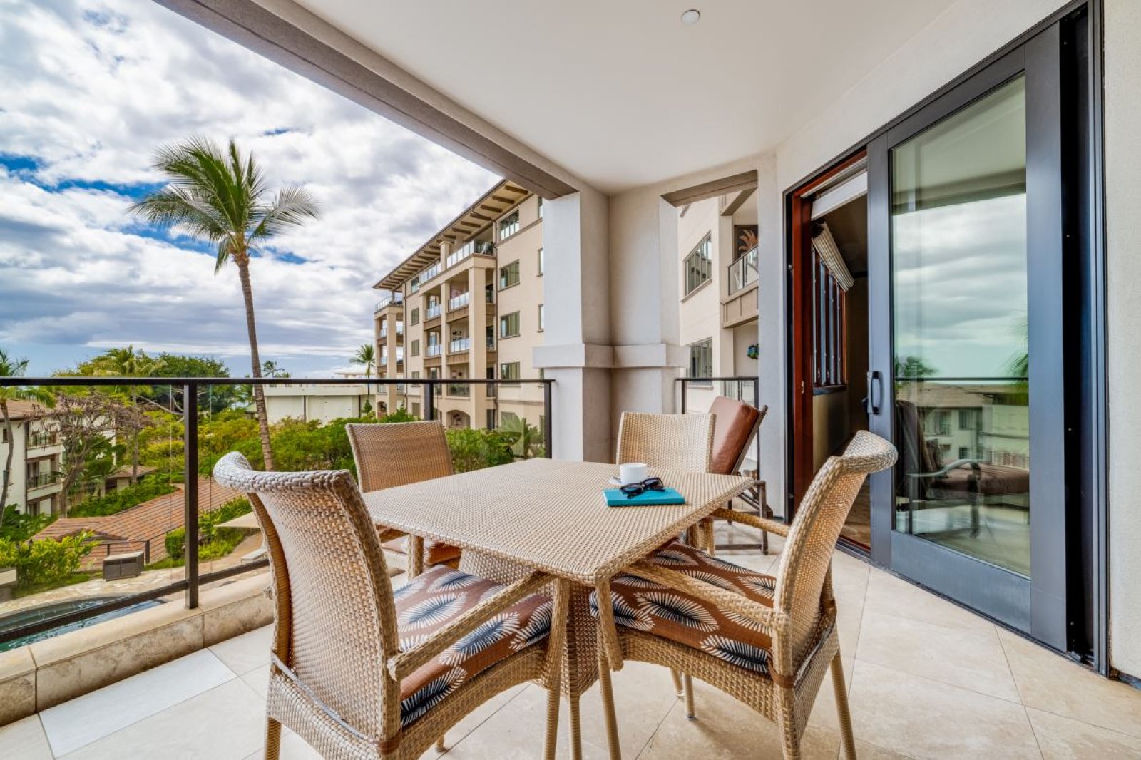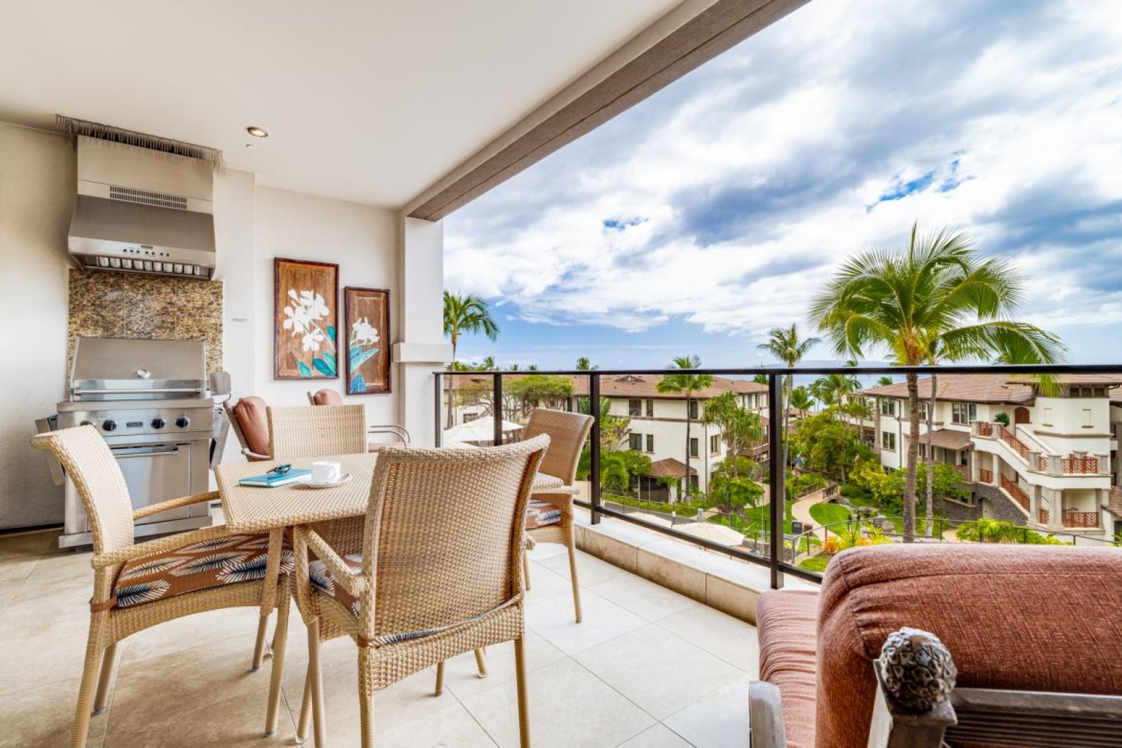 Step out onto the lanai to enjoy tropical breezes and partial ocean views. The lanai overlooks the family pool and the lush pathway that leads to Wailea Beach and the beachfront infinity pool. On warm evenings, tiki torches illuminate the pool area, creating a magical island atmosphere complemented by the gentle sound of a nearby waterfall. A built-in Viking barbecue grill makes outdoor dining effortless and enjoyable.
